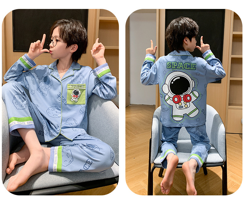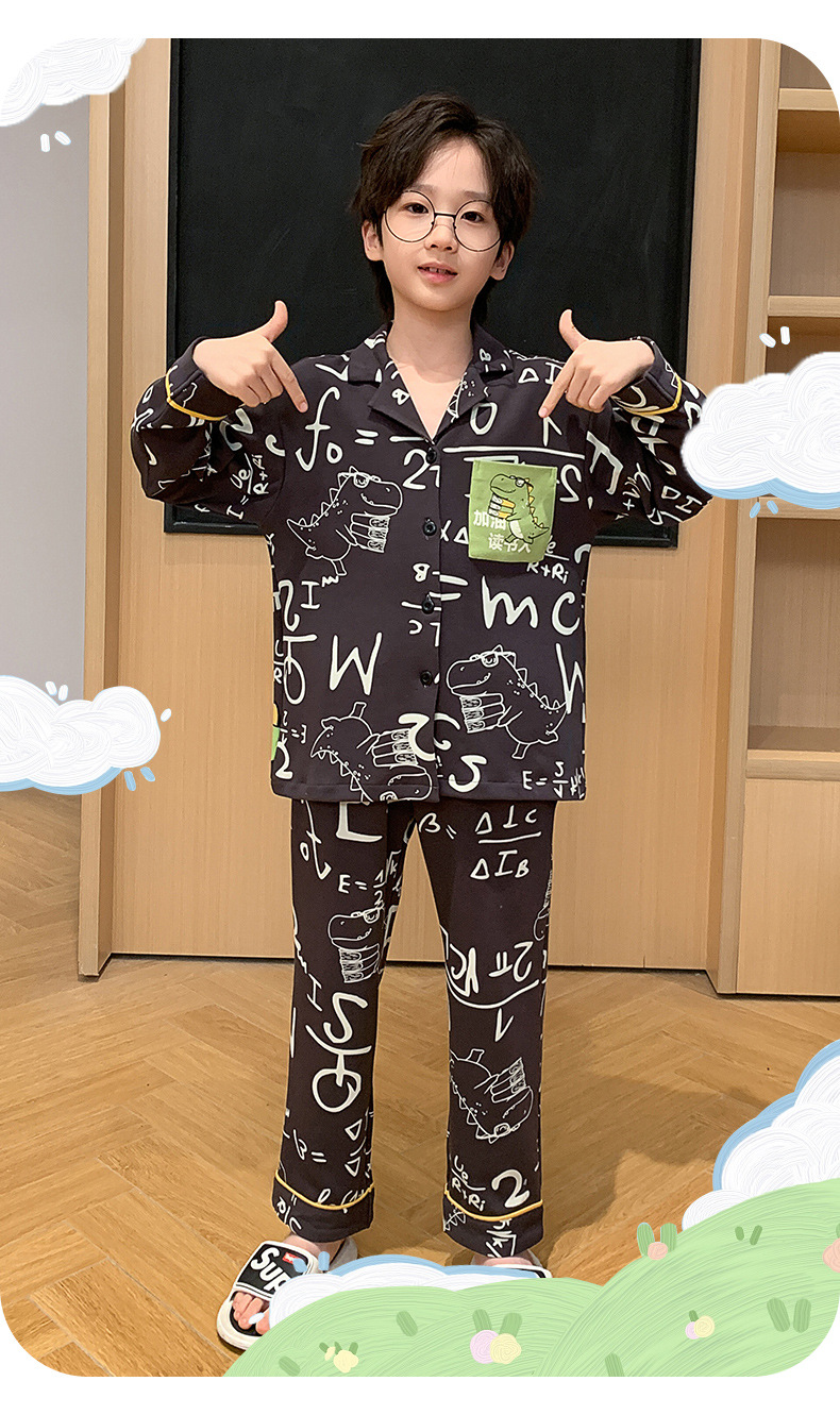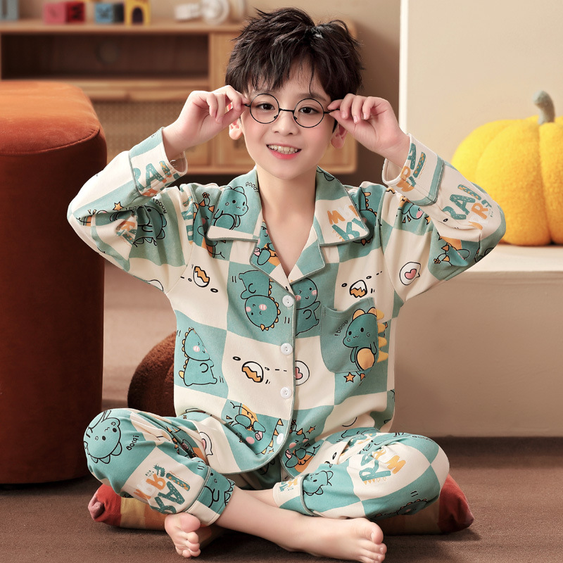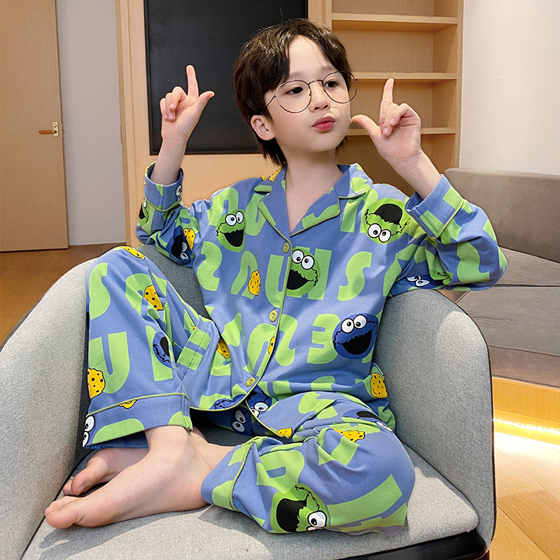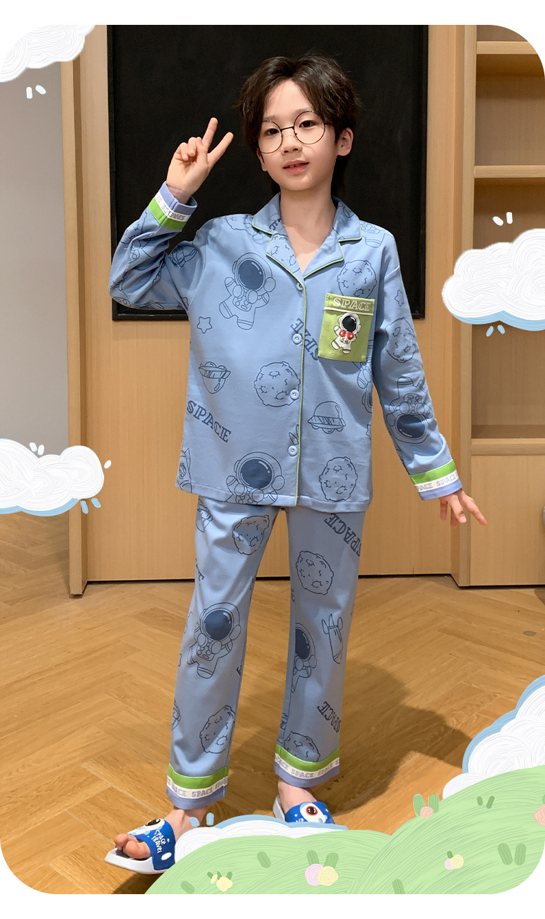 봄 및 가을 대외 무역을위한 소년 잠옷 순면 긴 소매 얇은 세트 소년 중 큰 어린이 만화 아기 홈 의류 트렌디스토어 가기