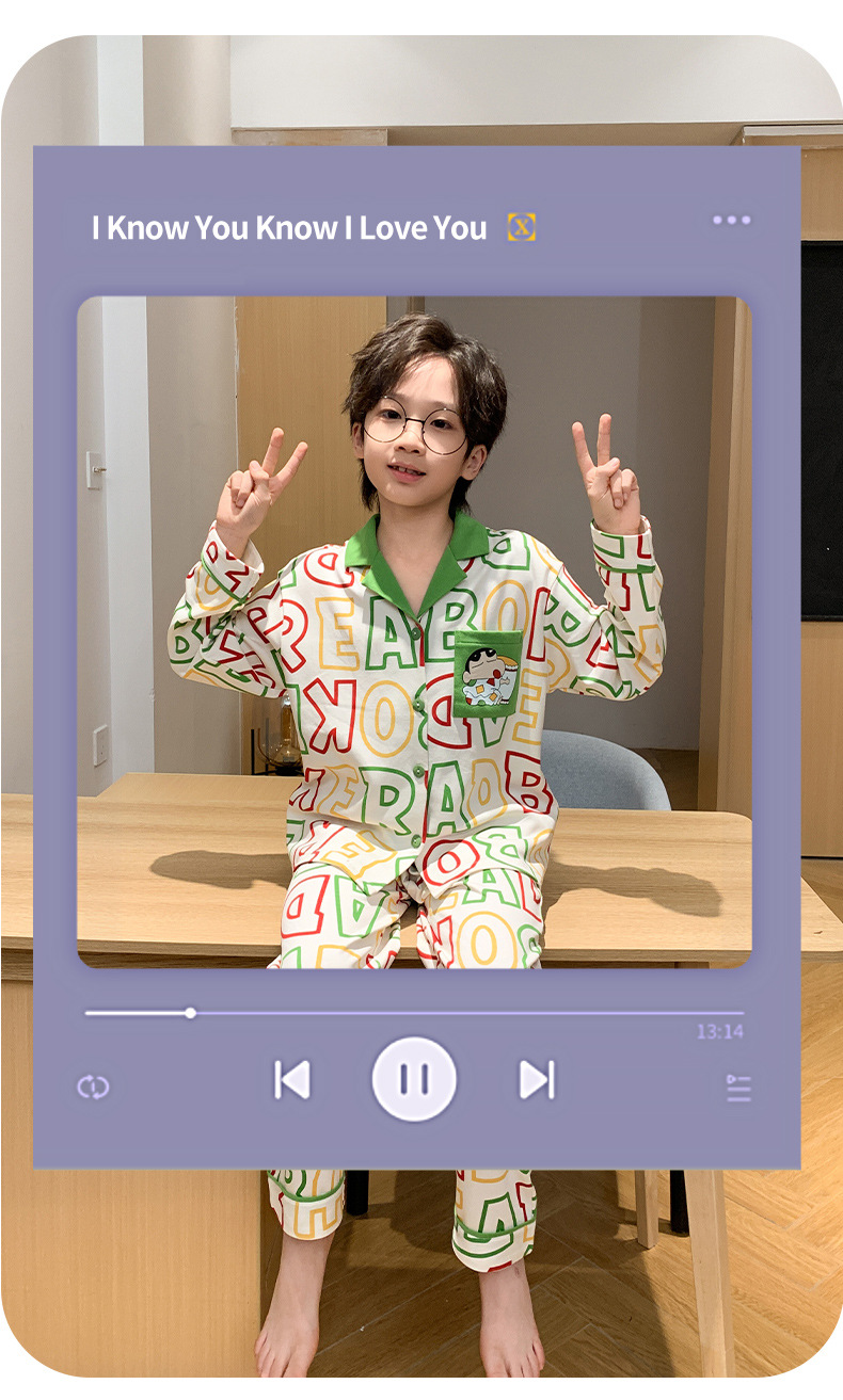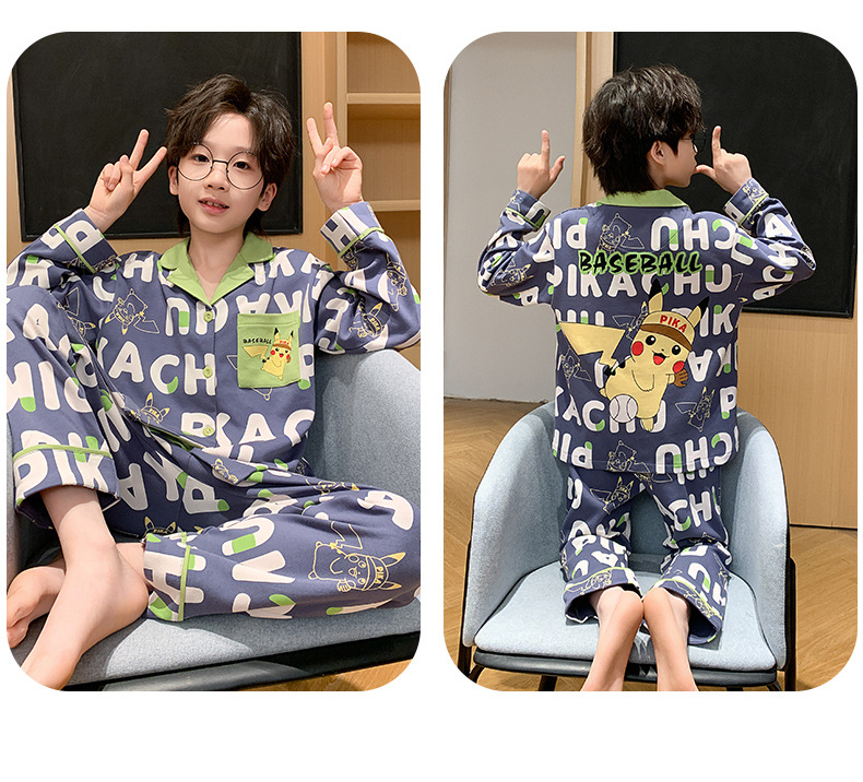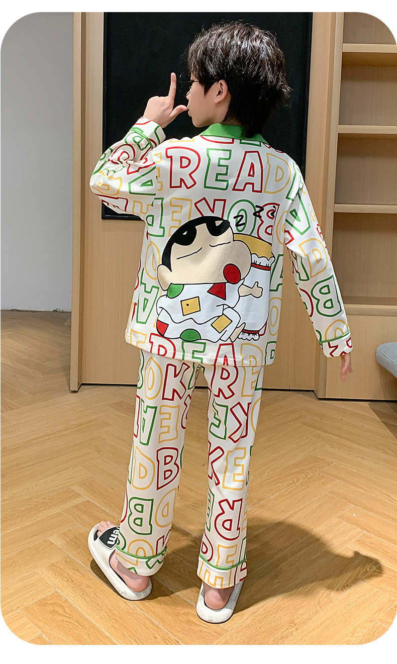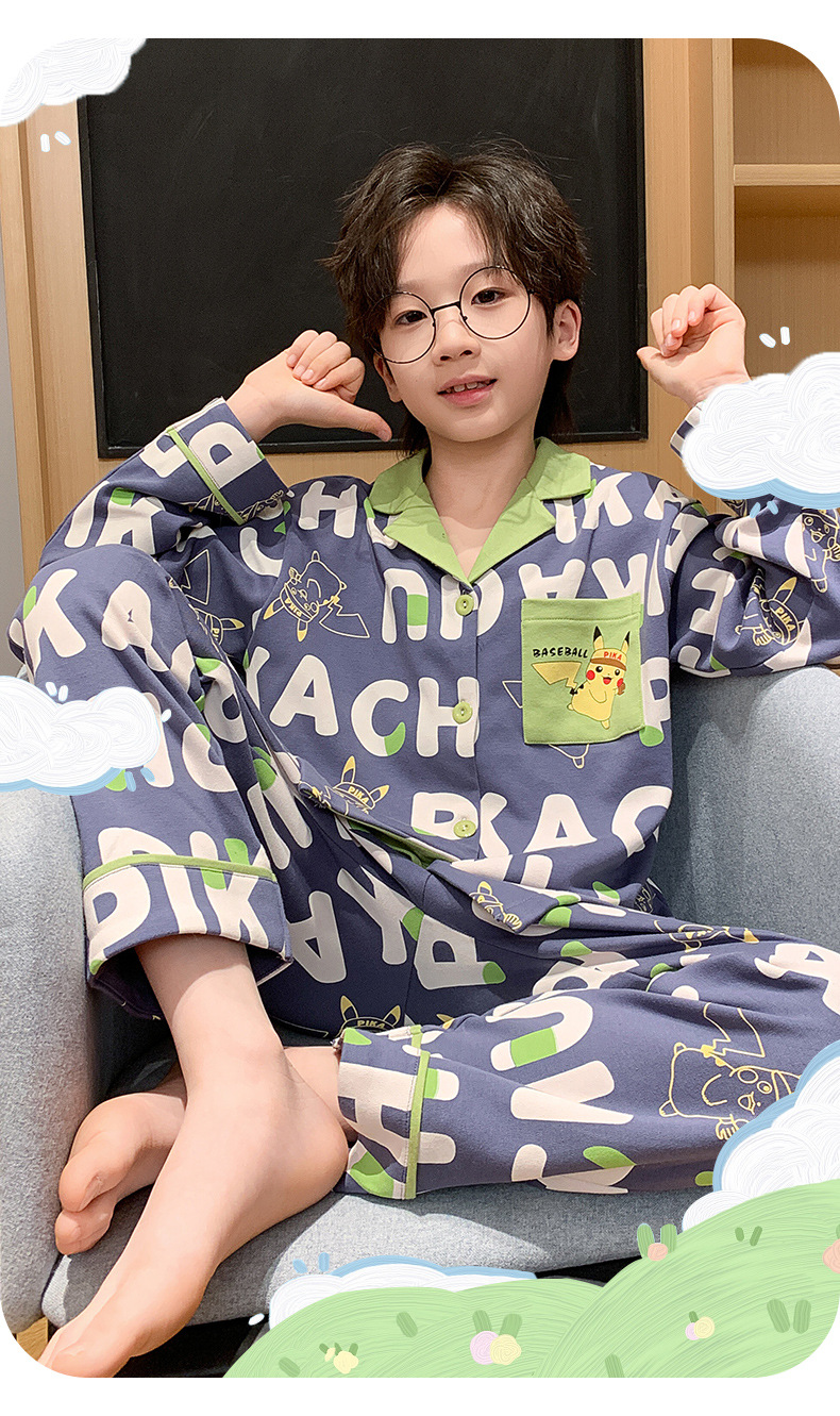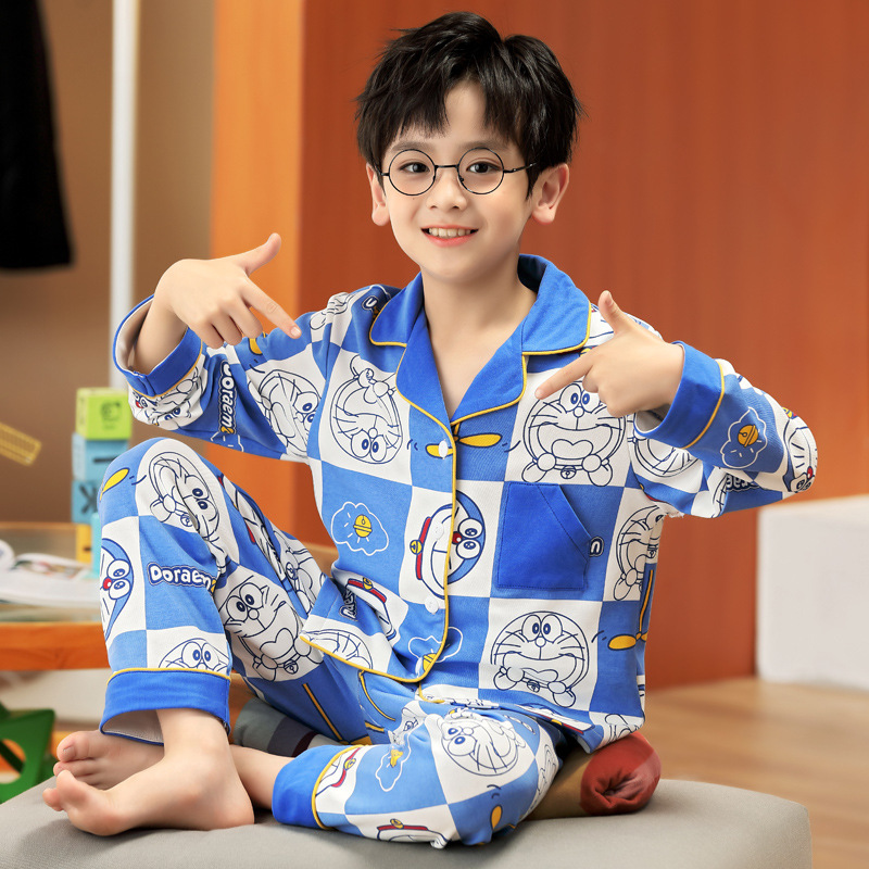 봄 및 가을 대외 무역을위한 소년 잠옷 순면 긴 소매 얇은 세트 소년 중 큰 어린이 만화 아기 홈 의류 트렌디스토어 가기