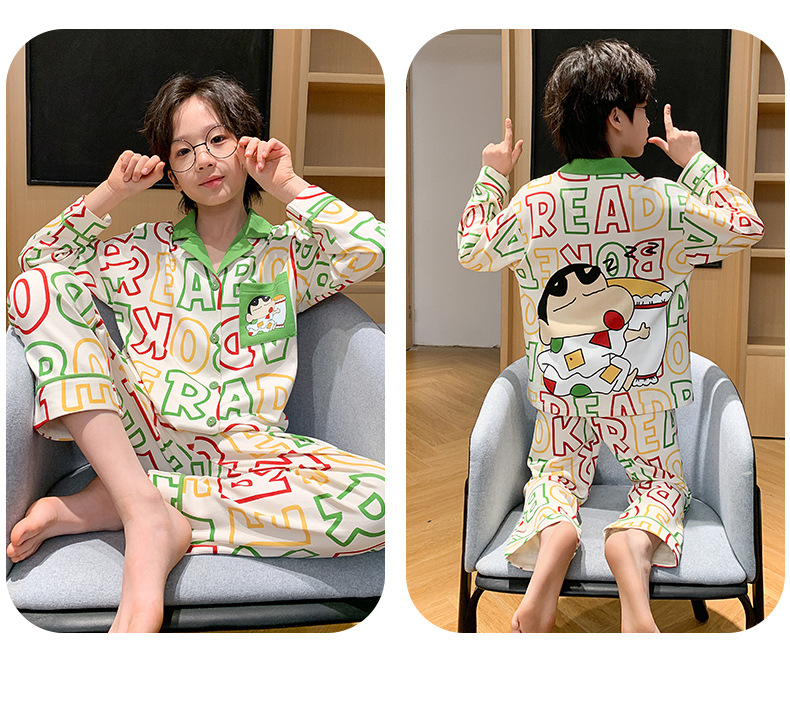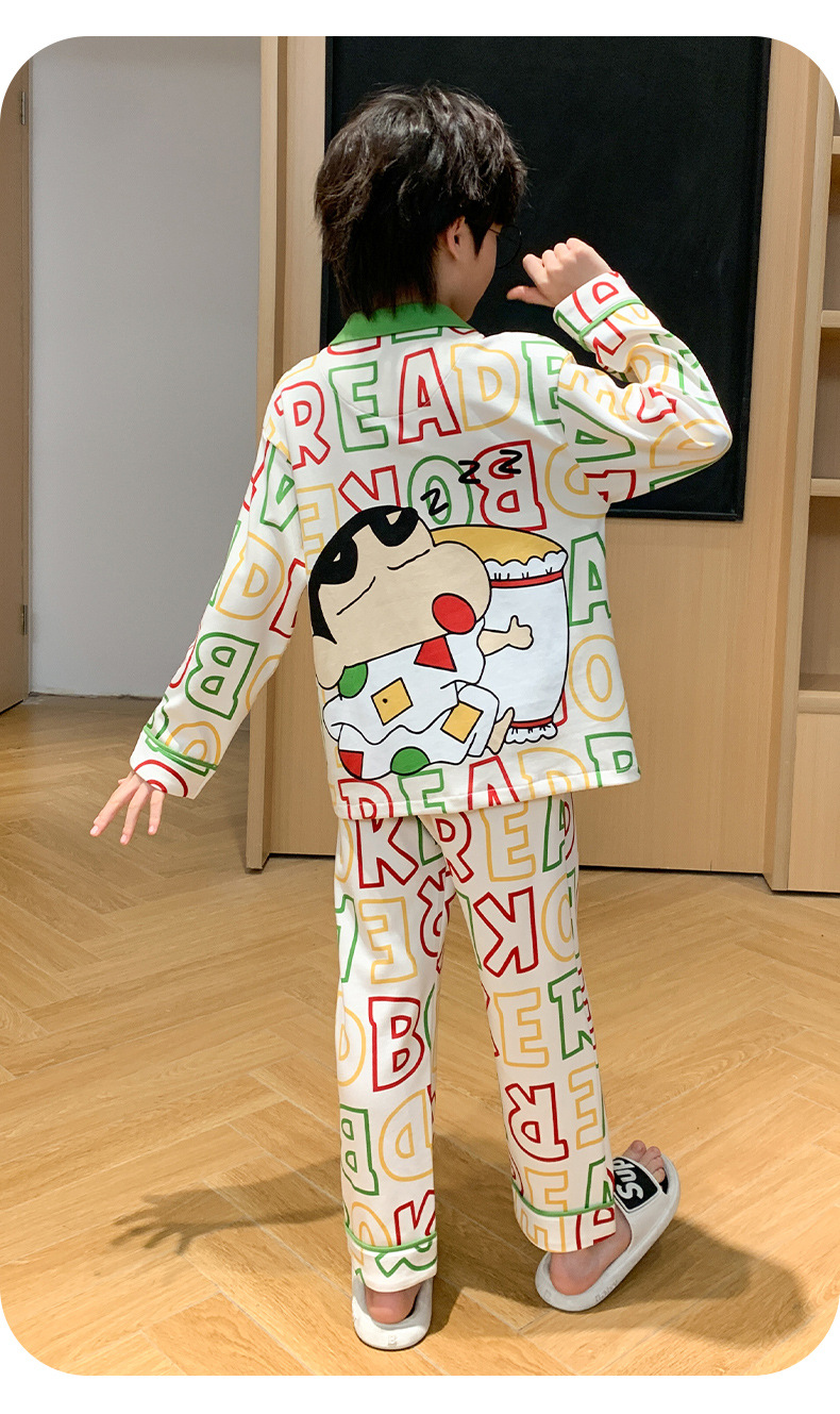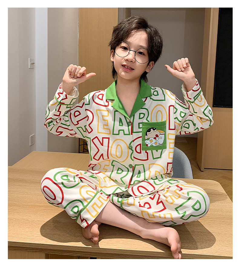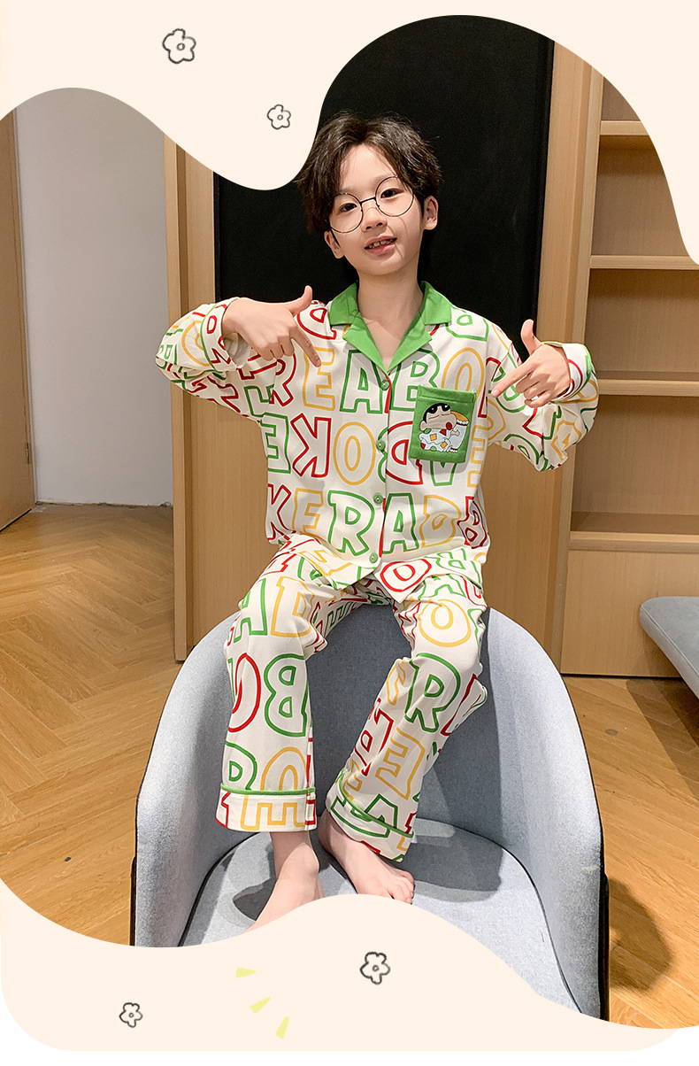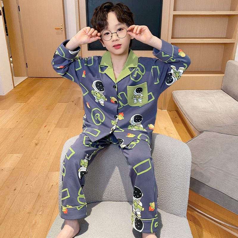 봄 및 가을 대외 무역을위한 소년 잠옷 순면 긴 소매 얇은 세트 소년 중 큰 어린이 만화 아기 홈 의류 트렌디