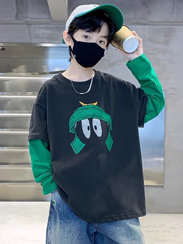 소년의 봄 긴 소매 가짜 두 조각 티셔츠 2024 새로운 어린이 만화 중형 큰 어린이 기지 셔츠 소년의 최고 트렌디