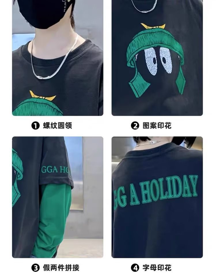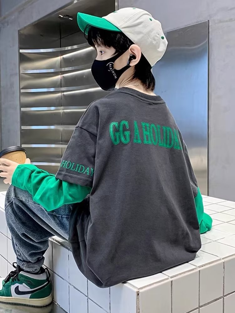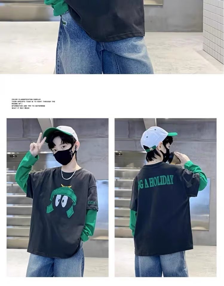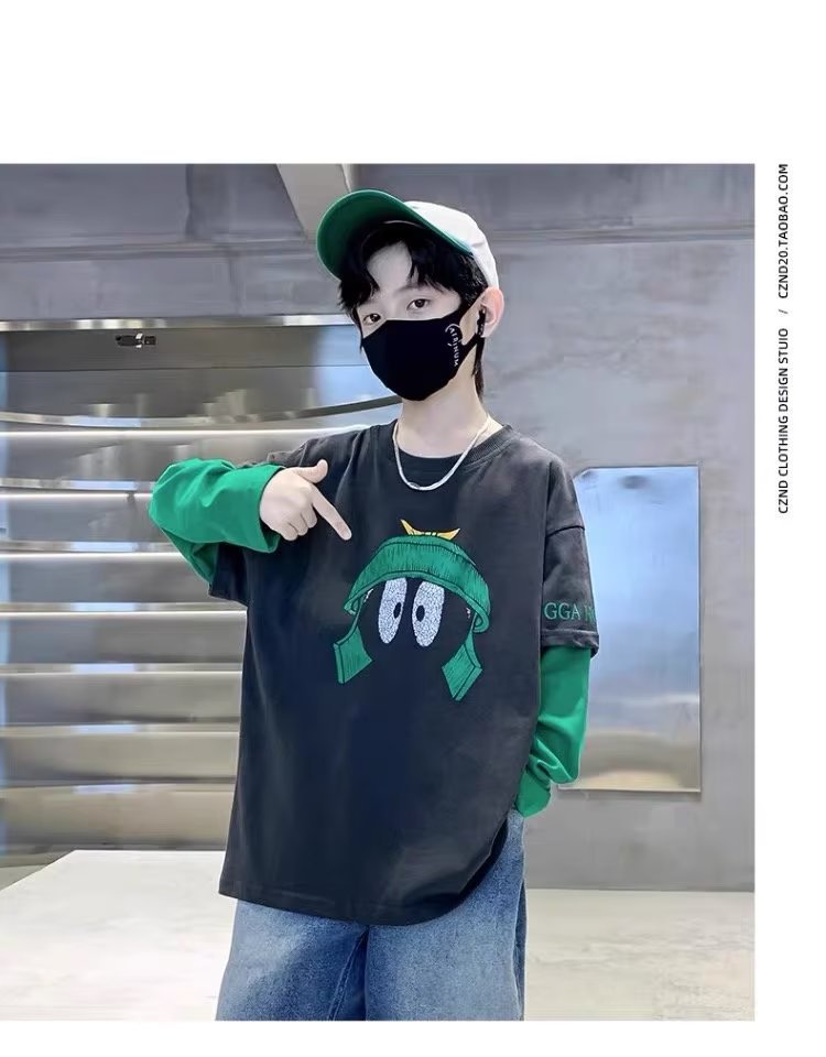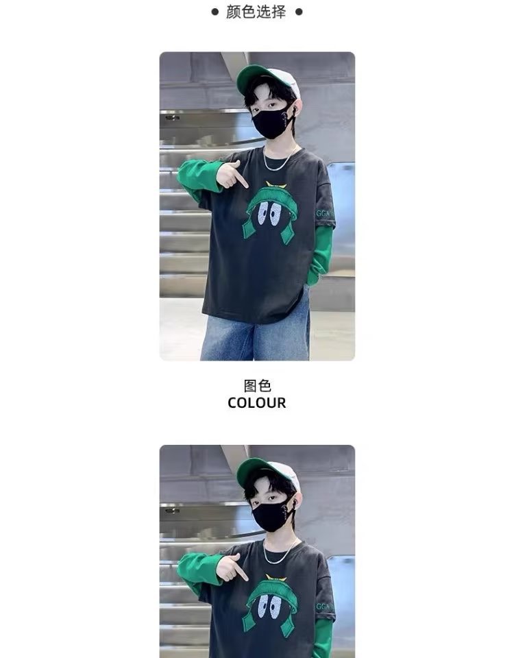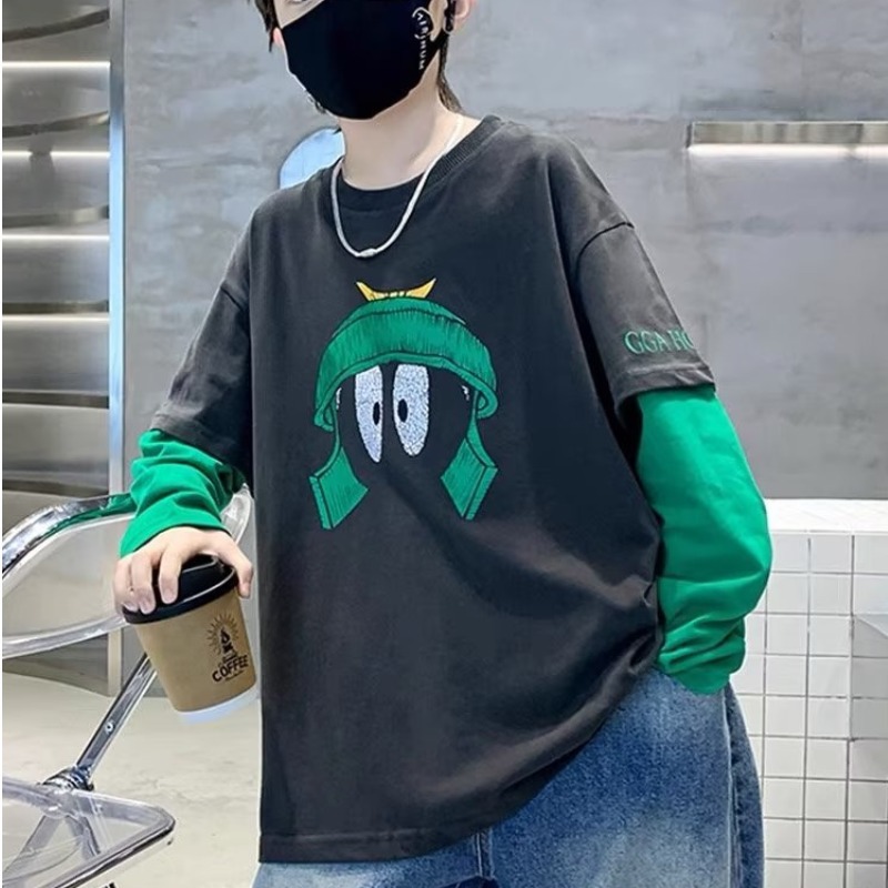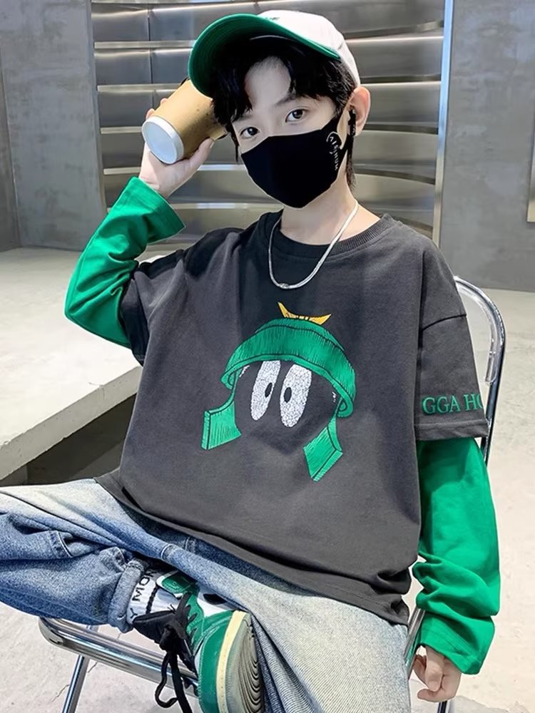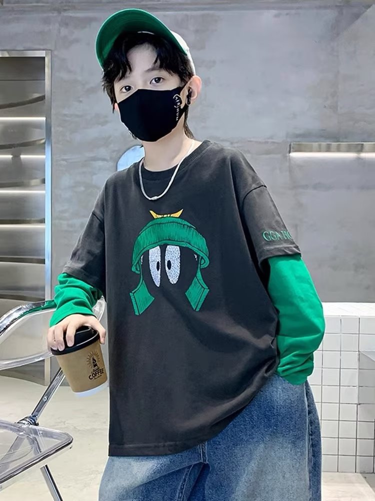 소년의 봄 긴 소매 가짜 두 조각 티셔츠 2024 새로운 어린이 만화 중형 큰 어린이 기지 셔츠 소년의 최고 트렌디스토어 가기