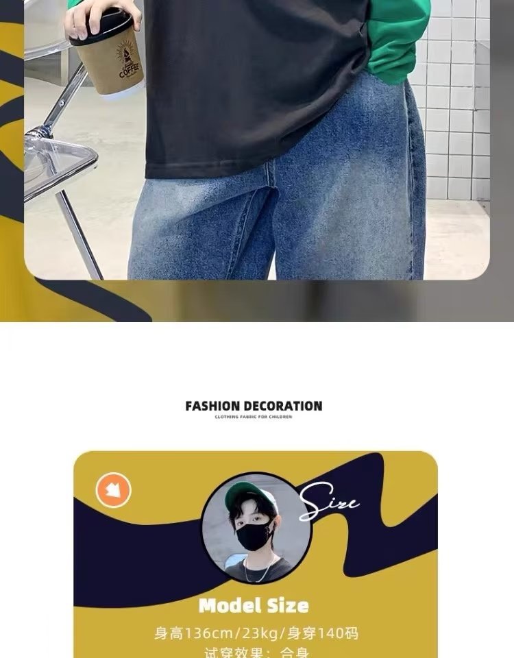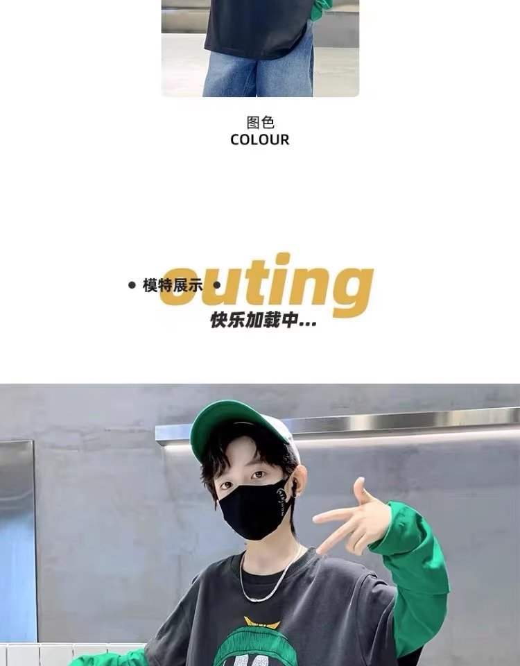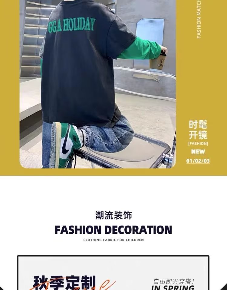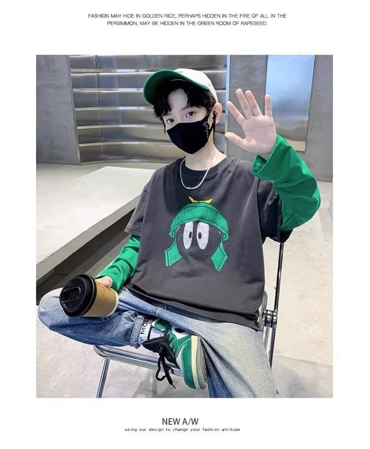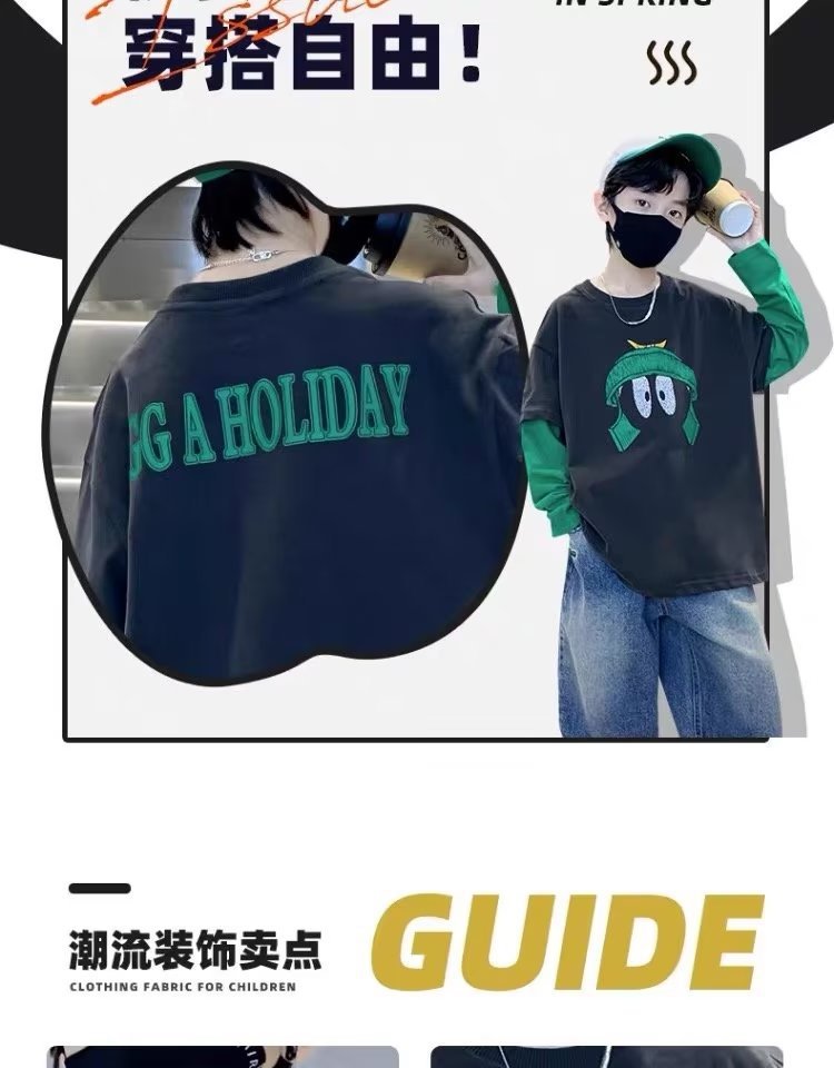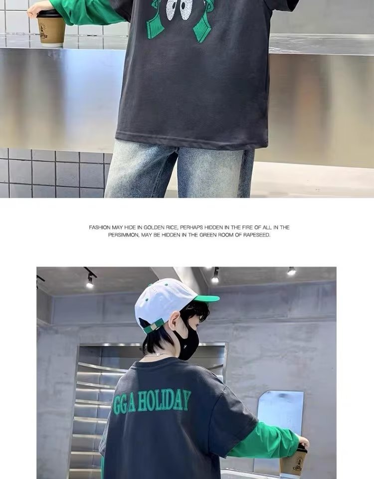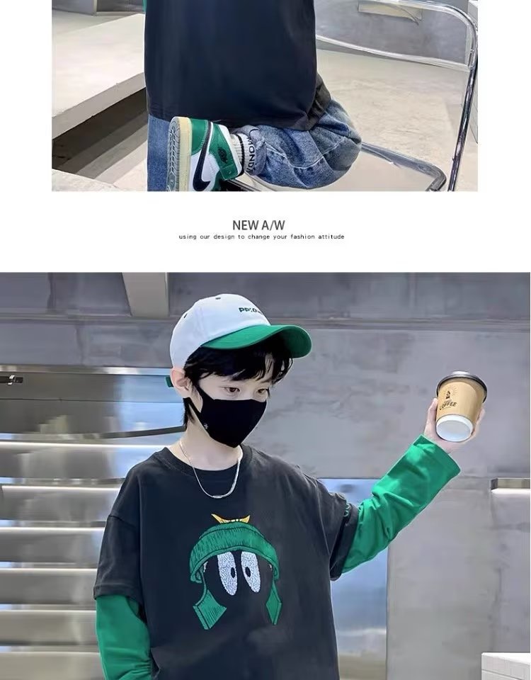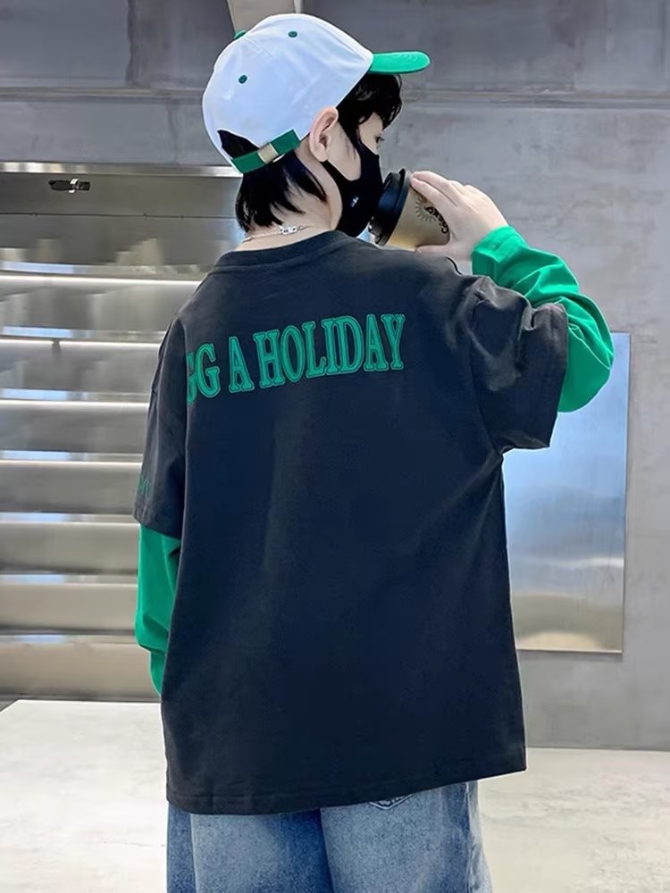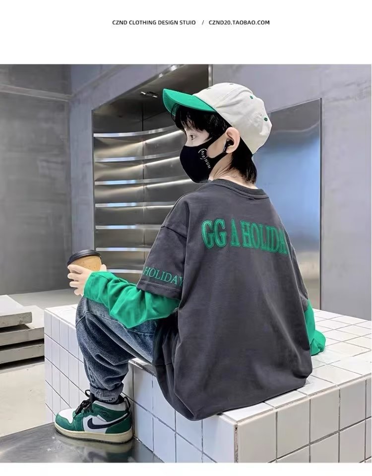 소년의 봄 긴 소매 가짜 두 조각 티셔츠 2024 새로운 어린이 만화 중형 큰 어린이 기지 셔츠 소년의 최고 트렌디스토어 가기