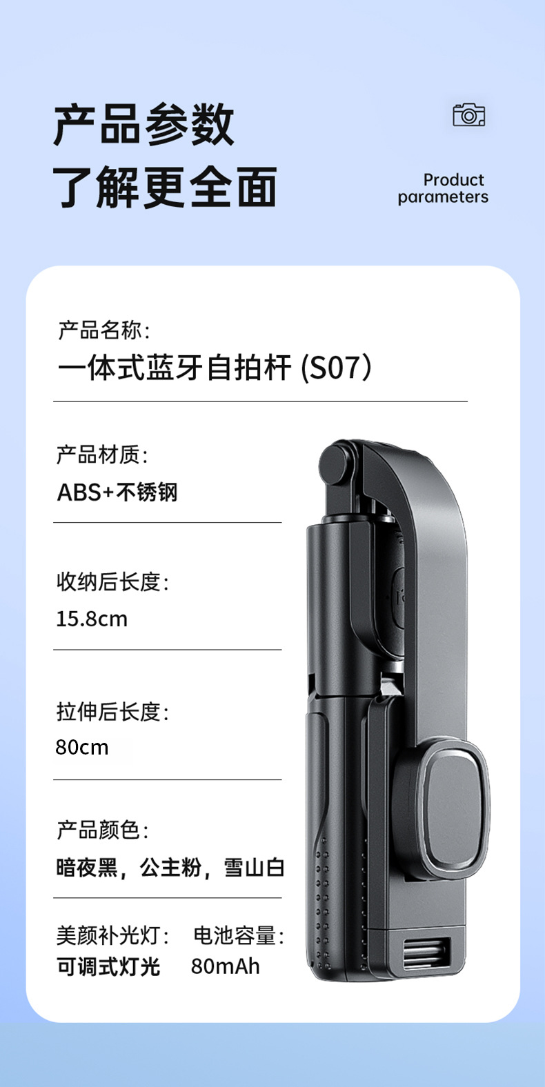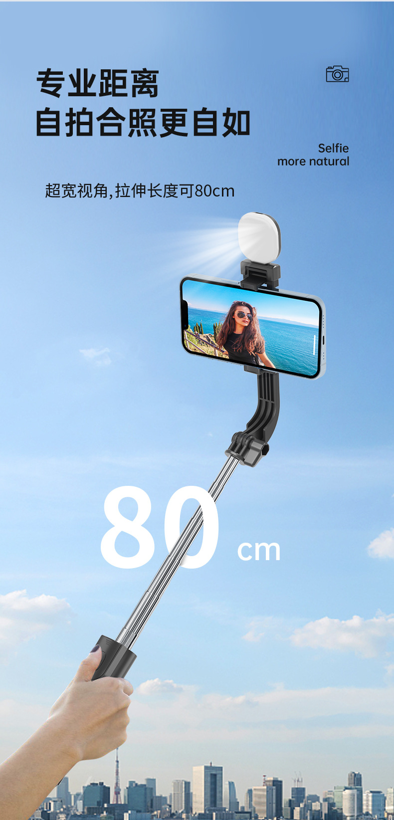 • S07K 스테인리스 레드서클 미니 셀카봉(이중 헤드라이트)
