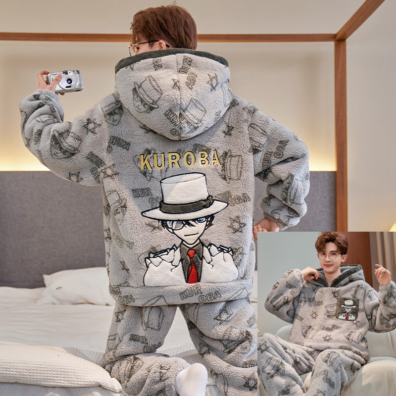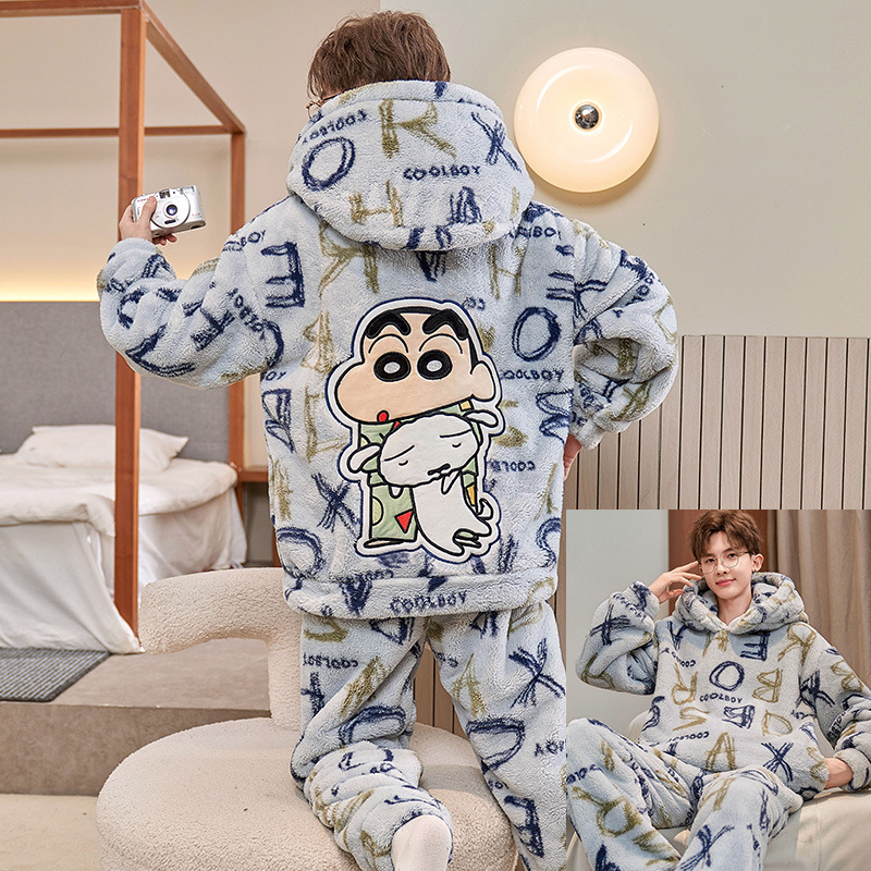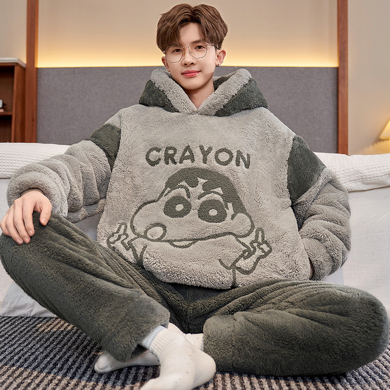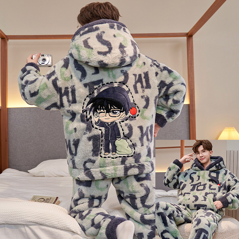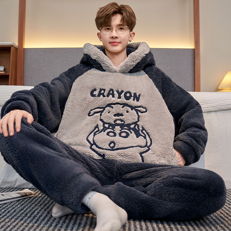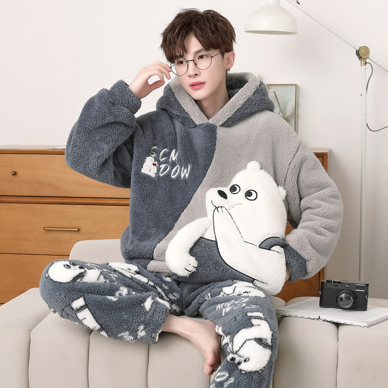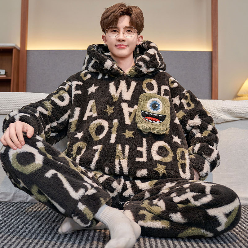 남자 잠옷 가을과 겨울 겨울 산호 양털 두꺼운 기모 플란넬 만화 집 옷 남자의 겨울 세트