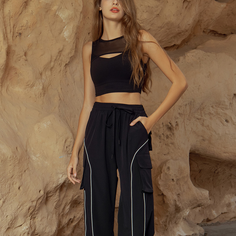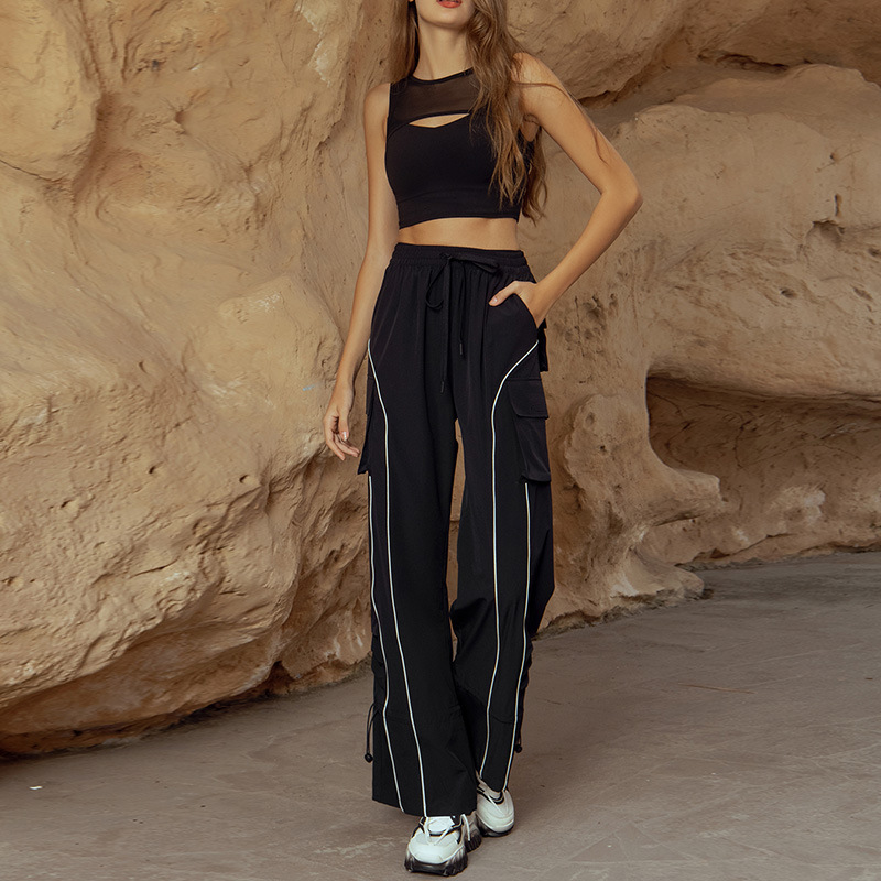 유행 멋진 스테레오 포켓 크레인 바지 피트니스 훈련 빠른 건조 스포츠 조끼 마이크로 플레어 바지 야외 스포츠 세트 여성
