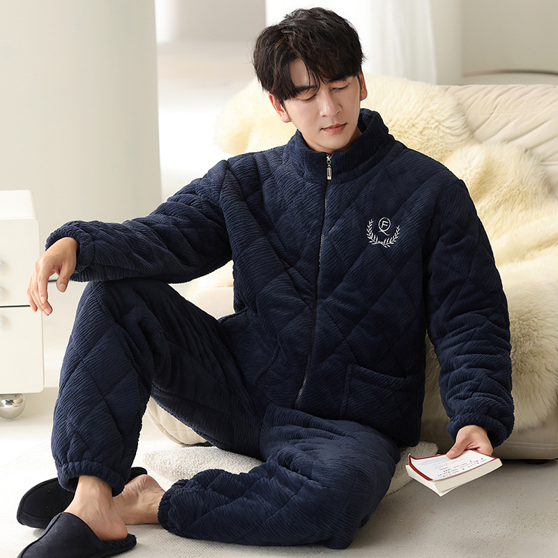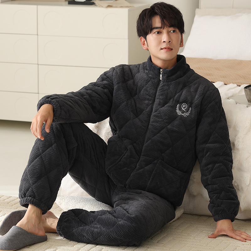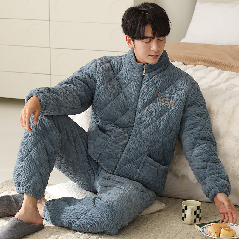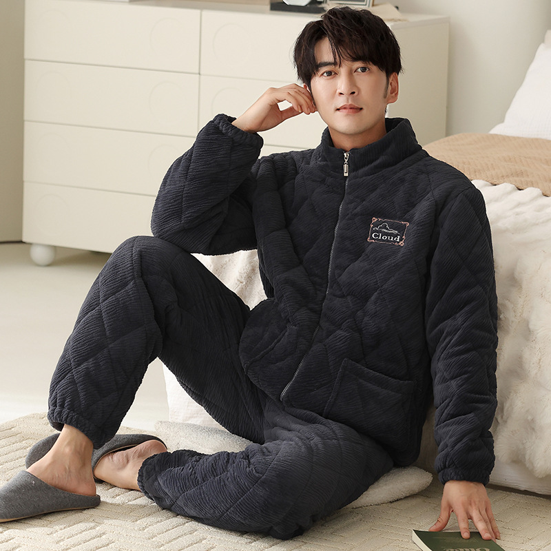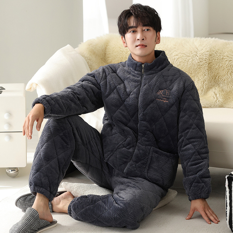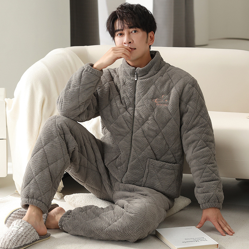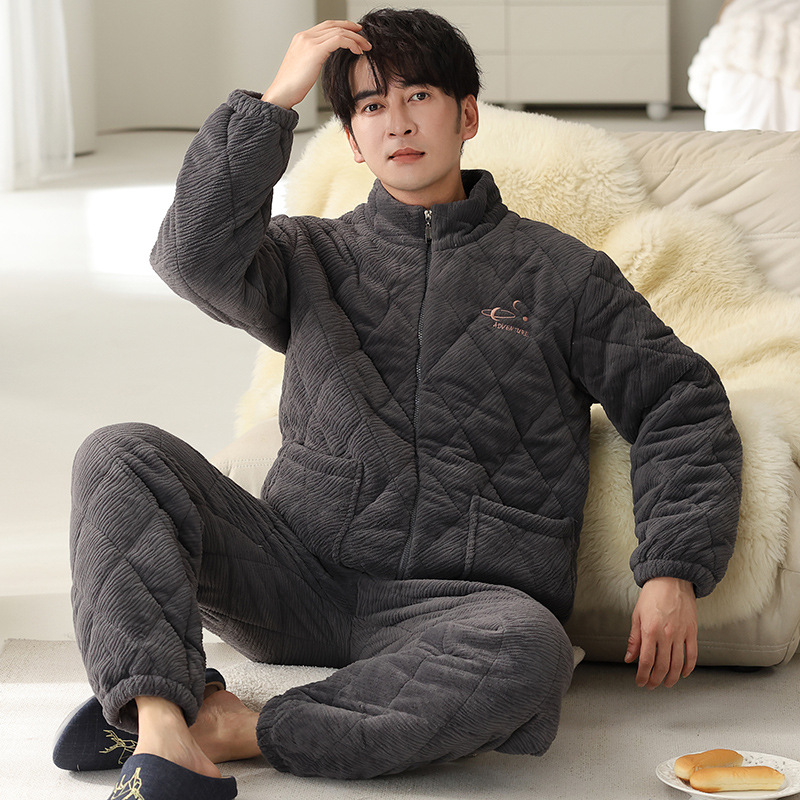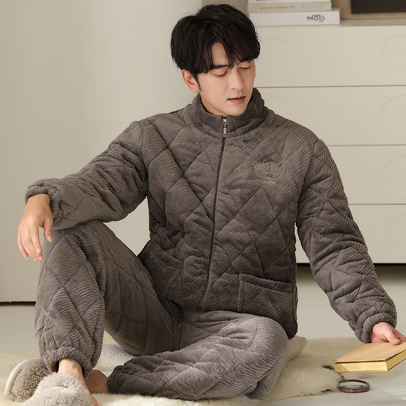 기모 두꺼운 파자마 남자 겨울 퀼트 3 층 밀크 벨벳 따뜻한 지퍼 남자 겨울 세트 자켓 착용