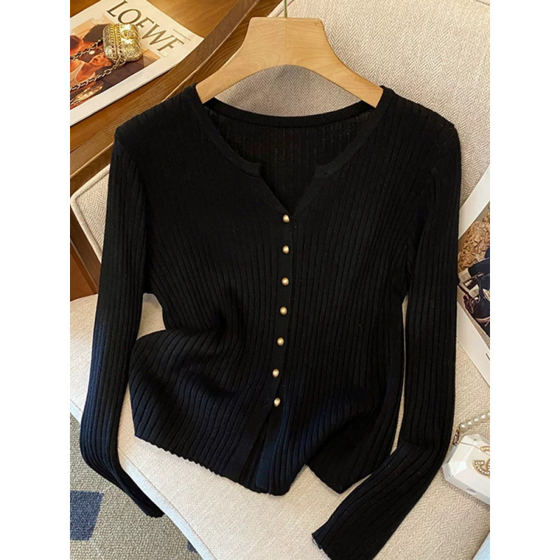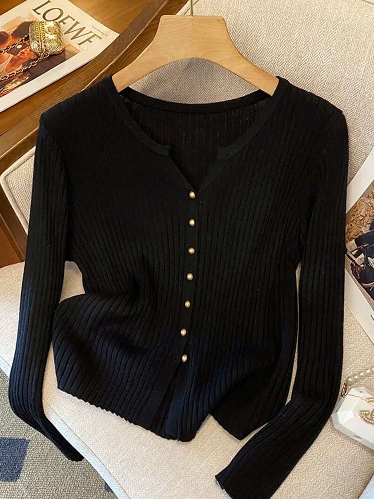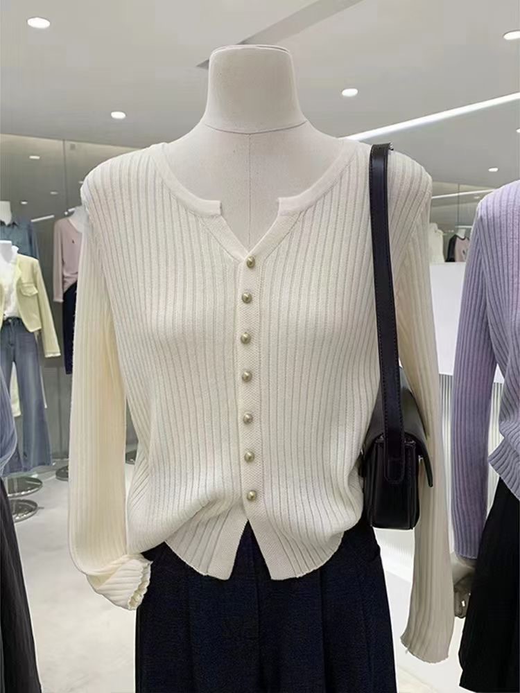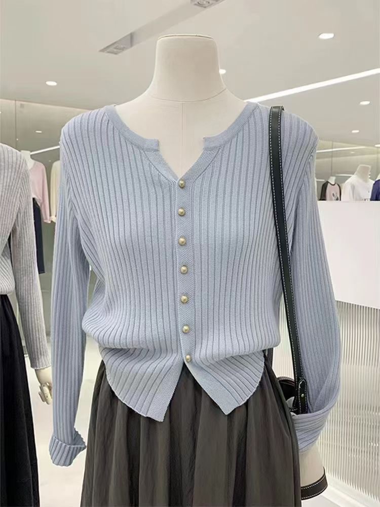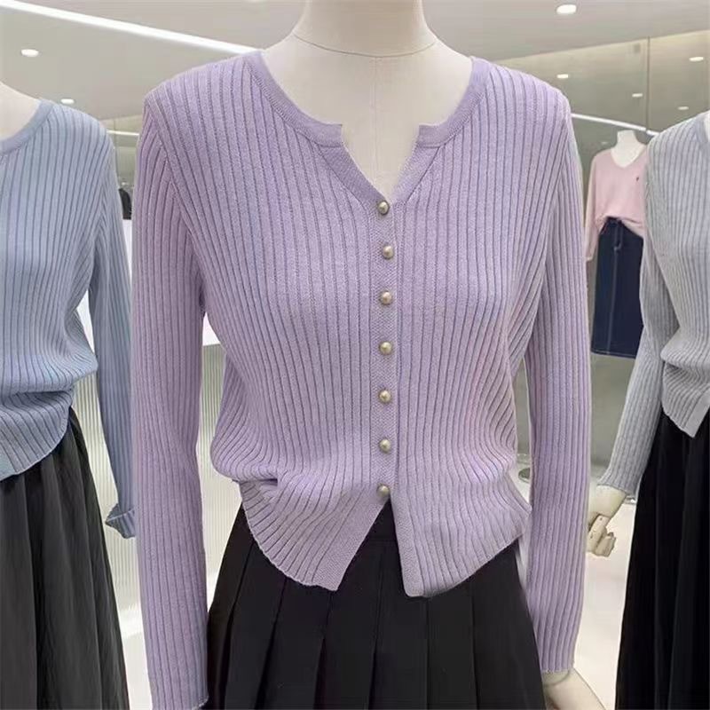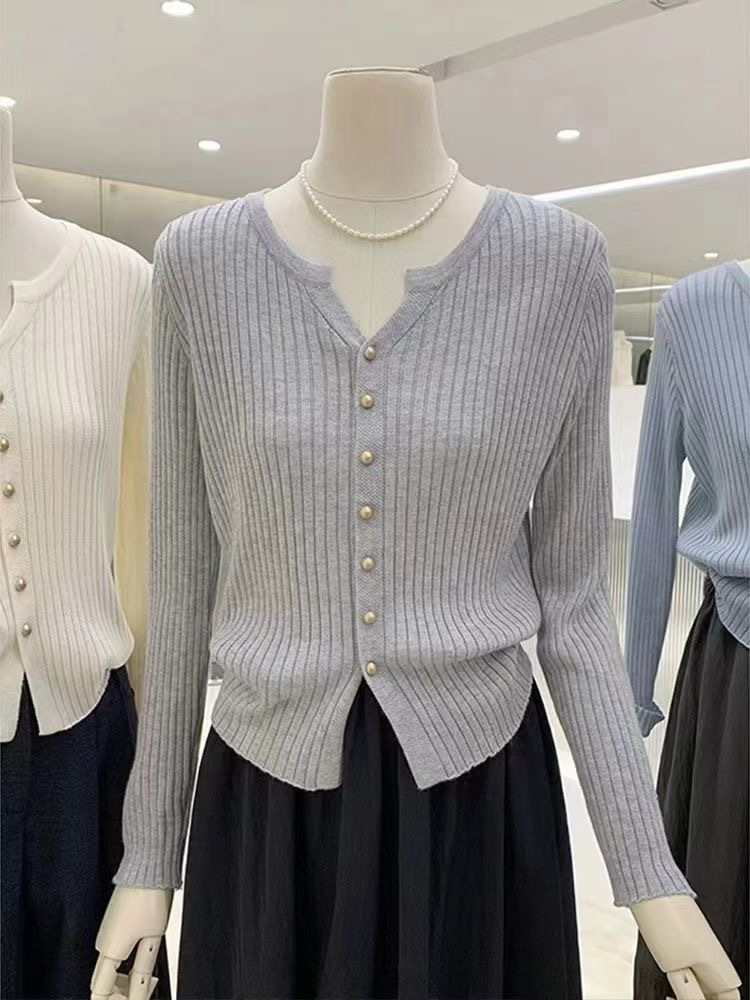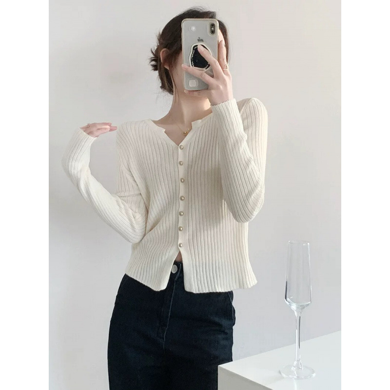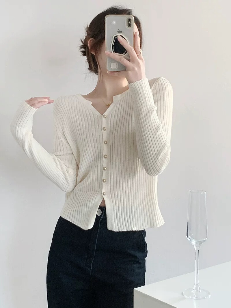 한국 스타일 부드러운 우아한 V 넥 긴팔 니트 카디건 여자 가을 하이 엔드 슬림 핏 슬리밍 캐주얼 올 매치 탑