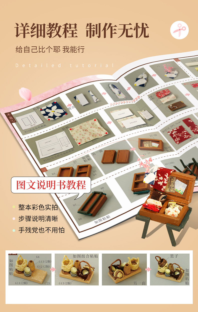 1.产品包装内附有详细的制作说明书。制作前可以先准备一套辅助工具,如剪刀、镊子、尺子用来量尺寸等工具。