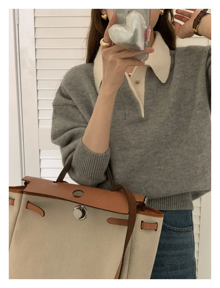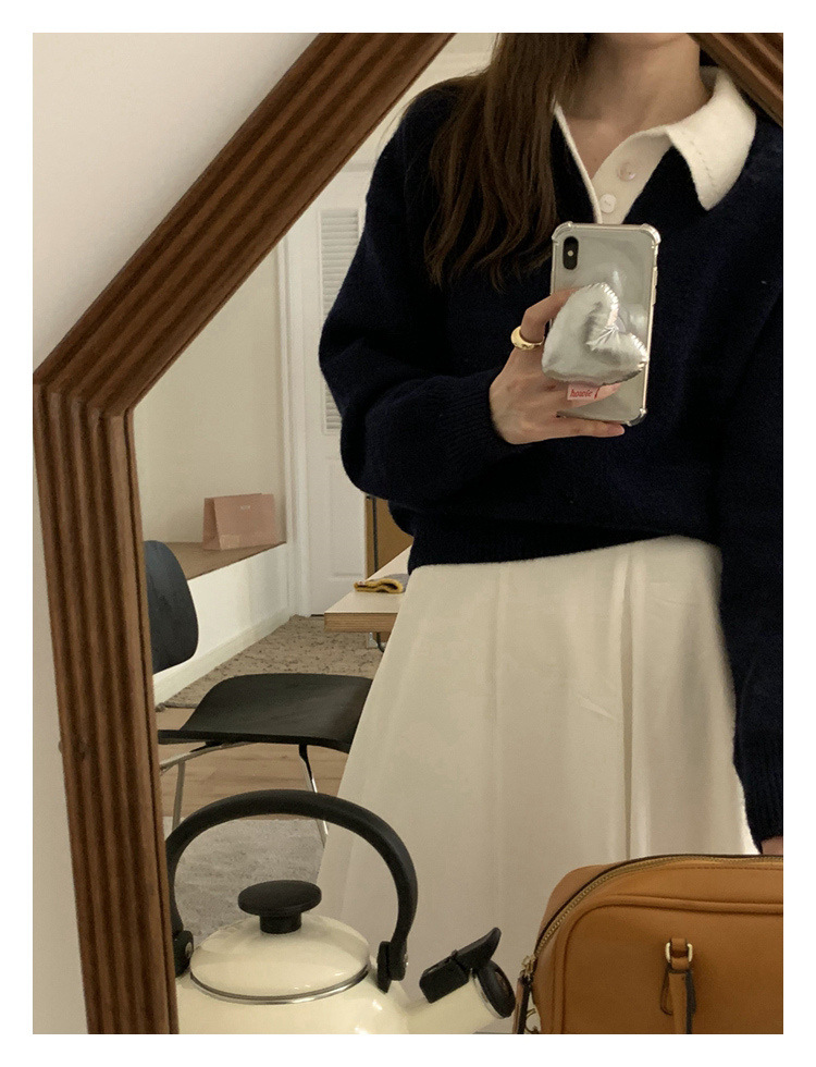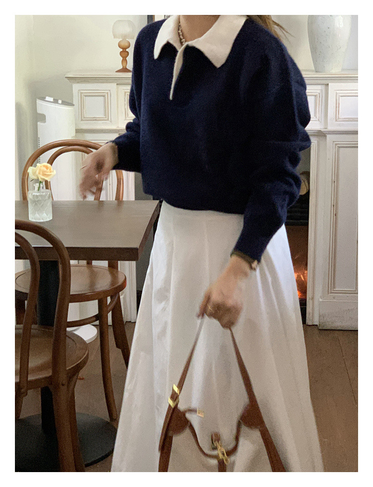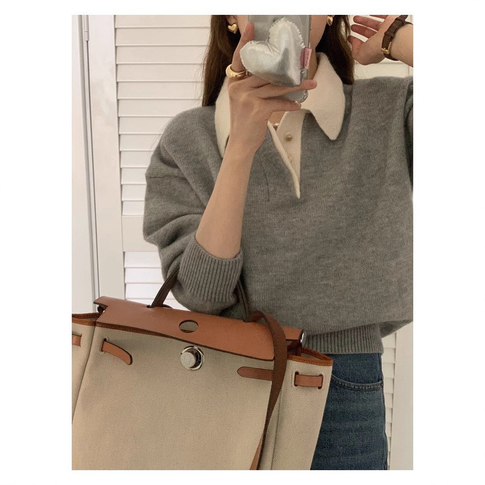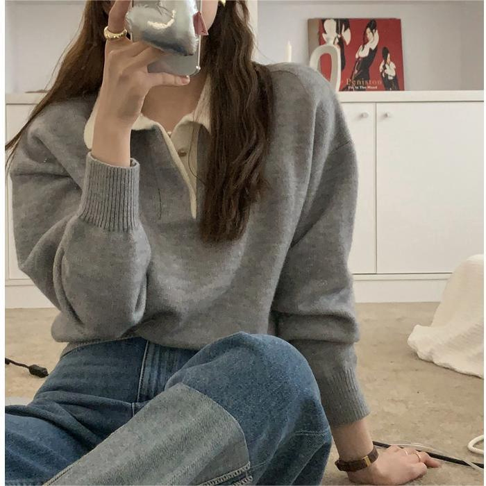 프랑스 레트로 폴로 칼라 니트 베이스 셔츠 여성의 가을과 겨울 느슨한 게으른 스타일 내부 짧은 우아한 긴팔 탑