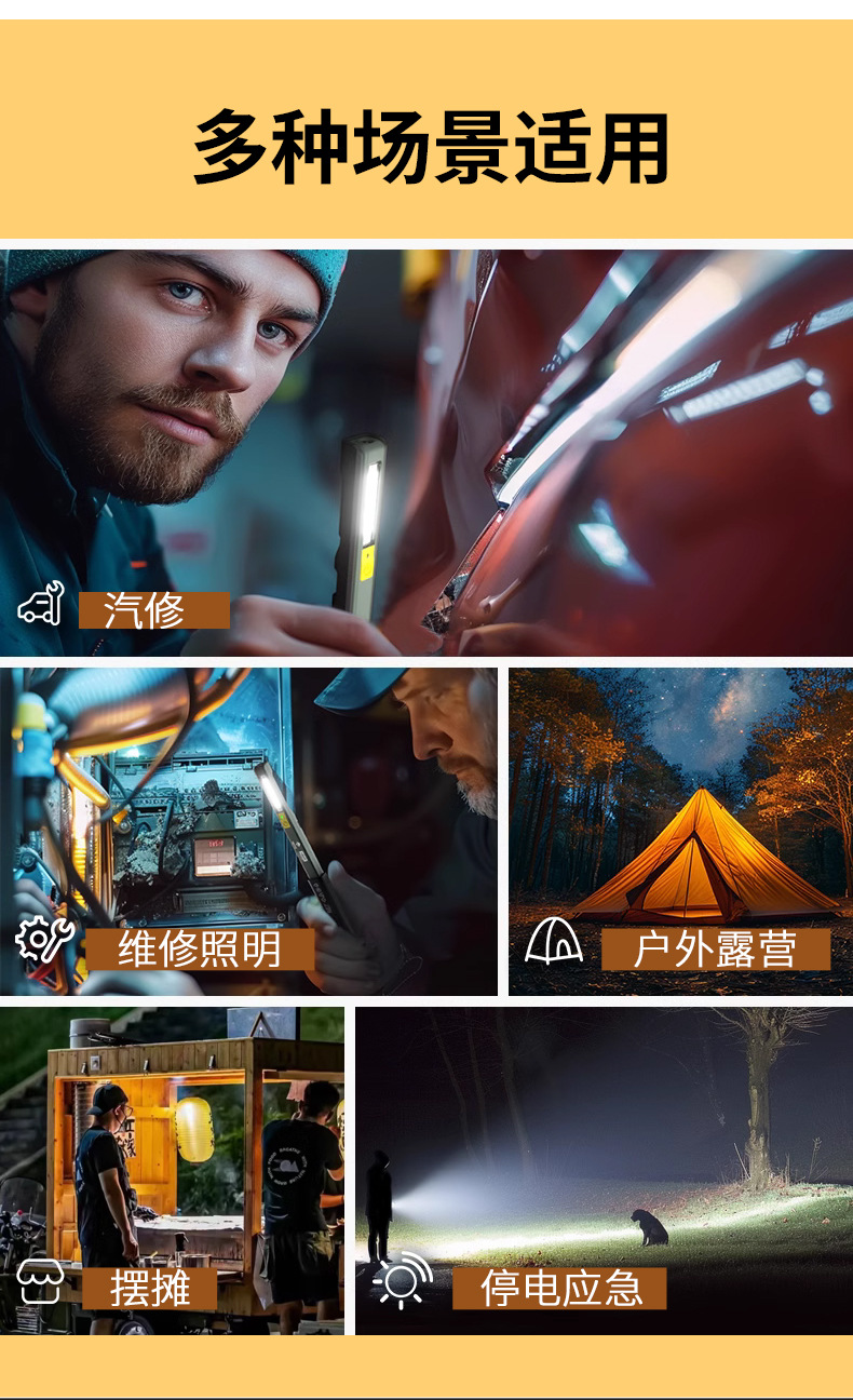 다기능 자기 매력 이중 광원 자동 수리 작업 램프 필드 캠핑 모험 실속 정전 비상 충전식 손전등스토어 가기
