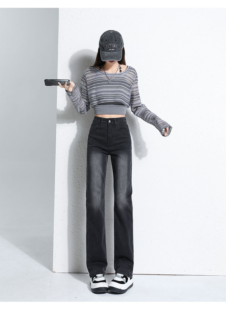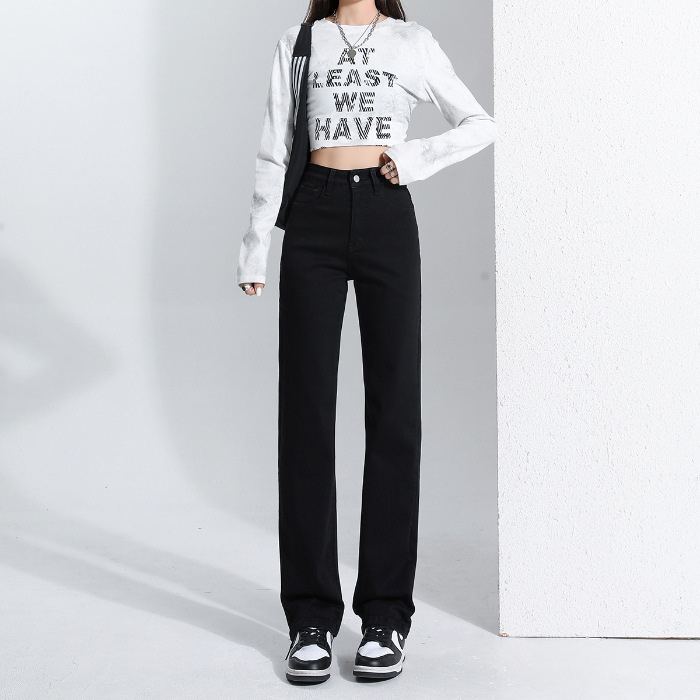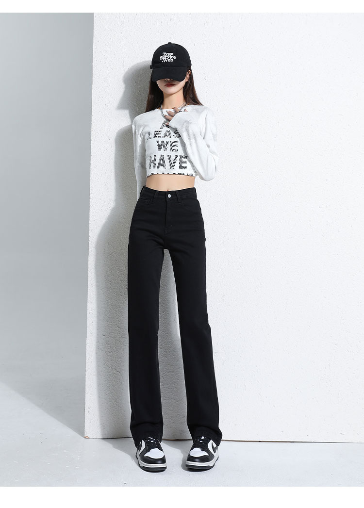 2024 가을과 겨울 검은 기모 스트레칭 청바지 여성의 높은 허리 좁은 슬림 핏 느슨한 스트레이트 바지 얇은 벨벳 바지