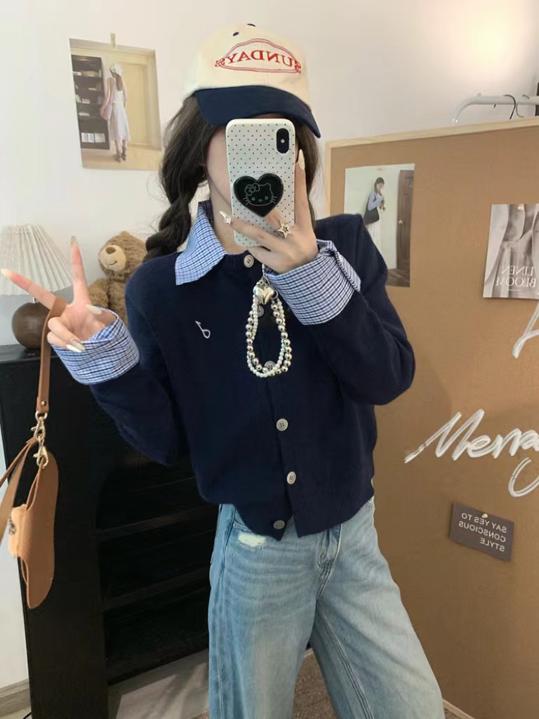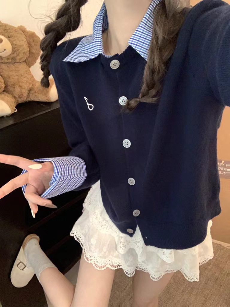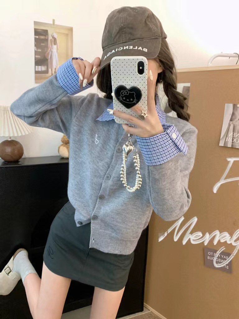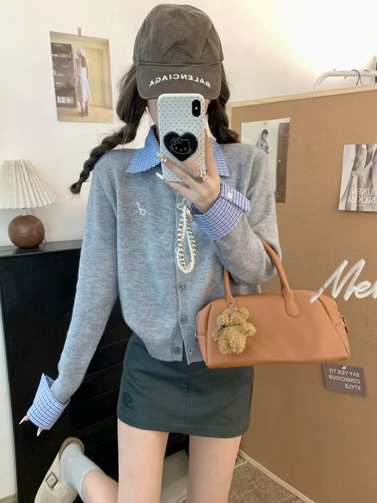 대학 스타일 가짜 투피스 통근 카디건 코트 여성 뜨거운 소녀 이른 가을 새 한국 스타일 아름다운 짧은 탑 착용