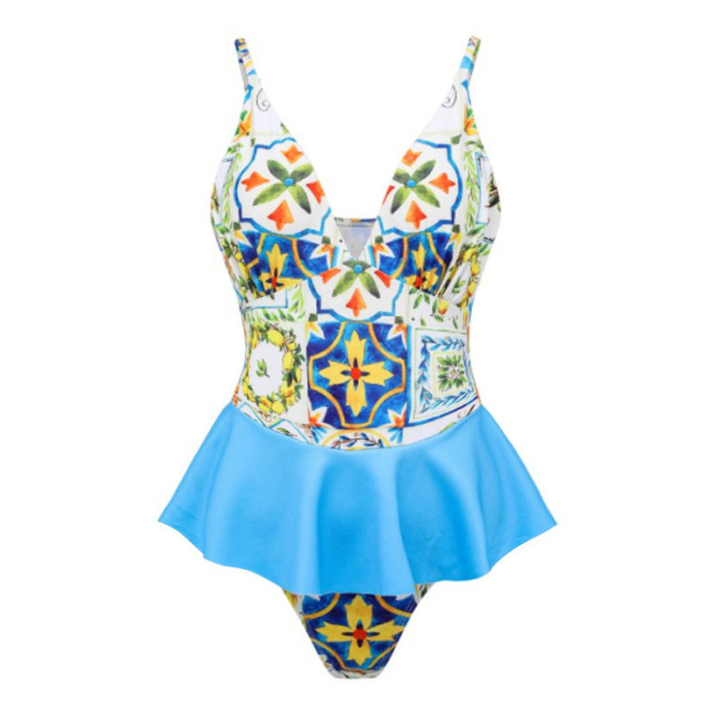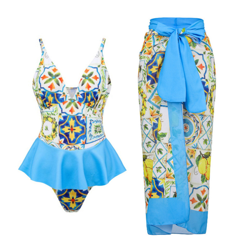 2024 유럽과 미국의 폭발 수영복 여성용 V-넥 러플 스커트 레몬 프린트 점프 수트 포장 스커트 커버 2383
