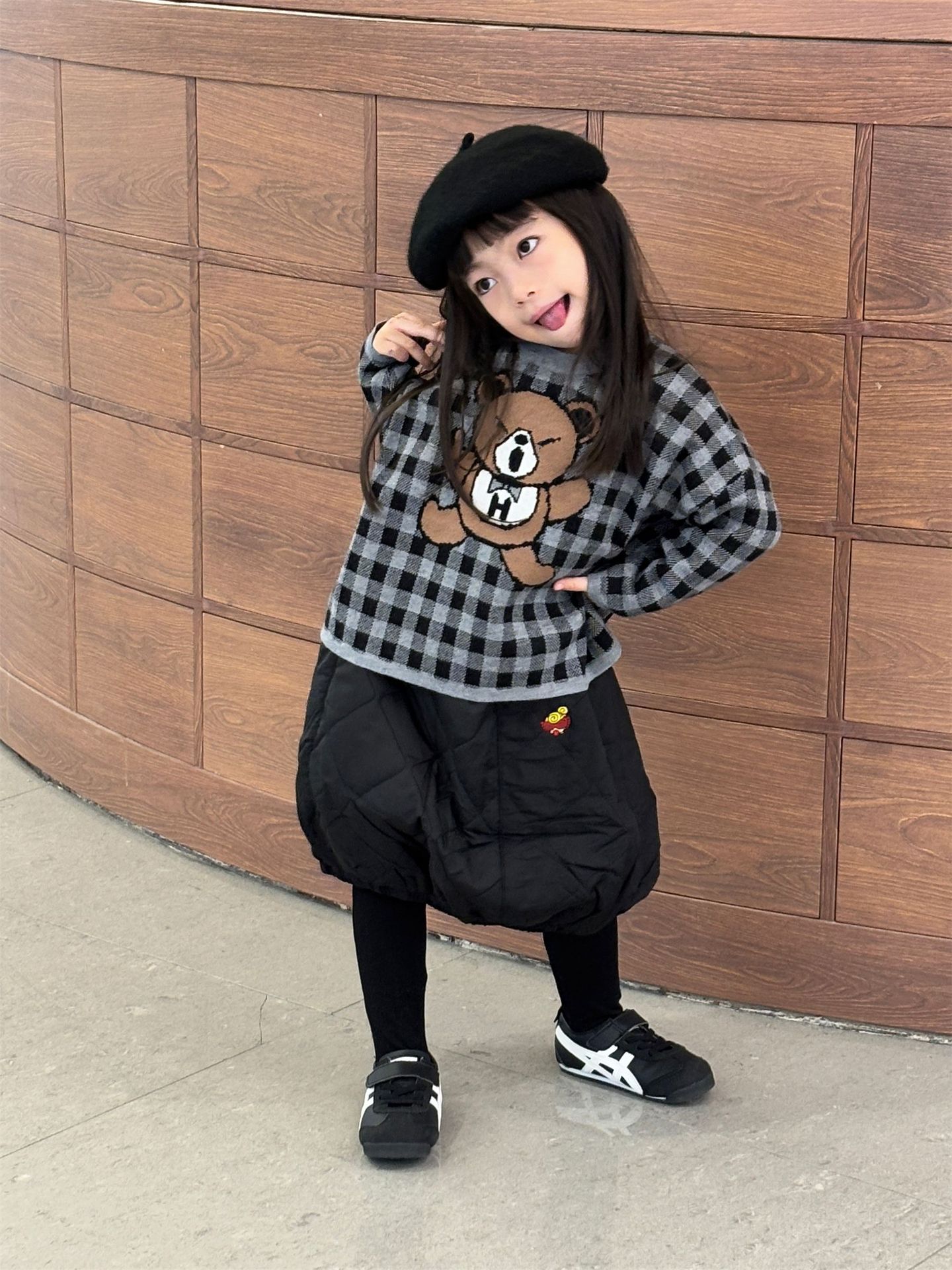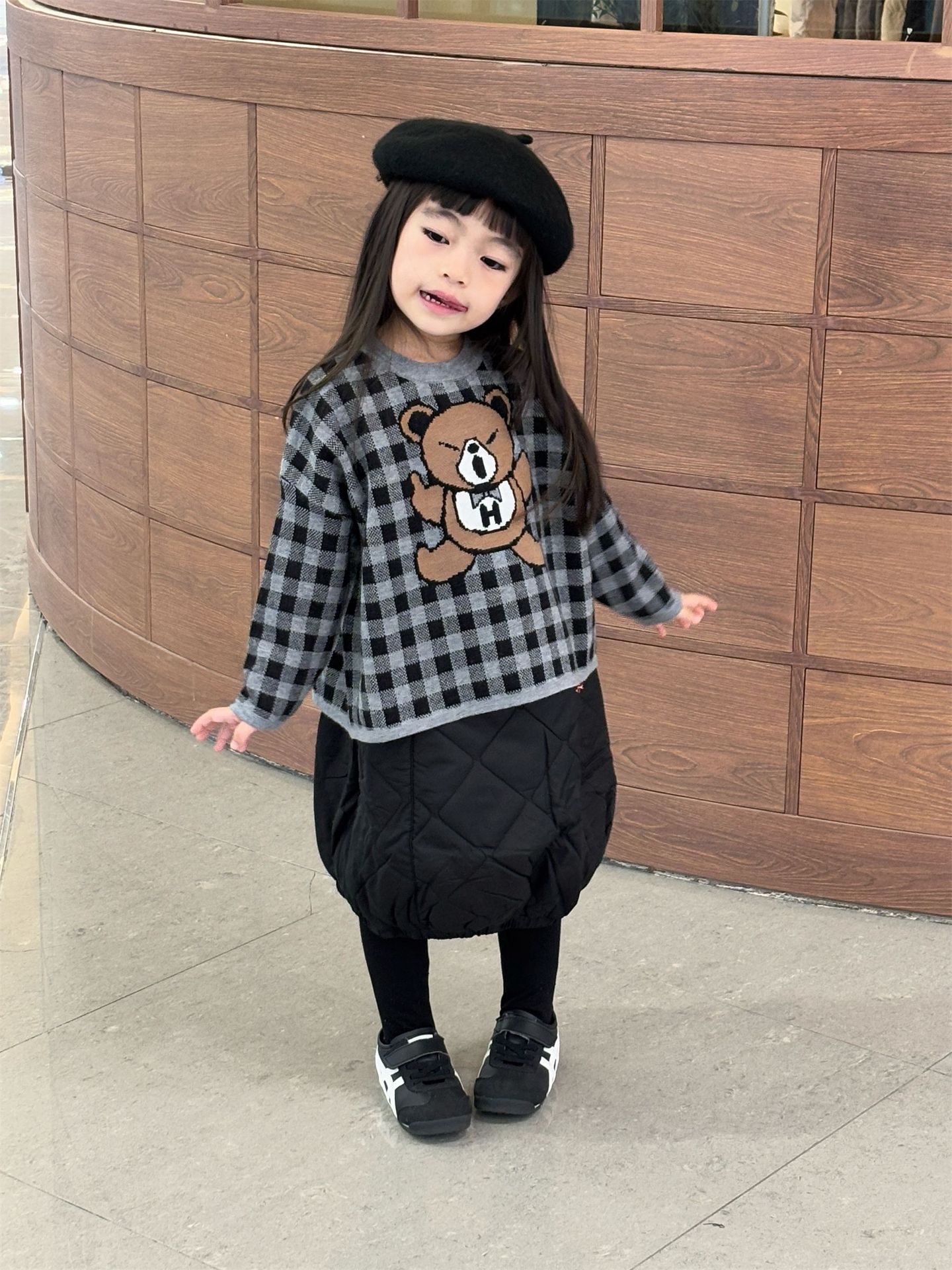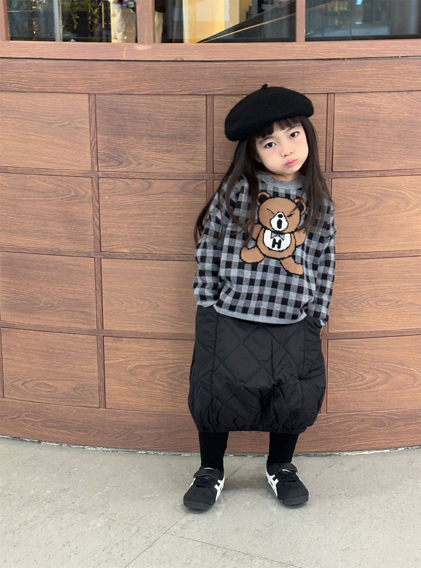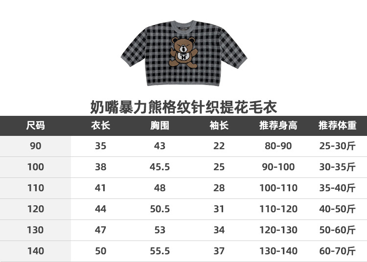 2024 새로운 블랙 슈퍼 조수 브랜드 젖꼭지 폭력 곰 체크 니트 긴 소매 스웨터 젖꼭지 어린이 스웨터 재고