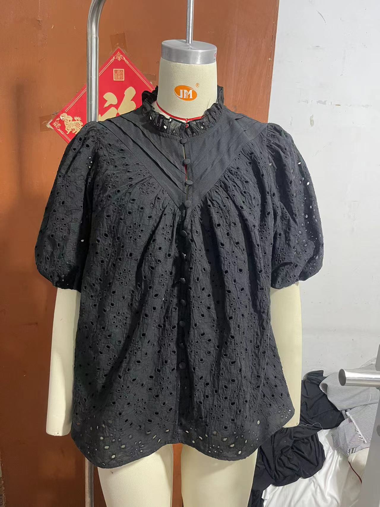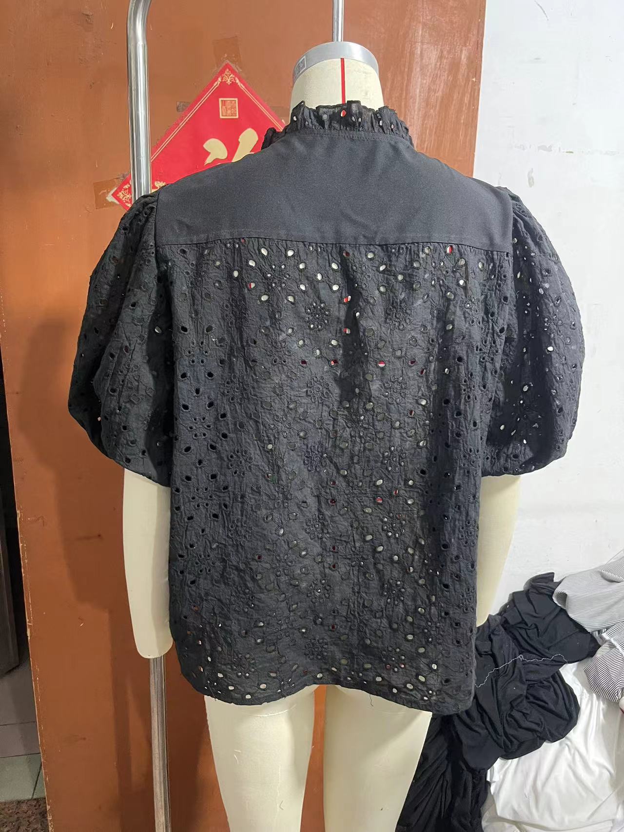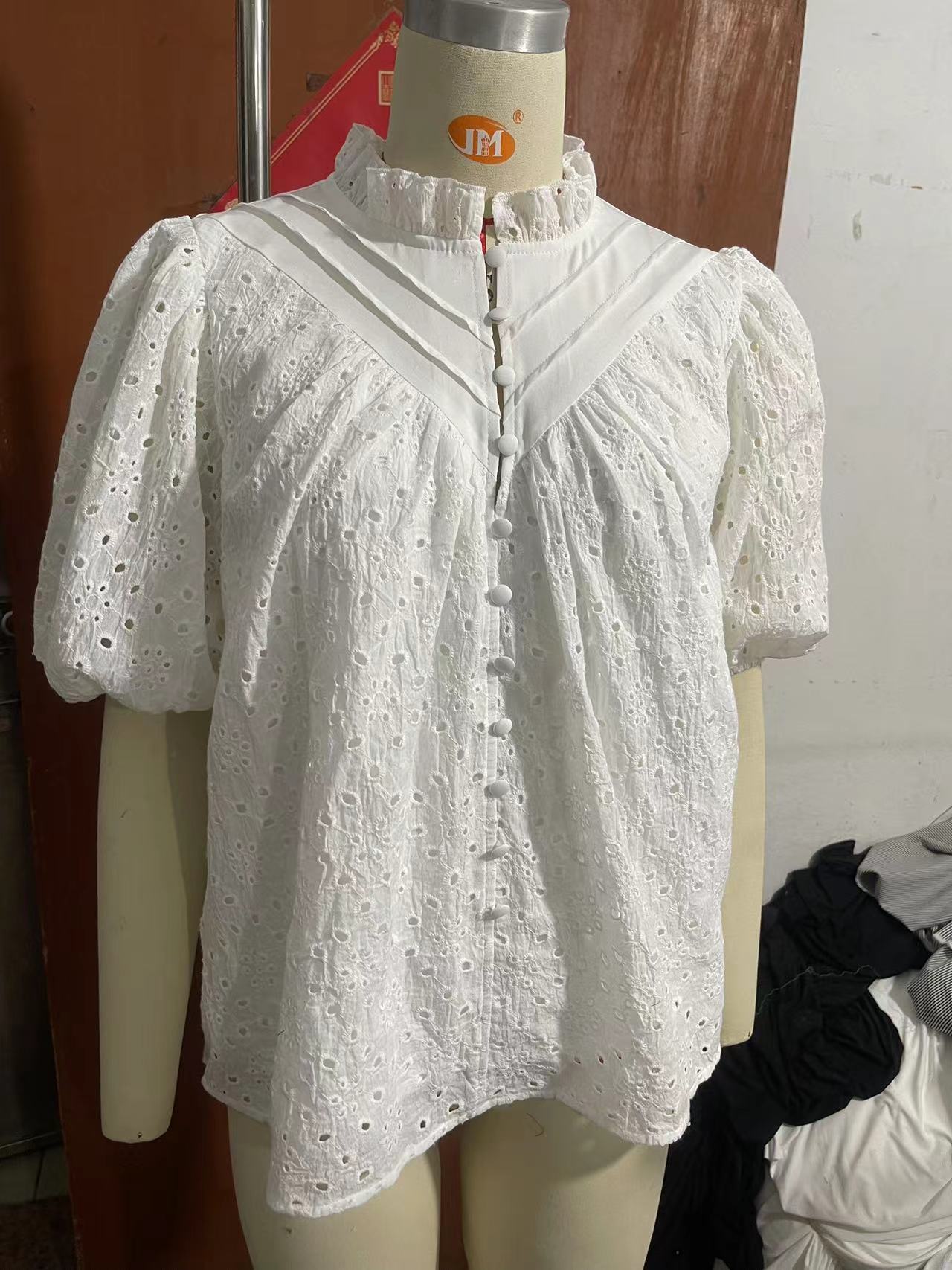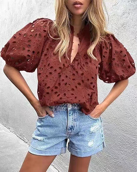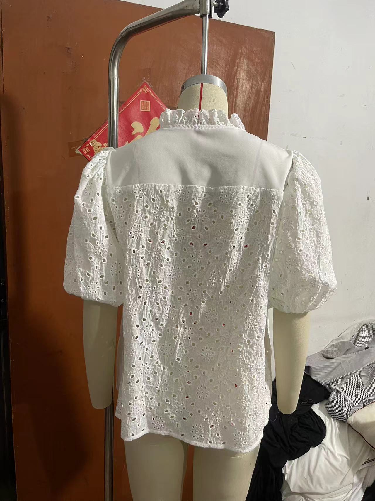 2024 크로스 보더 여성 여름 최고의 패션 캐주얼 랜턴 슬리브 V-넥 버튼 빈 레이스 자수 셔츠