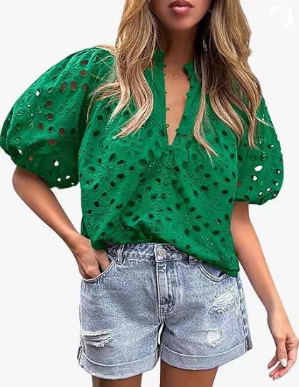 2024 크로스 보더 여성 여름 최고의 패션 캐주얼 랜턴 슬리브 V-넥 버튼 빈 레이스 자수 셔츠스토어 가기