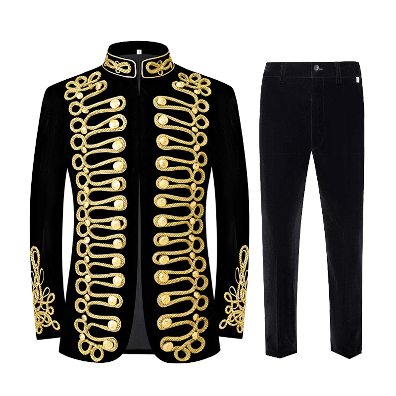 남자 유럽식 법원 세트 귀족 레트로 군사 원피스 벨벳 수제 코트 골드 로프 블랙 인레이 코트