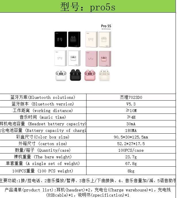 Pro5s 무선 귀 블루투스 헤드셋 긴 수명 TWS 미니 스포츠 블루투스 헤드셋 공장 직접 선물스토어 가기