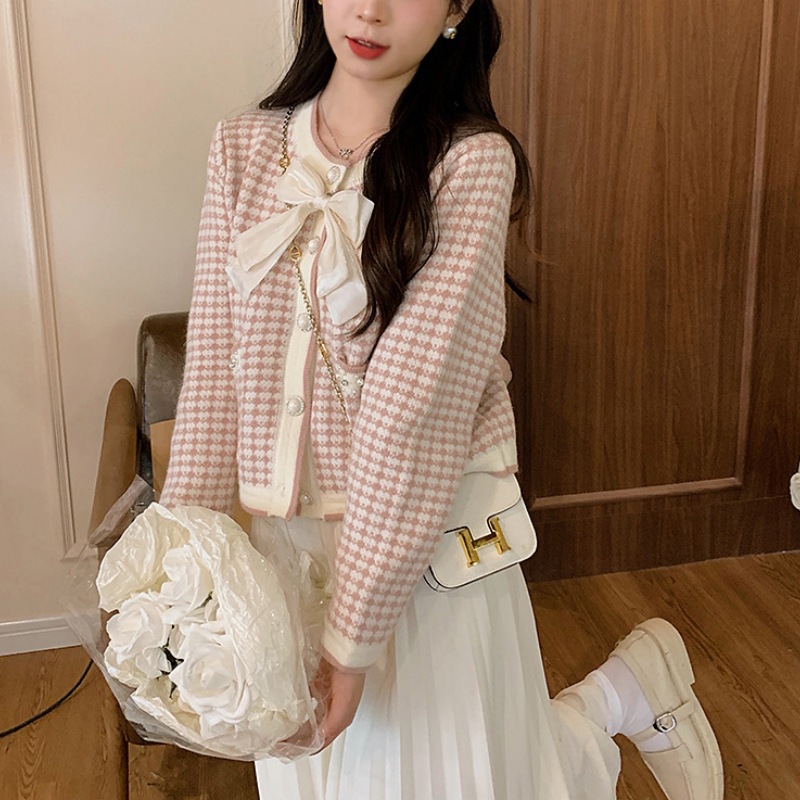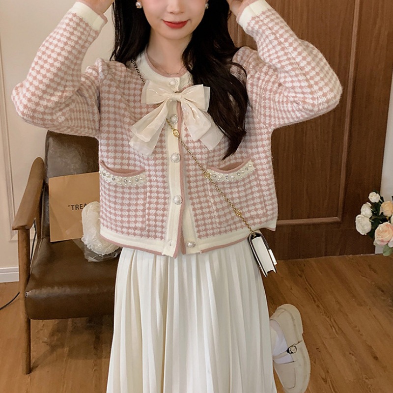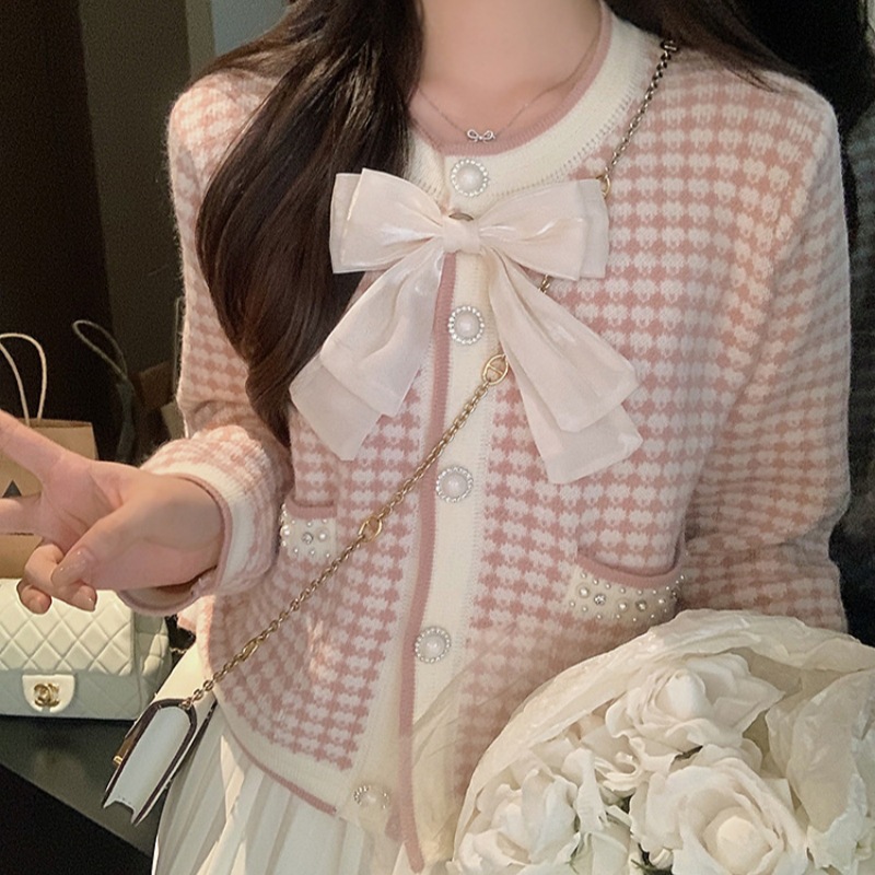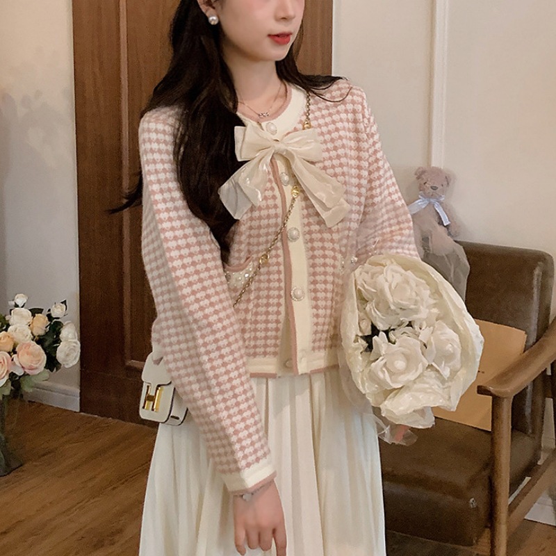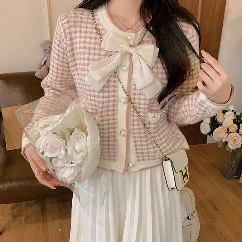 새로운 한국 스타일 격자 무늬 카디건 스웨터 코트 여성의 가을과 겨울 샤넬 스타일 활 니트 탑 코트