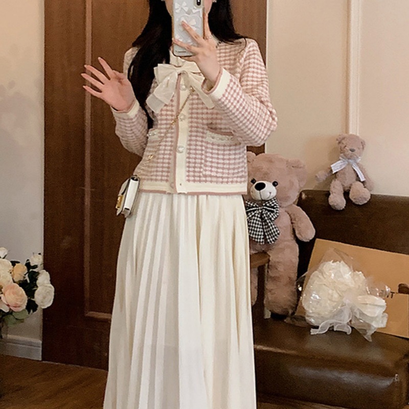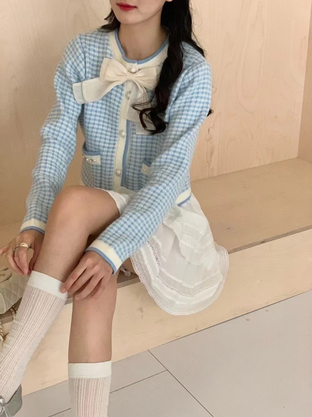 새로운 한국 스타일 격자 무늬 카디건 스웨터 코트 여성의 가을과 겨울 샤넬 스타일 활 니트 탑 코트스토어 가기