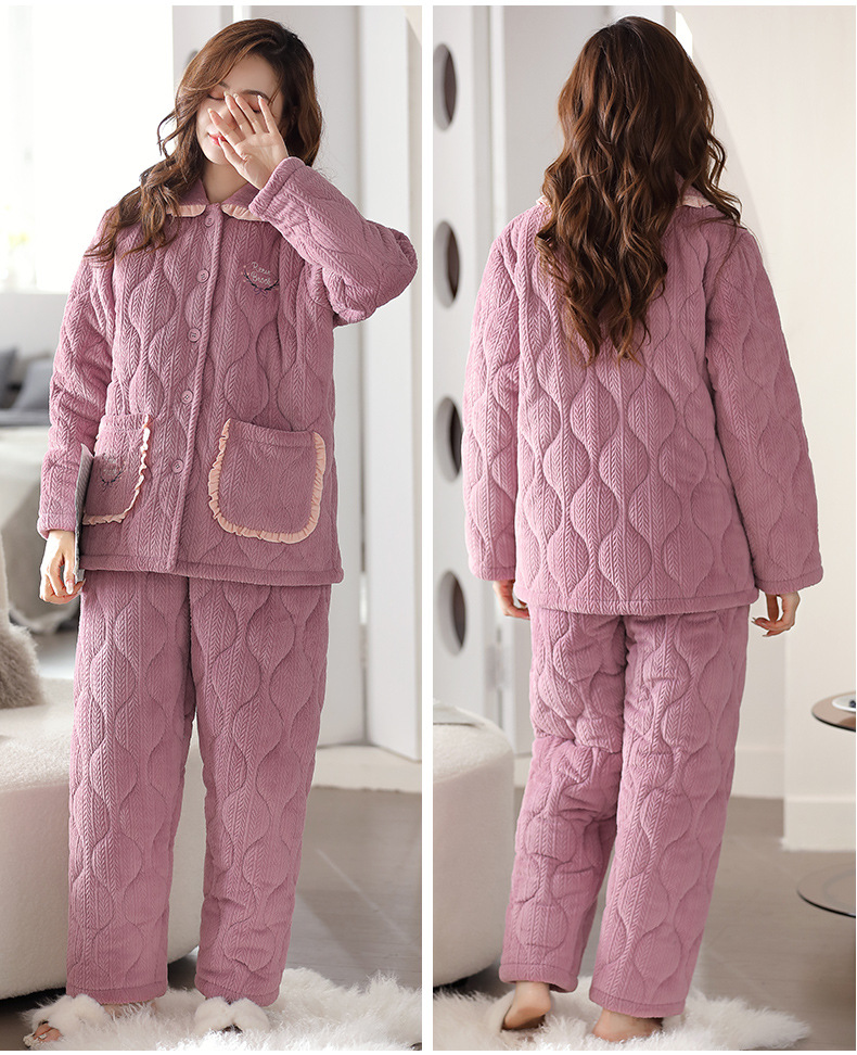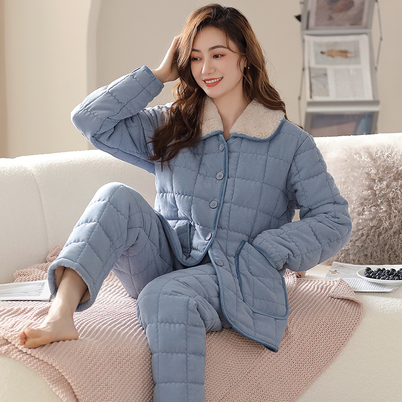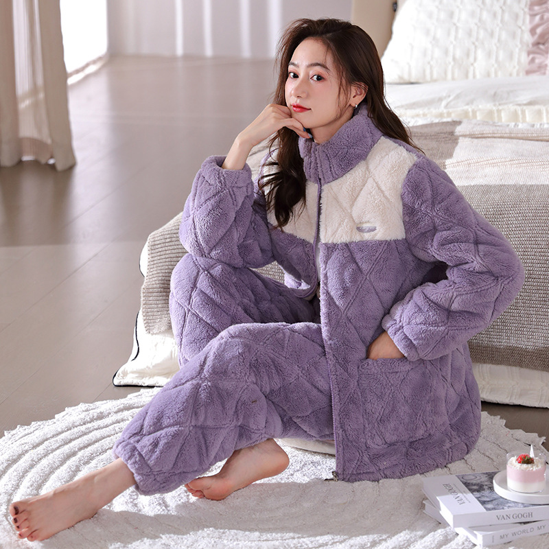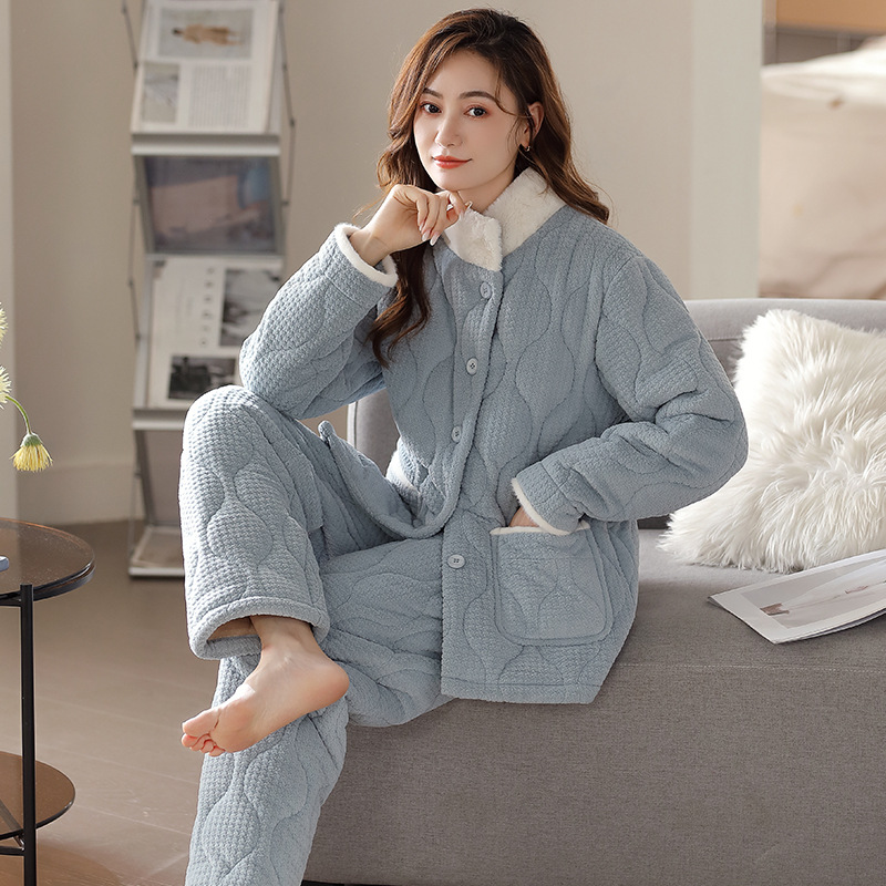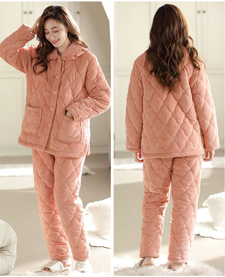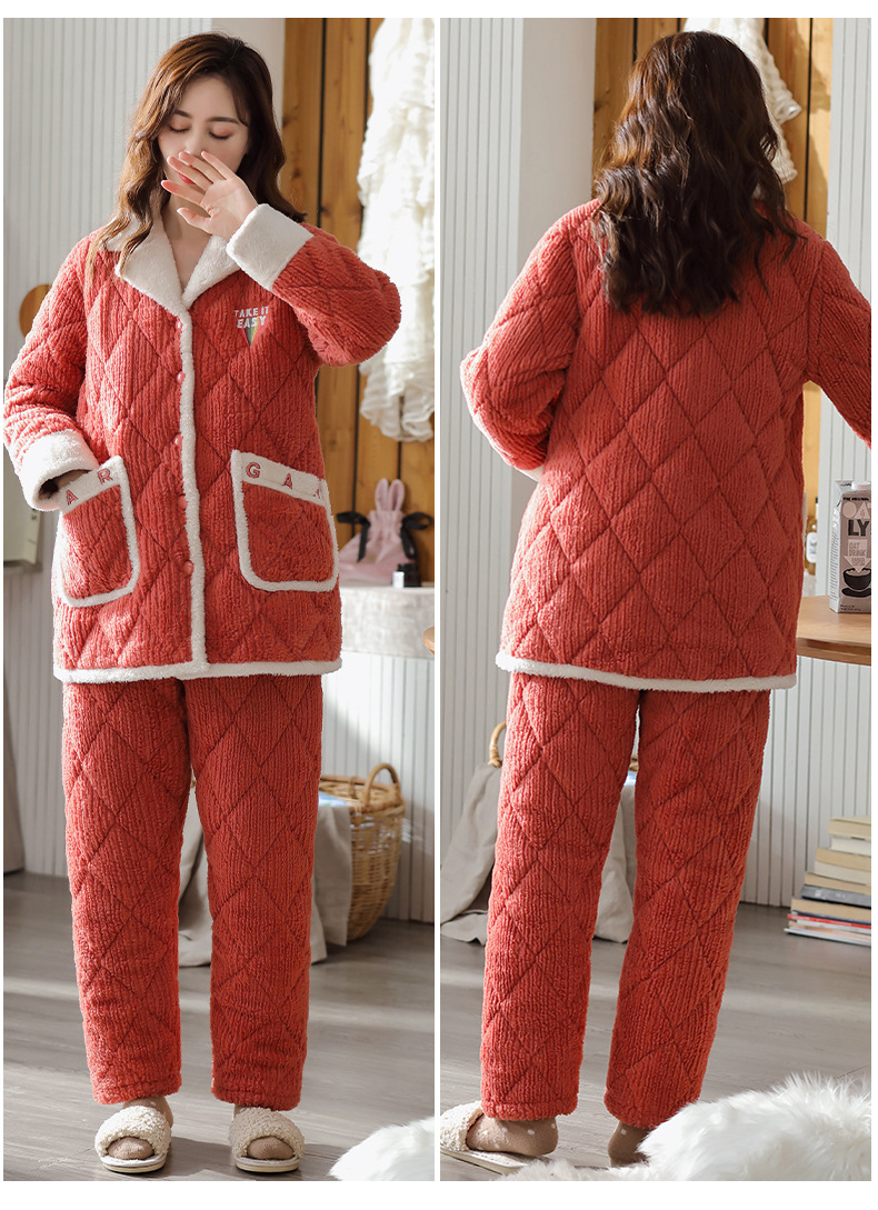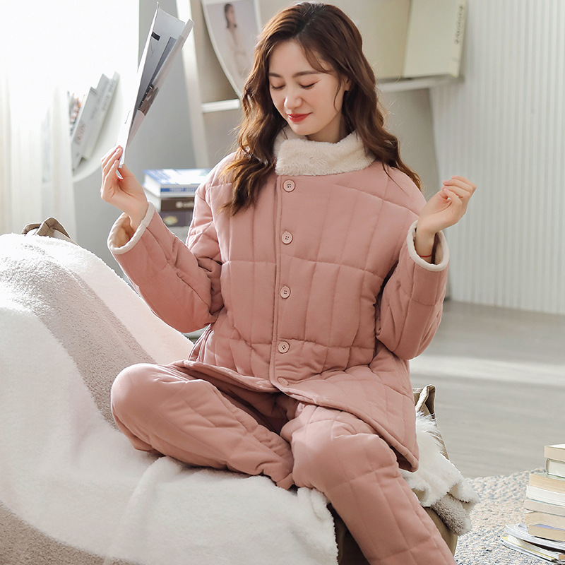 새로운 스타일 잠옷 여성의 겨울 산호 양털 3 층 면화 패딩 재킷 기모 따뜻한 플란넬 홈 옷 세트