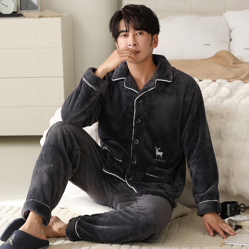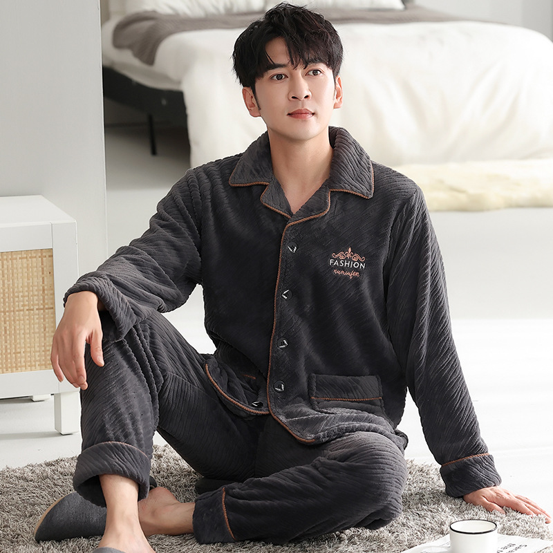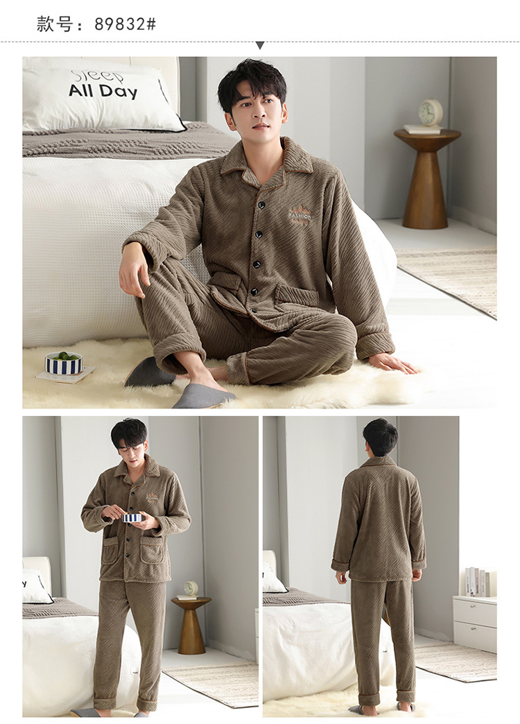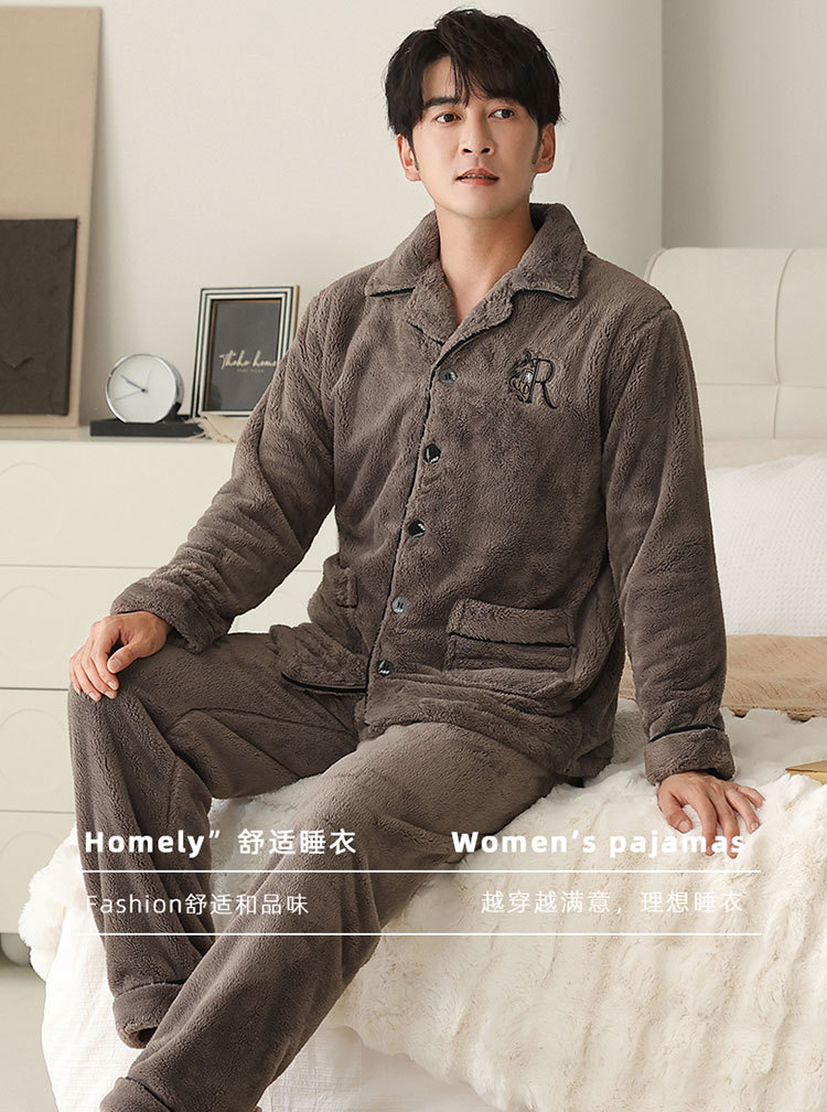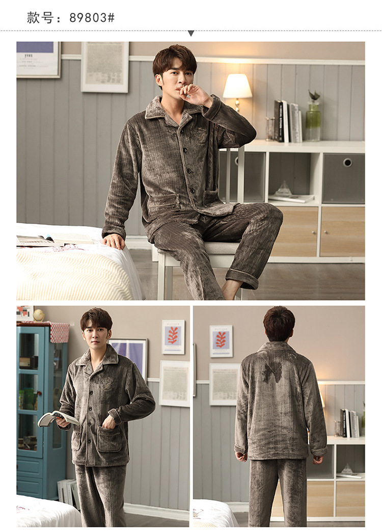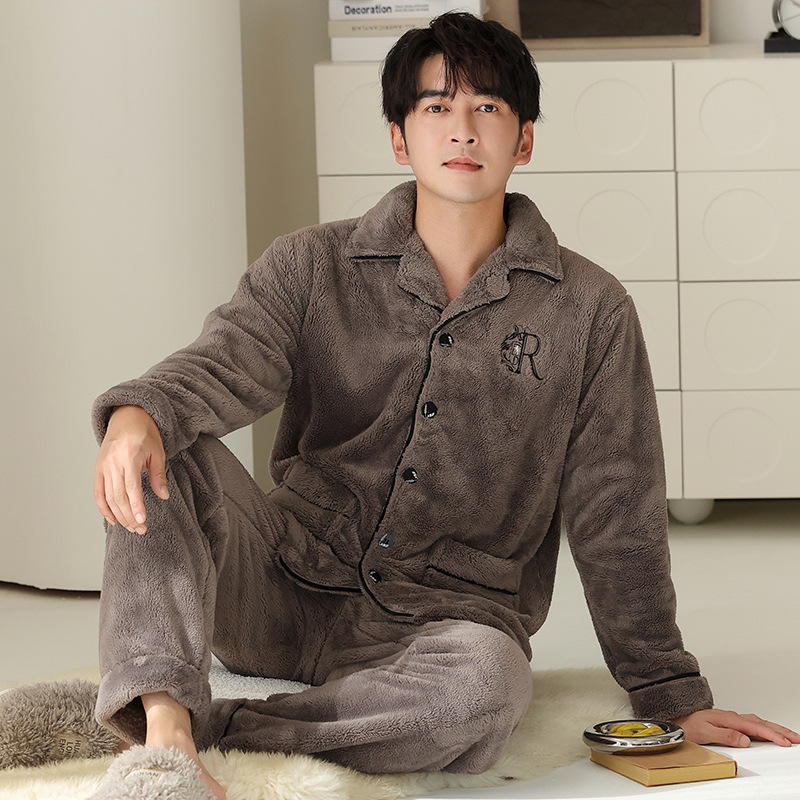 잠옷 남자의 겨울 산호 양털 기모 두꺼운 새로운 따뜻한 플란넬 카디건 간단한 스타일 홈 의류 세트스토어 가기