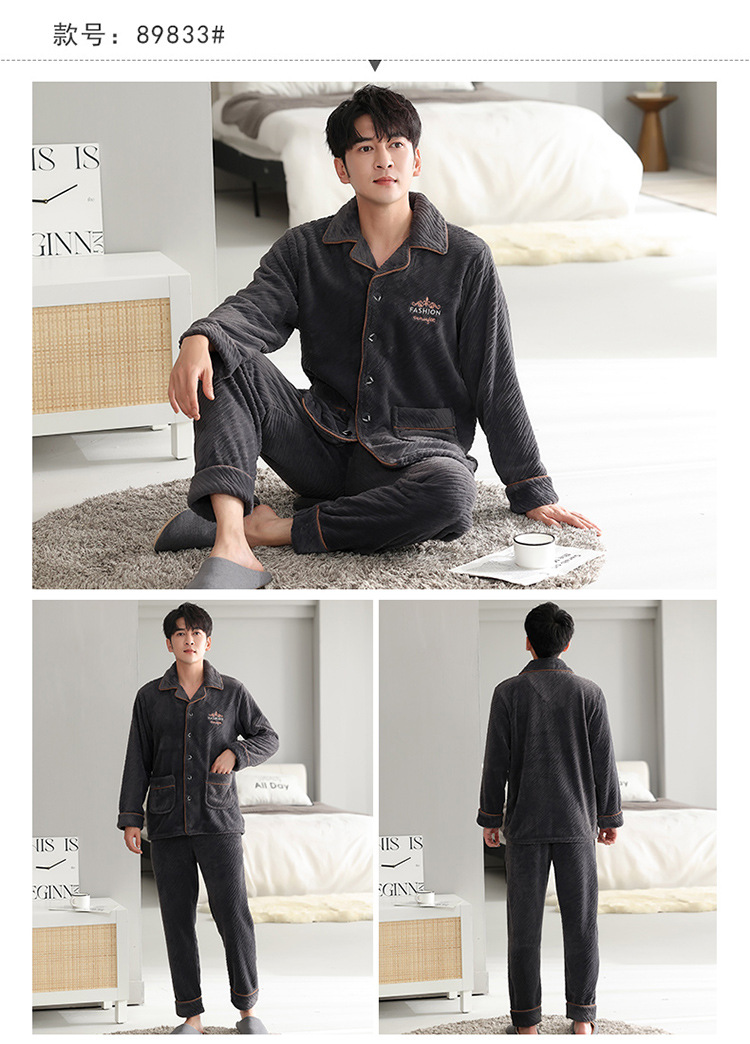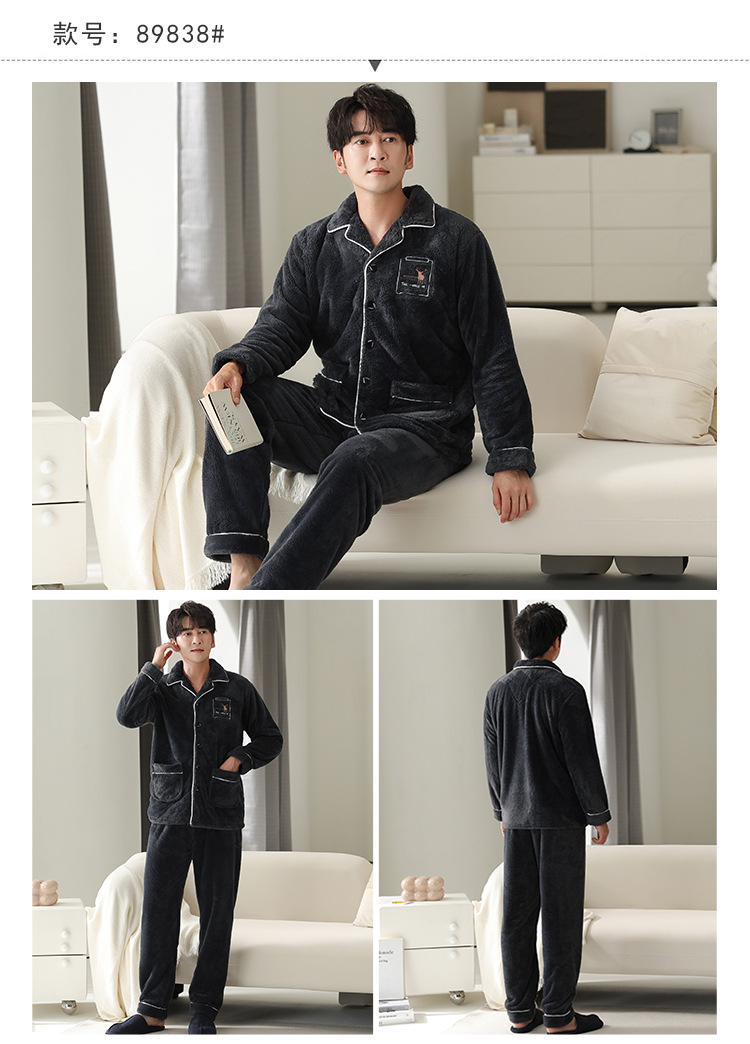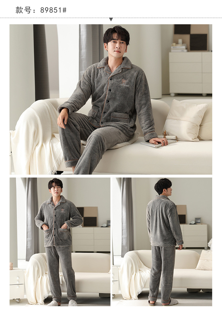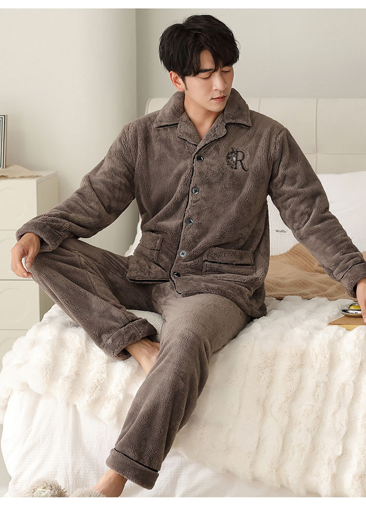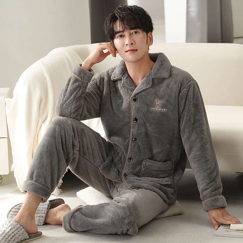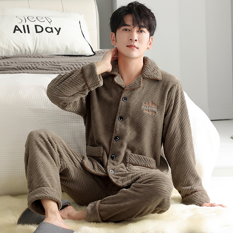 잠옷 남자의 겨울 산호 양털 기모 두꺼운 새로운 따뜻한 플란넬 카디건 간단한 스타일 홈 의류 세트스토어 가기