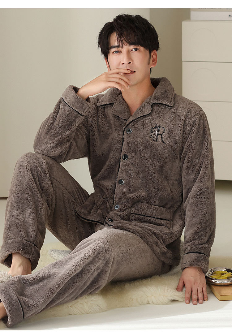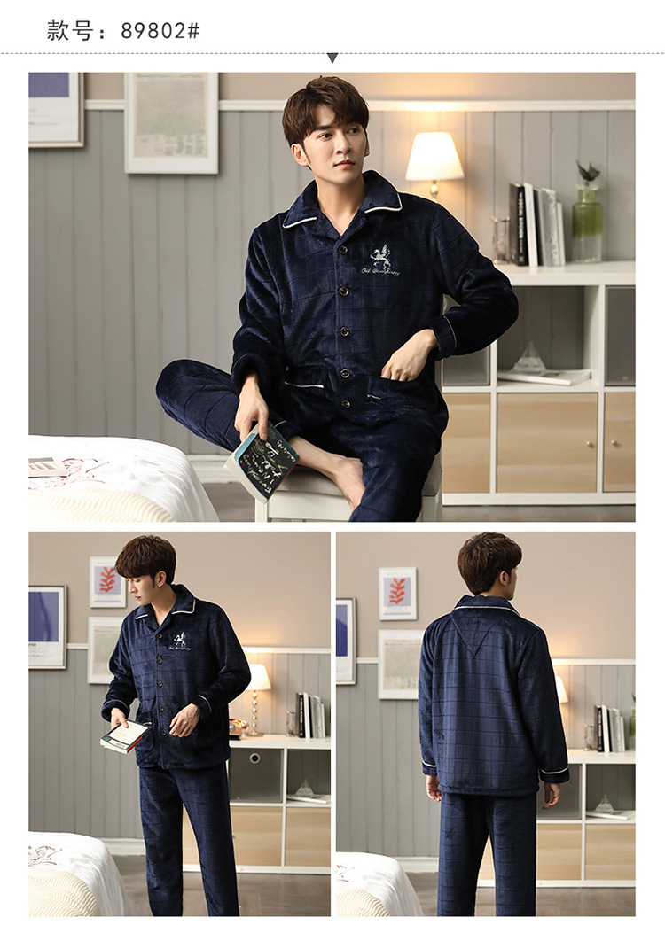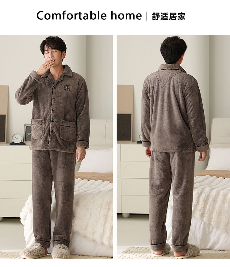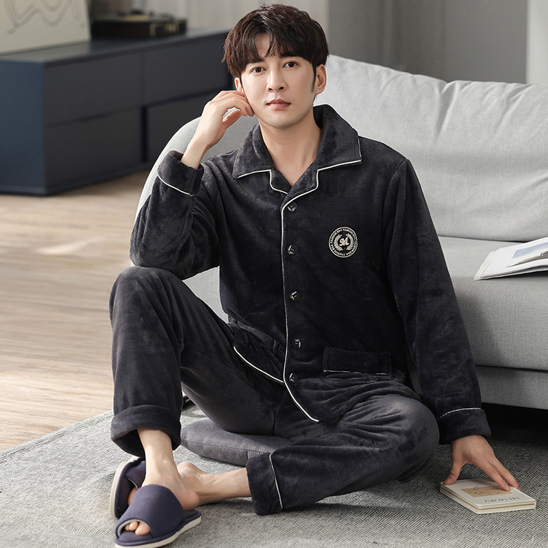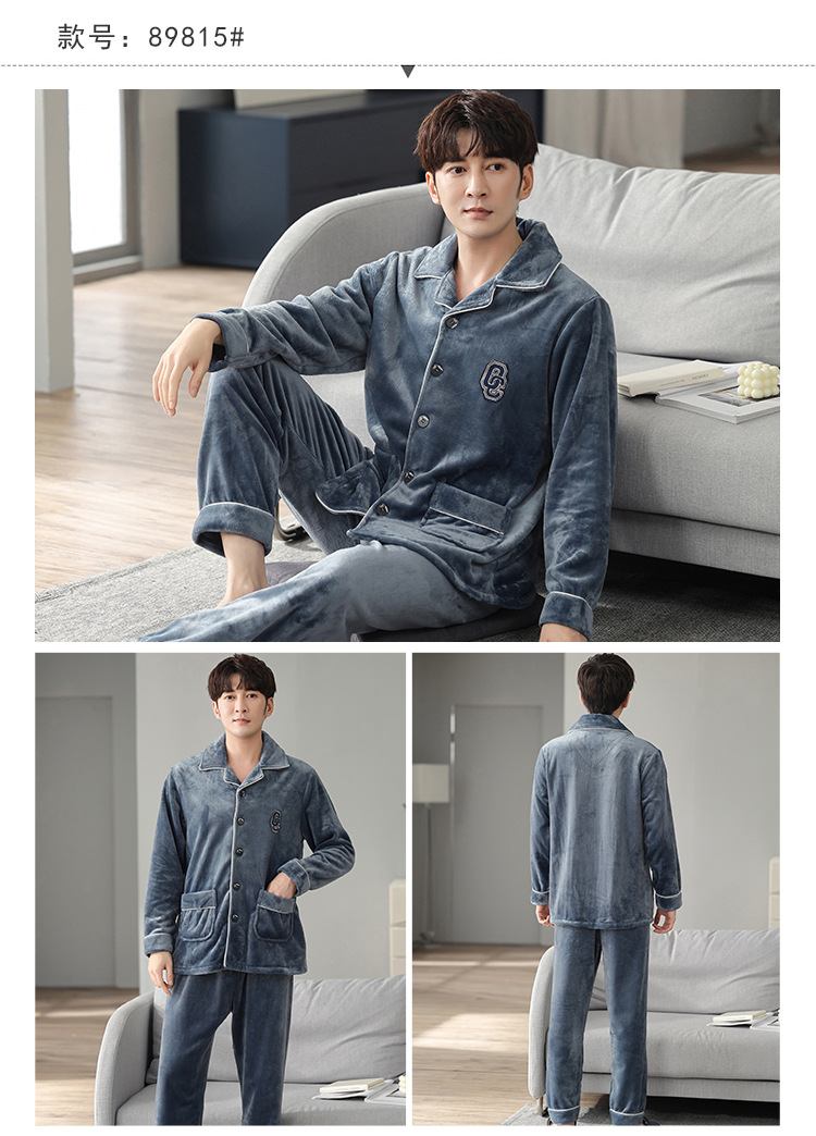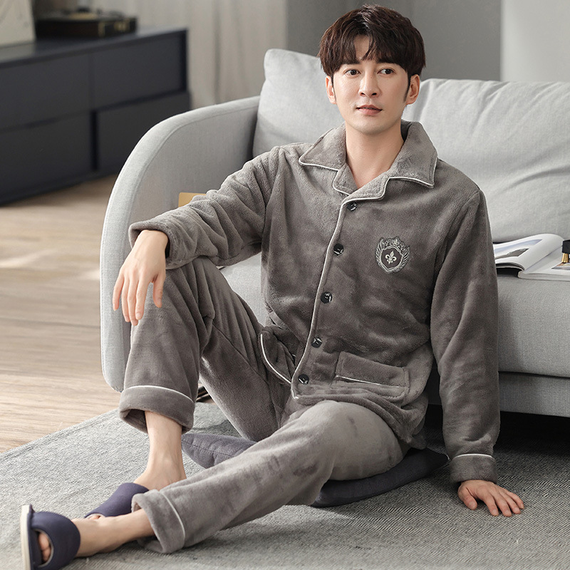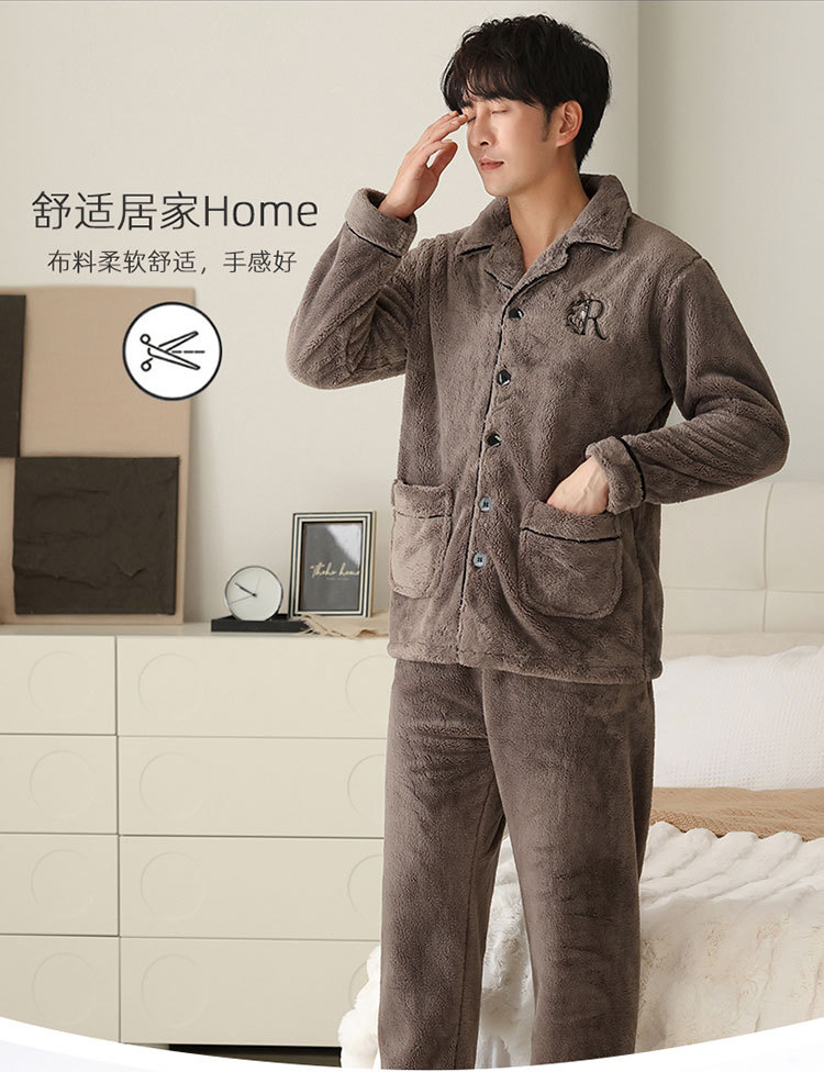 잠옷 남자의 겨울 산호 양털 기모 두꺼운 새로운 따뜻한 플란넬 카디건 간단한 스타일 홈 의류 세트