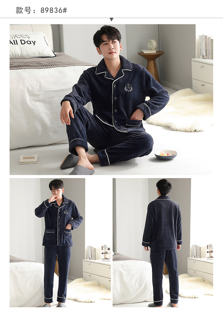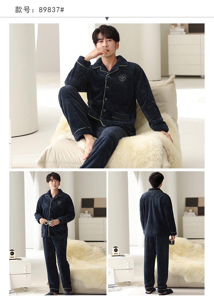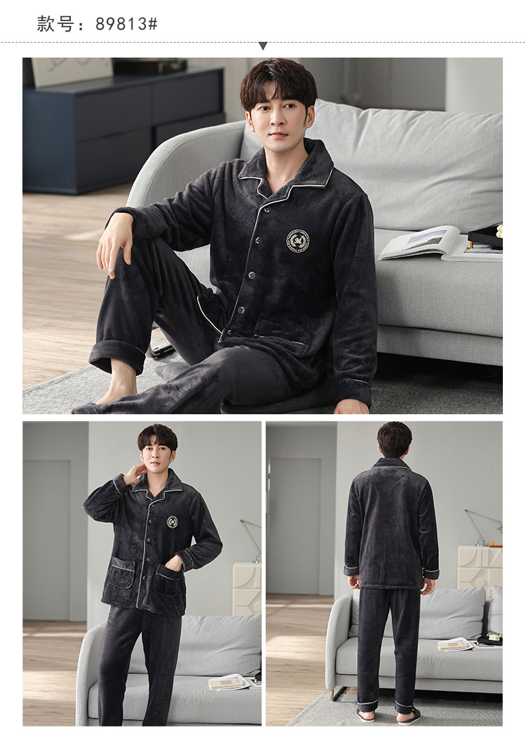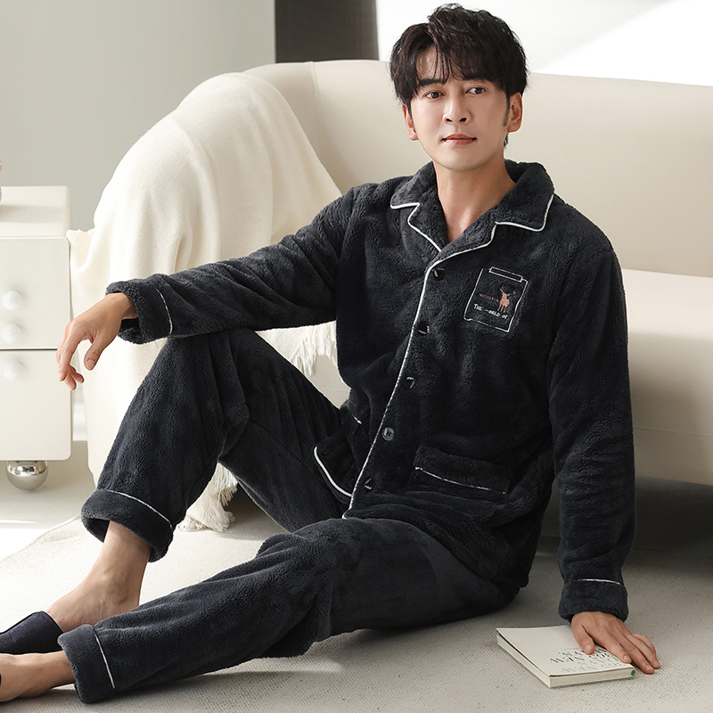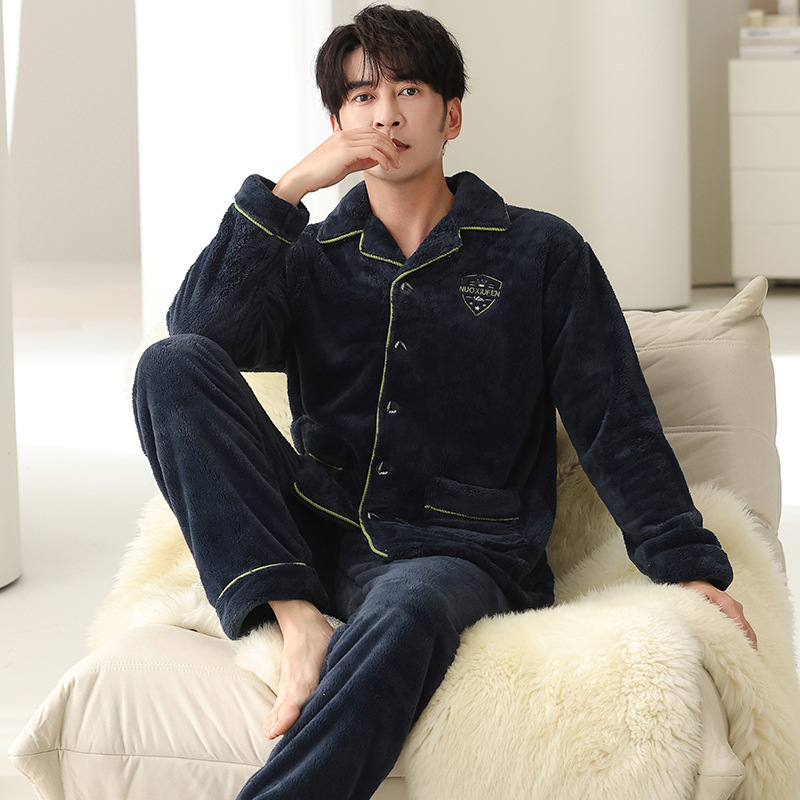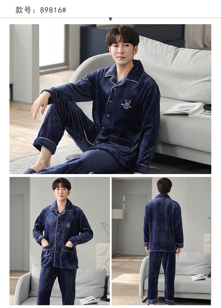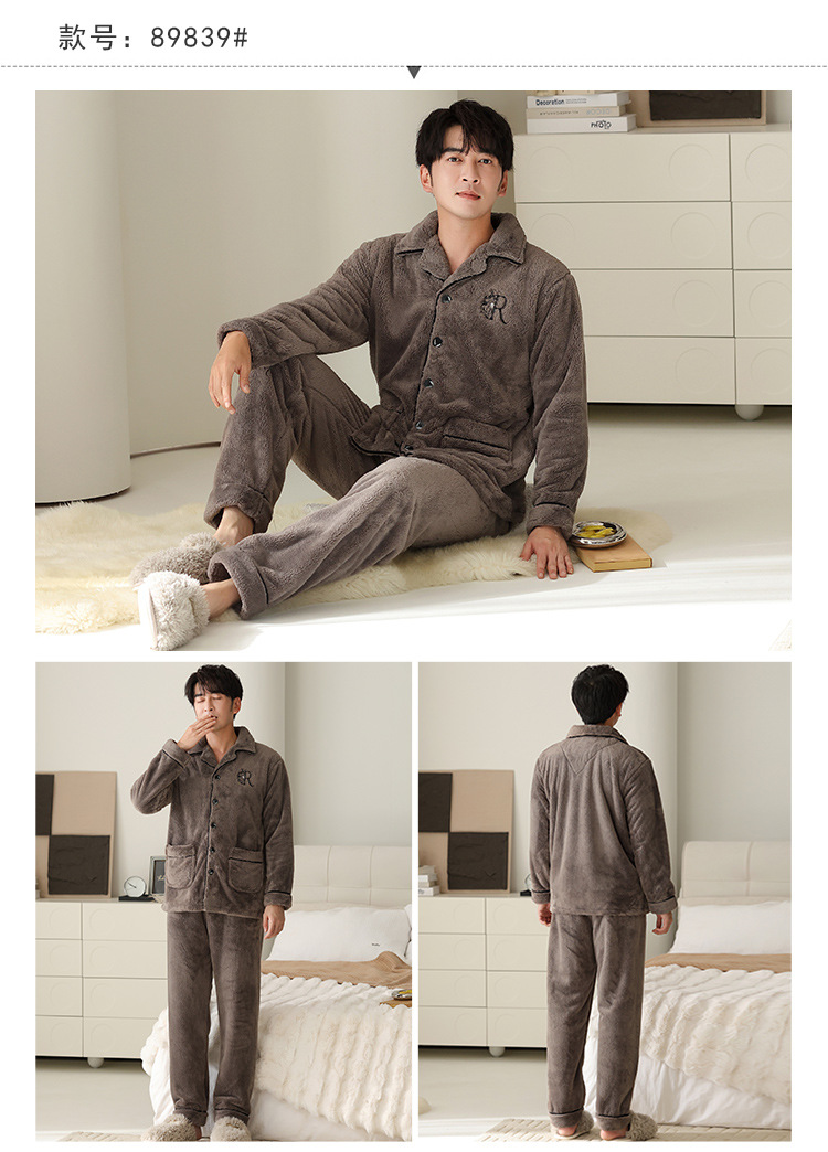 잠옷 남자의 겨울 산호 양털 기모 두꺼운 새로운 따뜻한 플란넬 카디건 간단한 스타일 홈 의류 세트