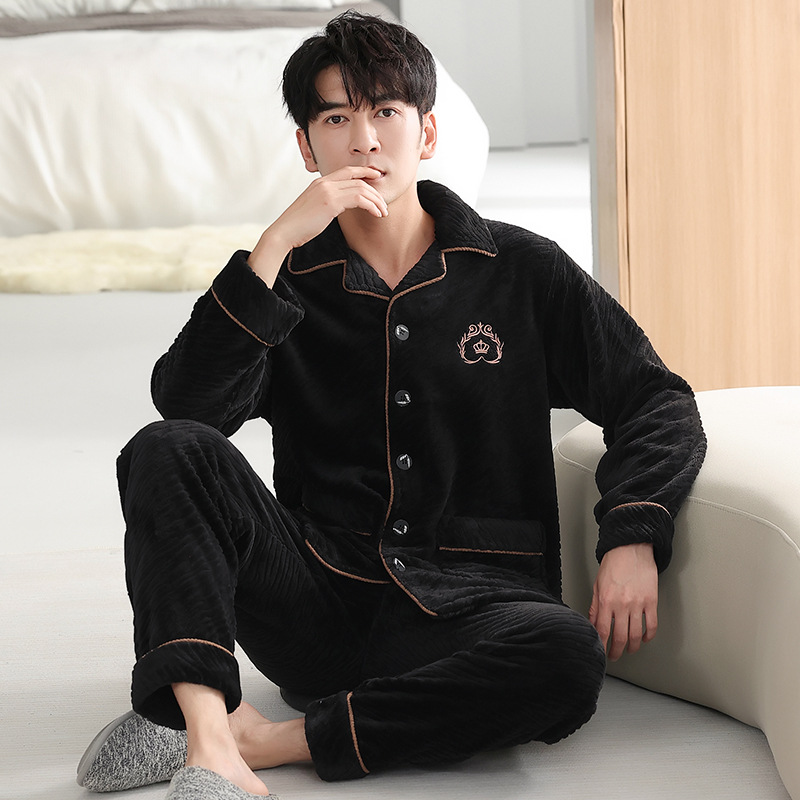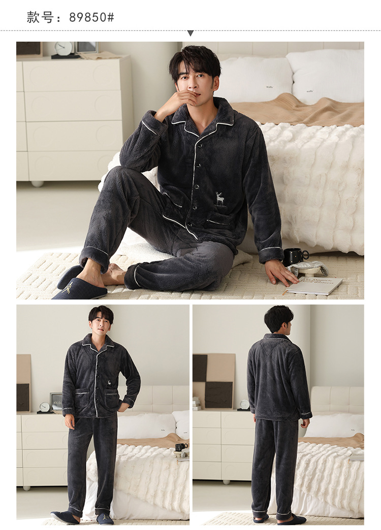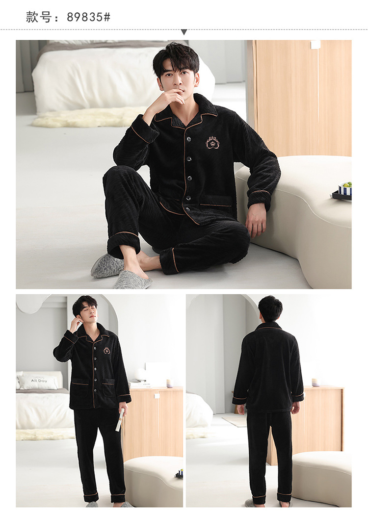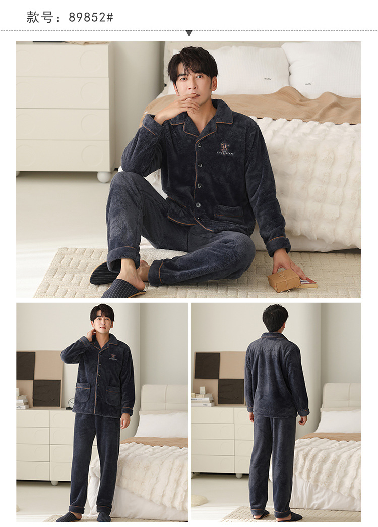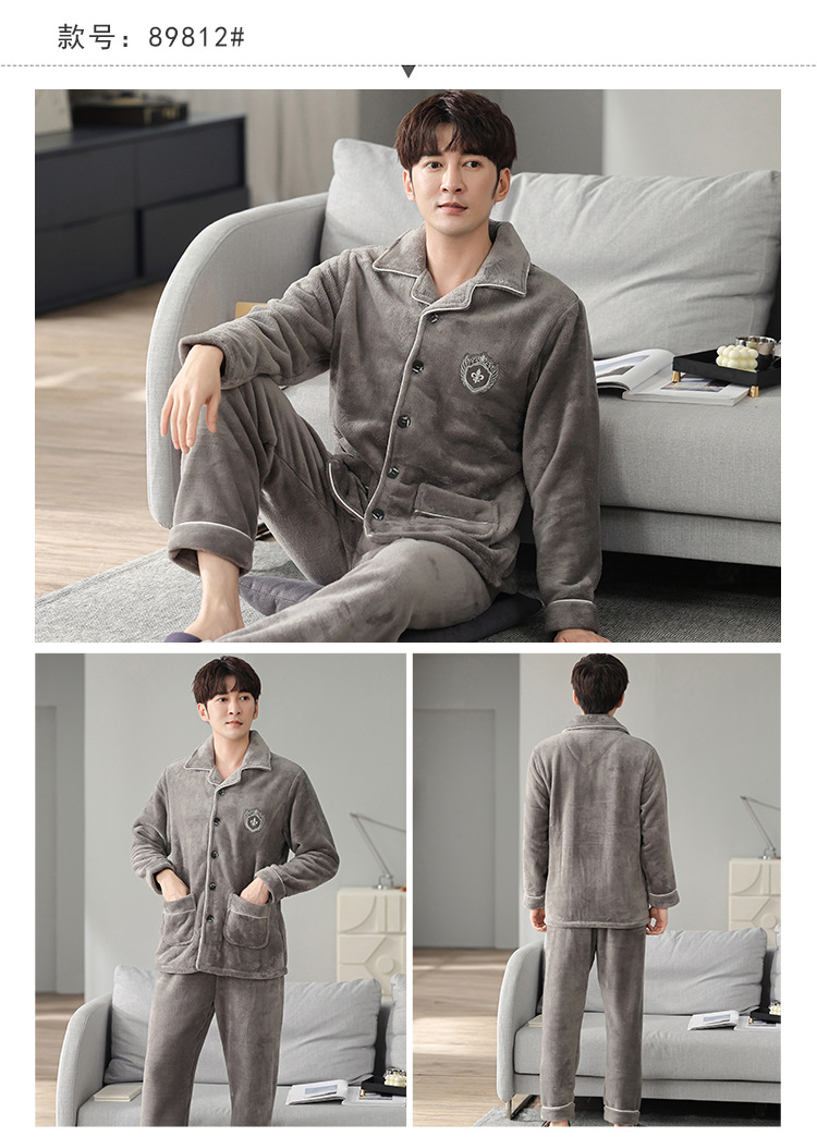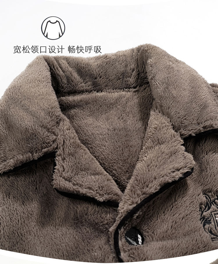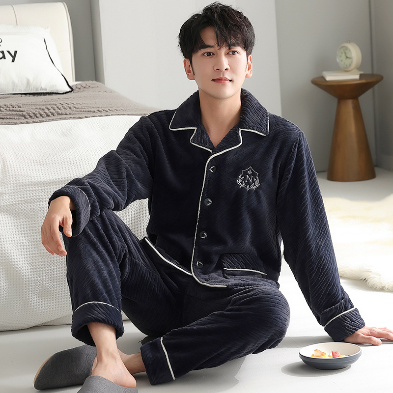 잠옷 남자의 겨울 산호 양털 기모 두꺼운 새로운 따뜻한 플란넬 카디건 간단한 스타일 홈 의류 세트