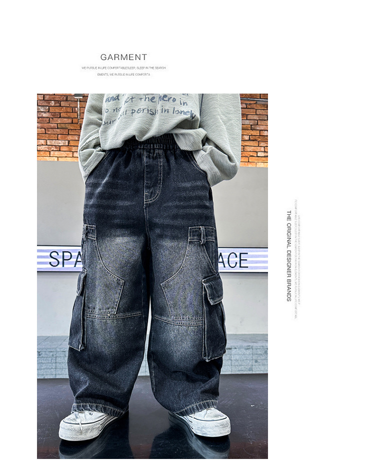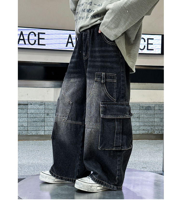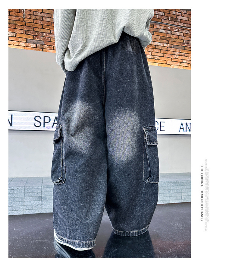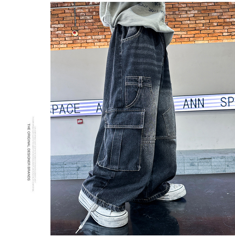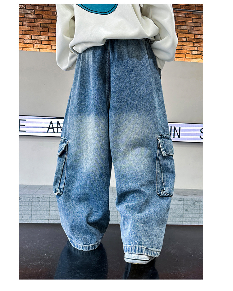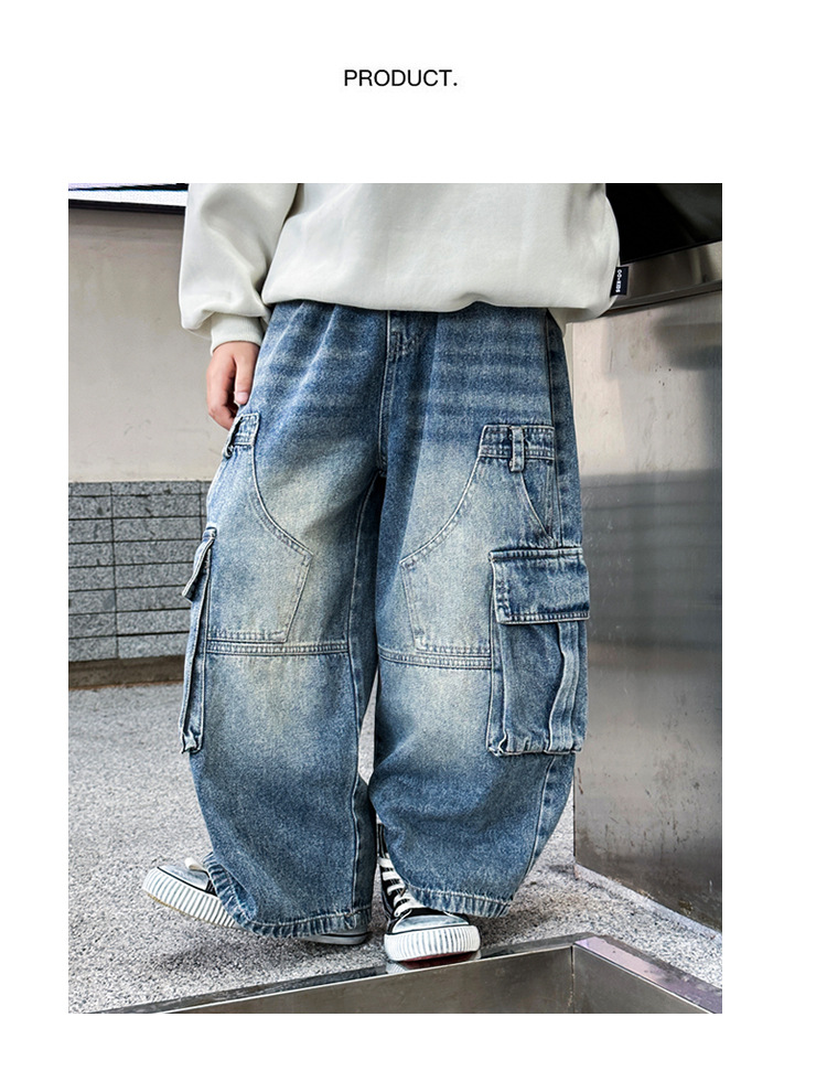 소년 복고풍 청바지 봄, 가을 2025 새로운 스타일 중대형 어린이 스트리트 핸섬 스트레이트 루즈 와이드 팬츠