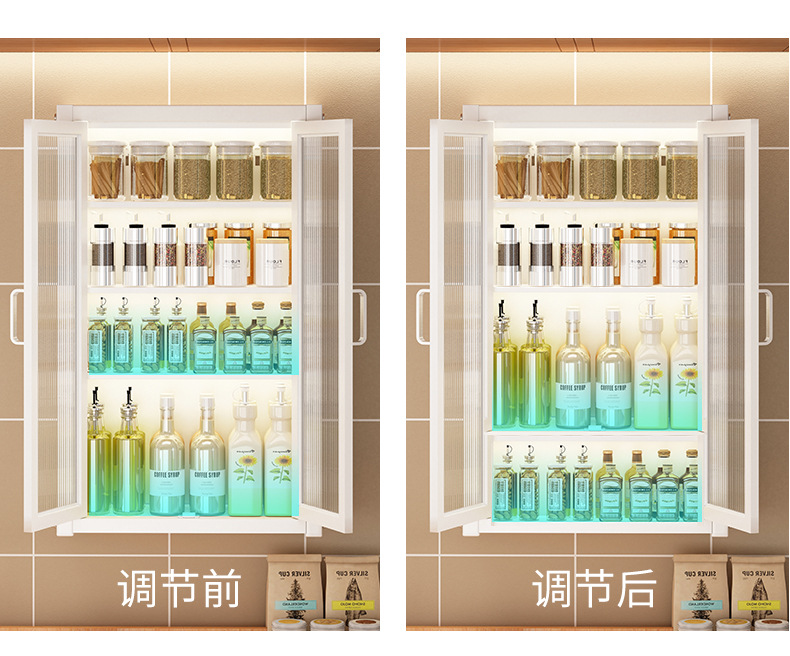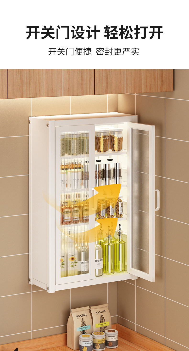 조미료 보관 용 캐비닛 도어 조미료 보관 랙을 갖춘 벽에 장착 된 손톱이없는 주방 보관 캐비닛 방진스토어 가기
