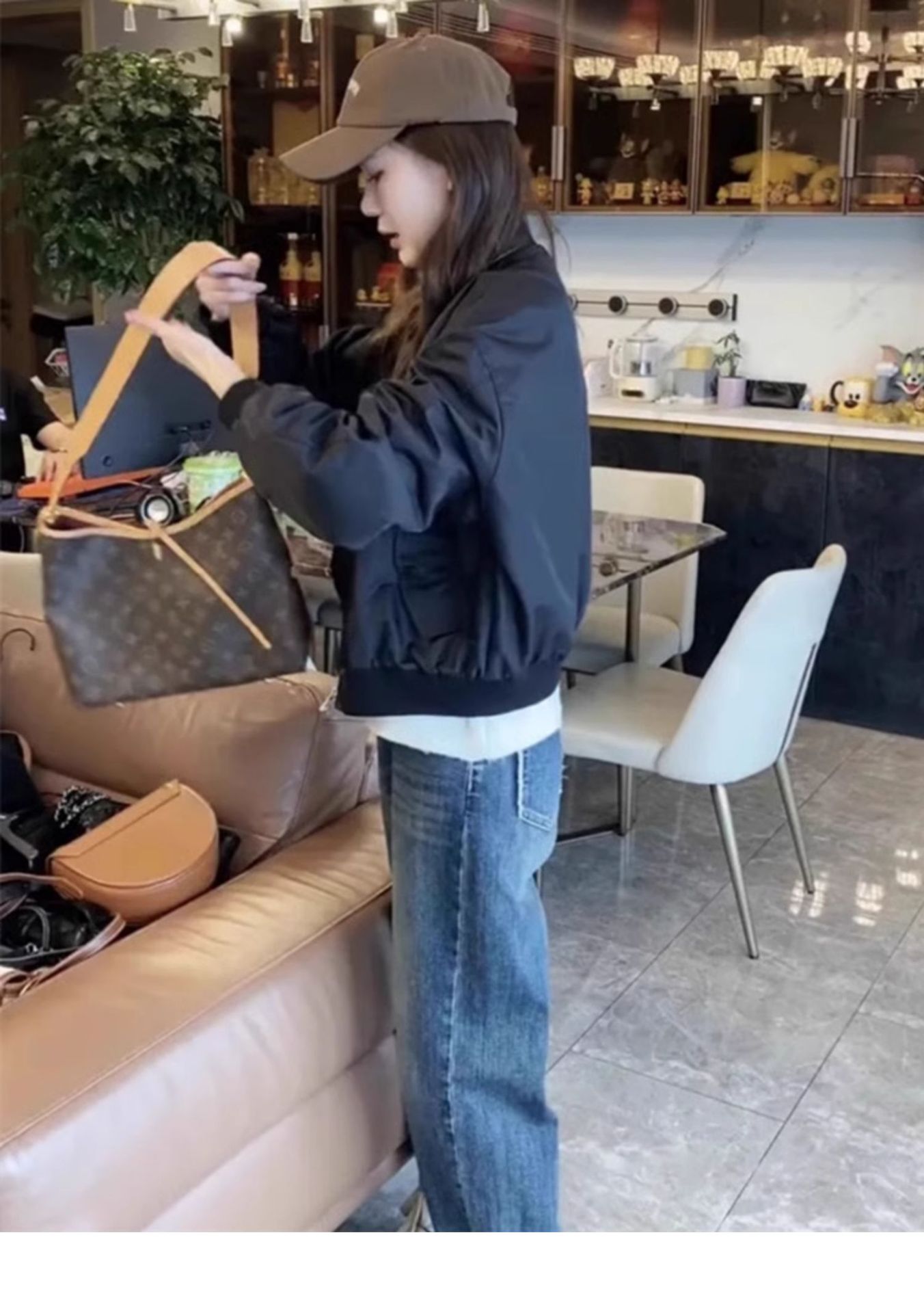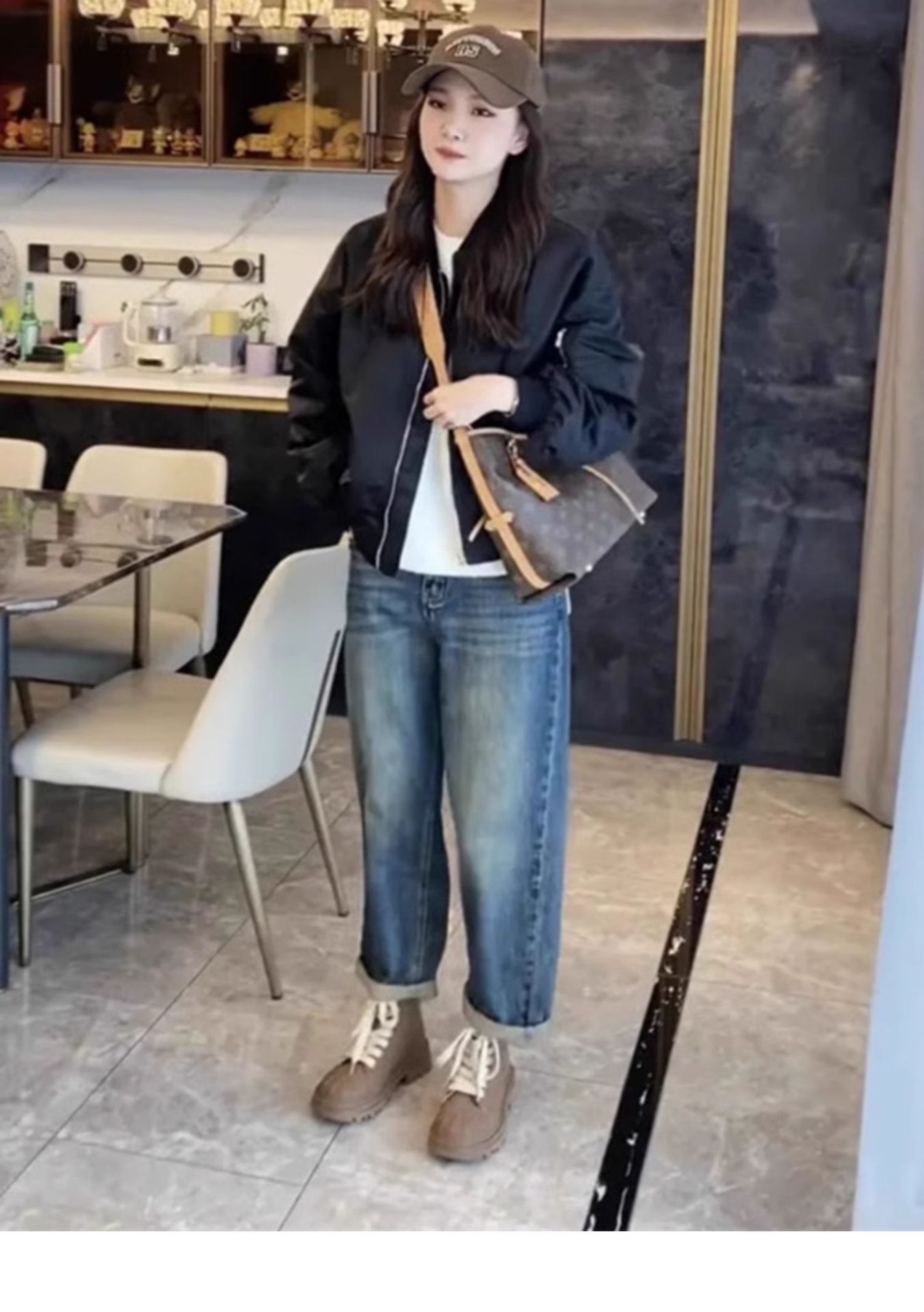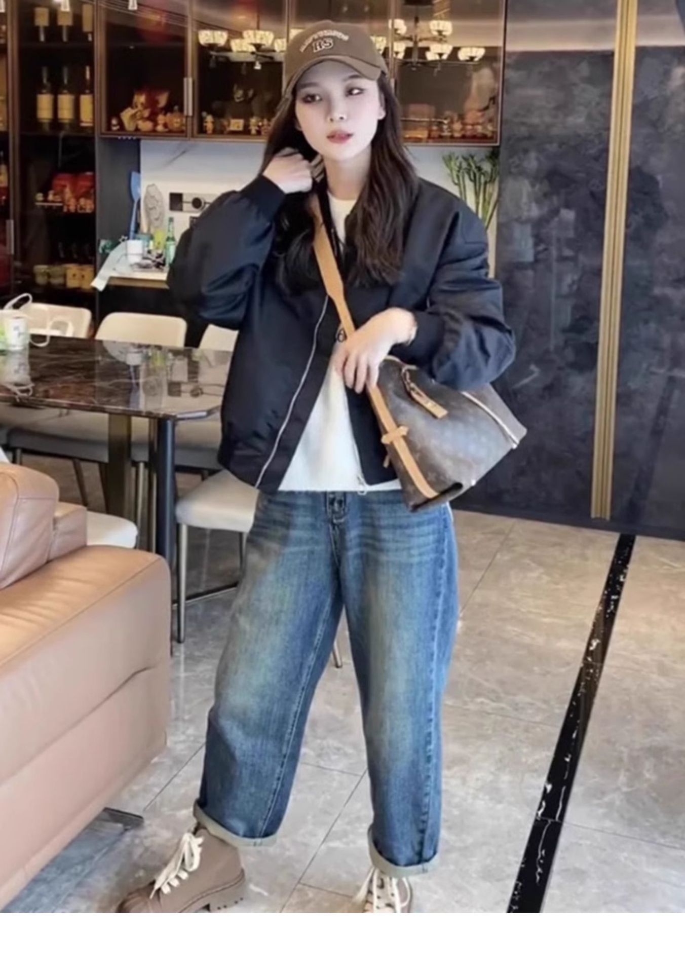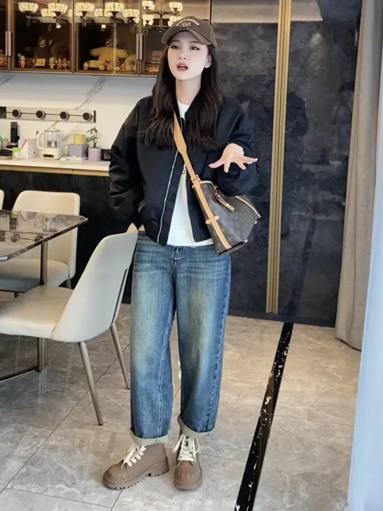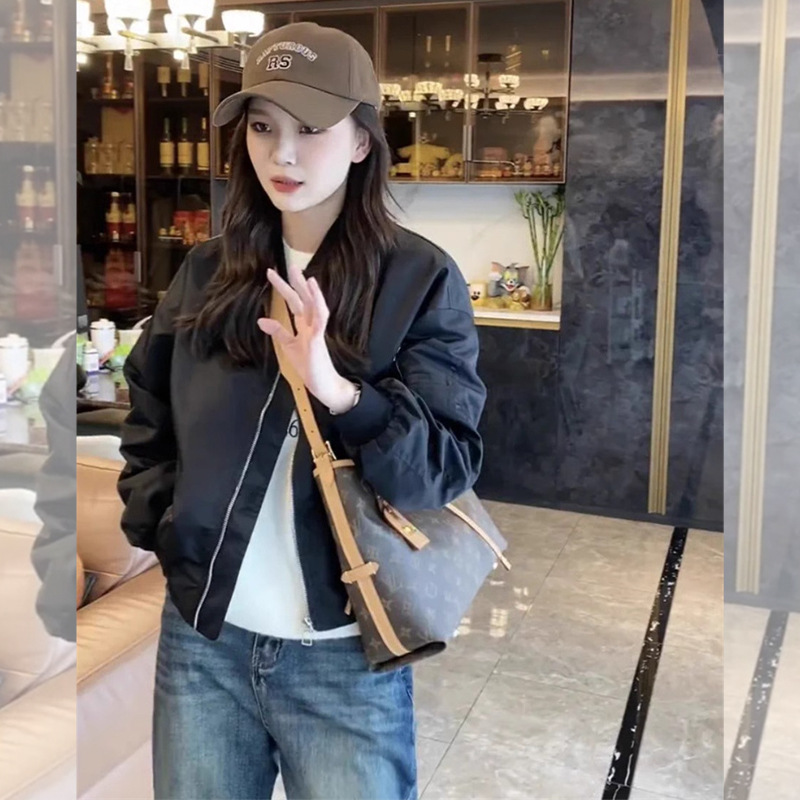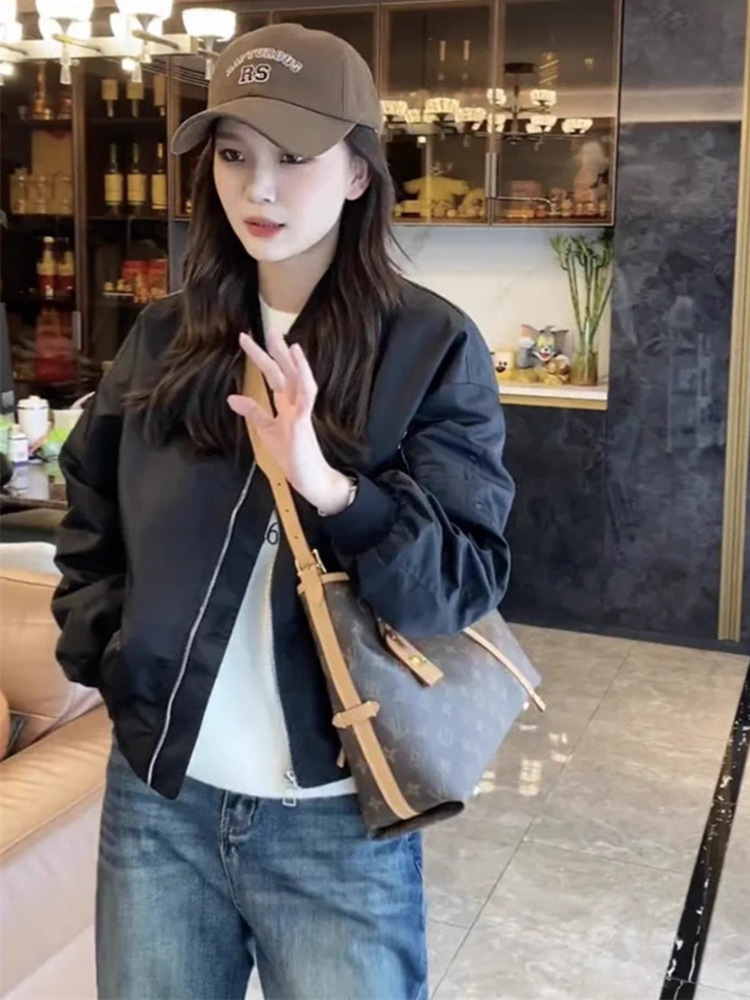 가을 의류 2024 새로운 스타일 짧은 캐주얼 작업 재킷 블랙 스탠드 칼라 야구 재킷 여성 봄, 가을 스타일스토어 가기