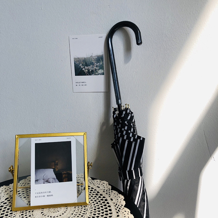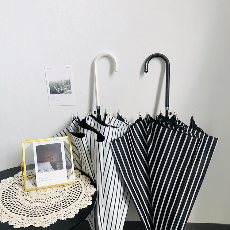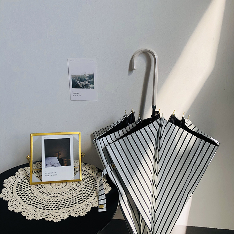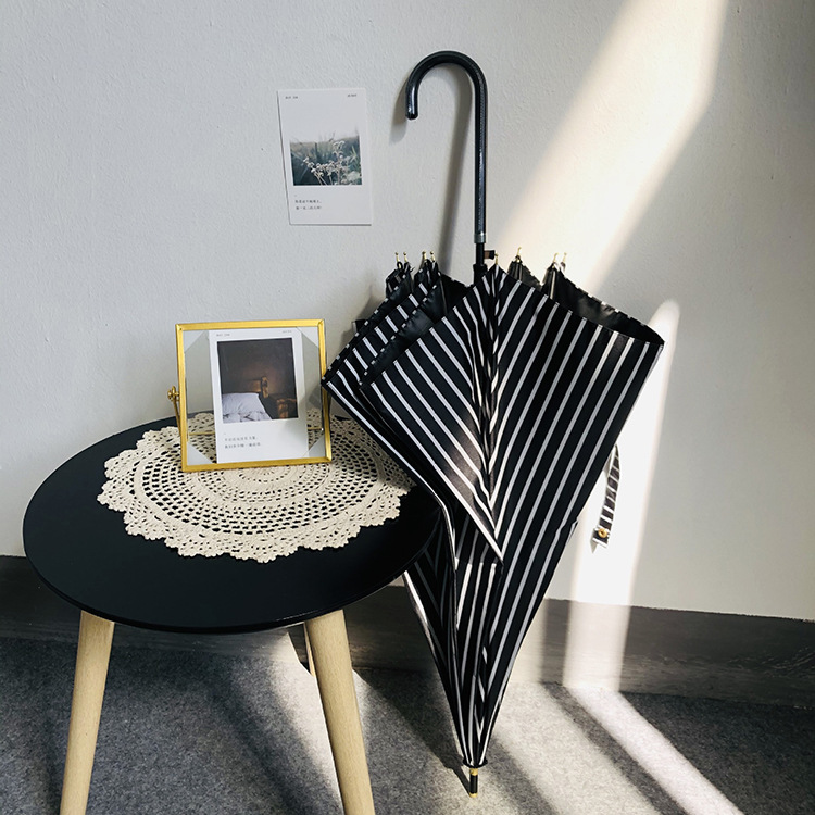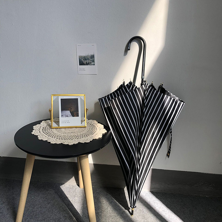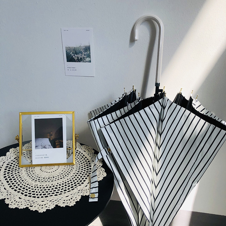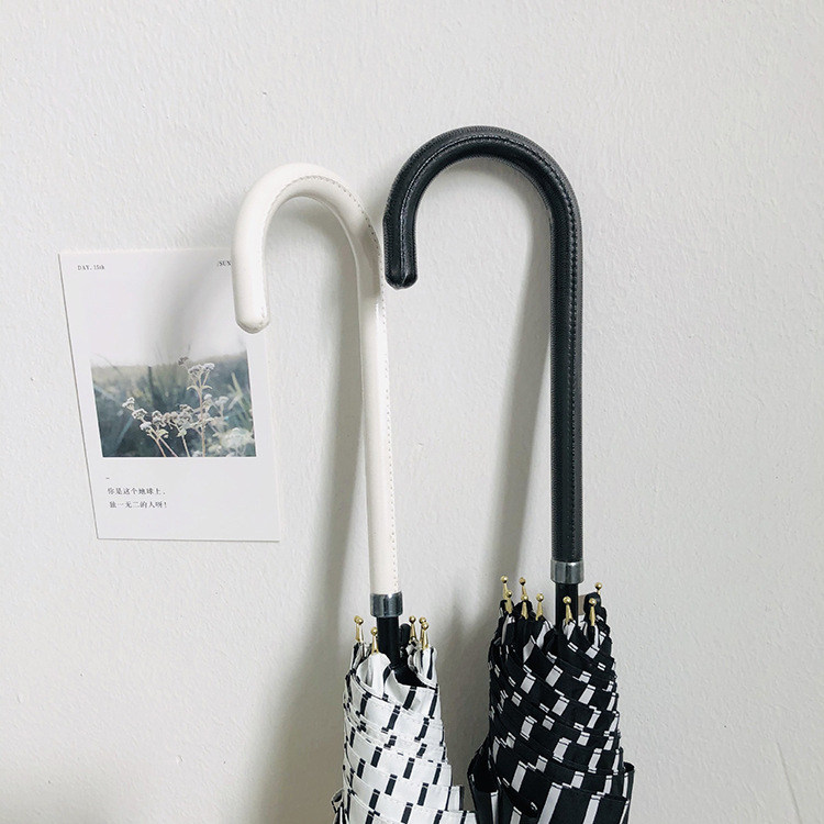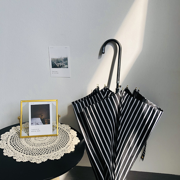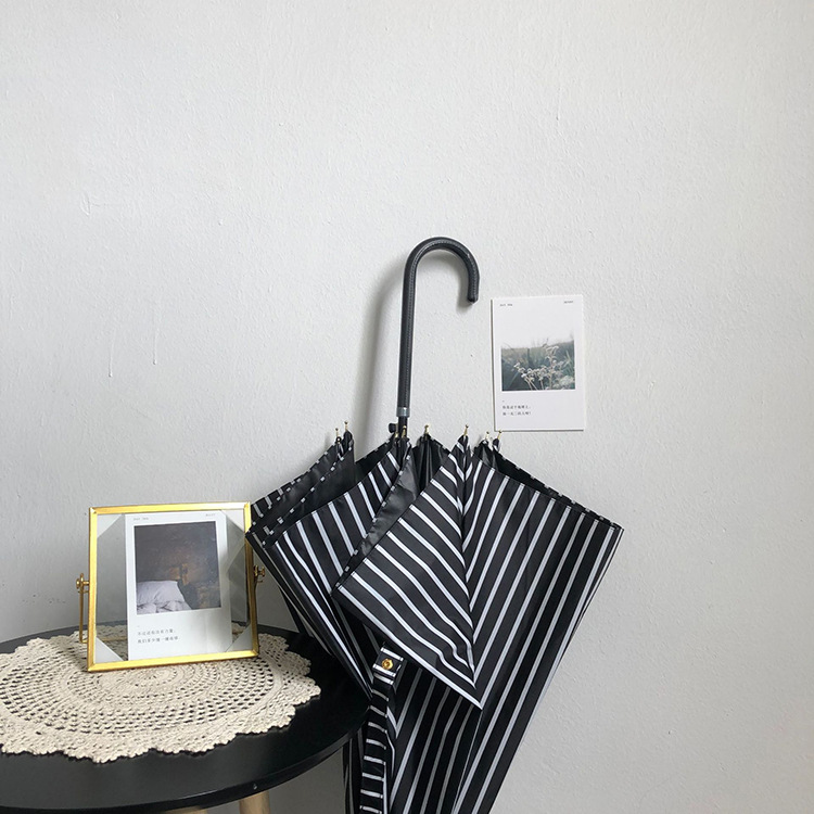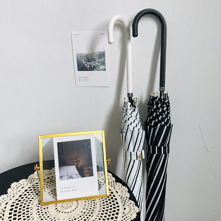 일본 Ins 블랙 롱 핸들 차양 크리 에이 티브 가죽 곡선 핸들 스트레이트 우산 섬유 선 스크린 및 비 우산스토어 가기
