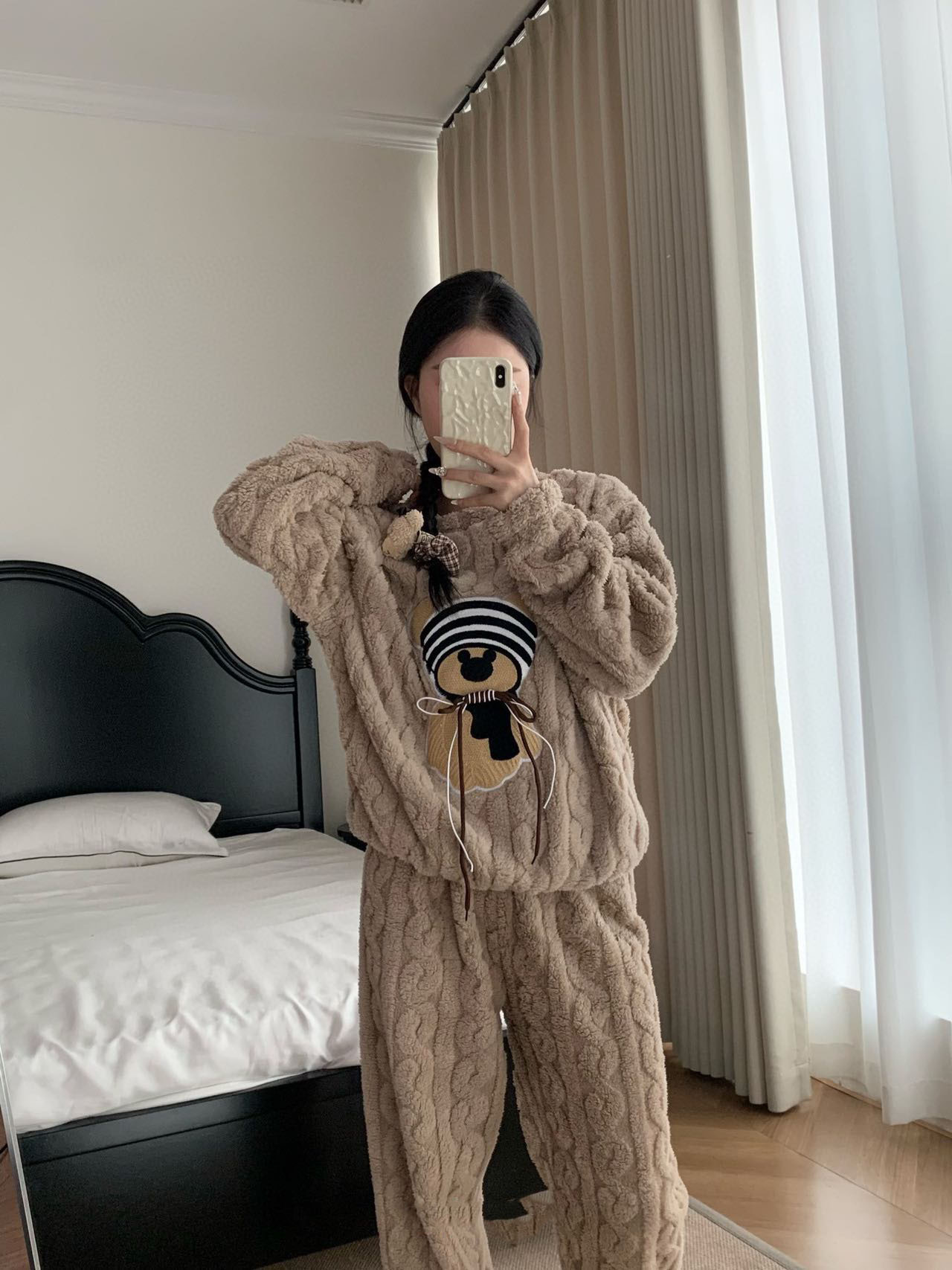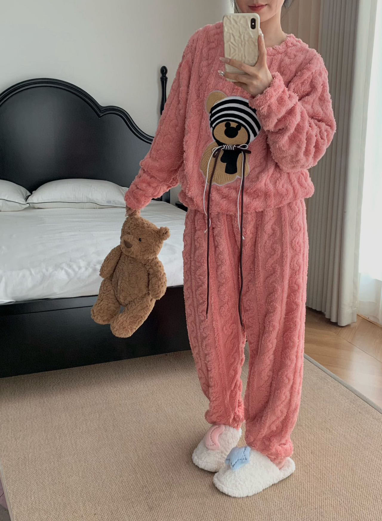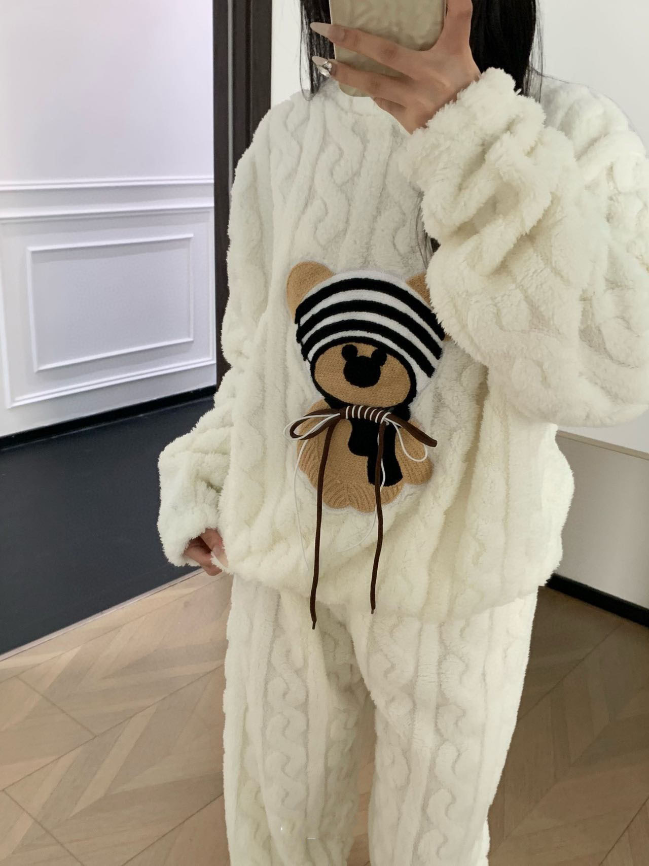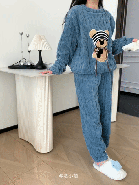 가을, 겨울 새로운 새로운 산호 벨벳 플란넬 만화 귀여운 바보 곰 패션 홈웨어 잠옷 긴팔 바지
