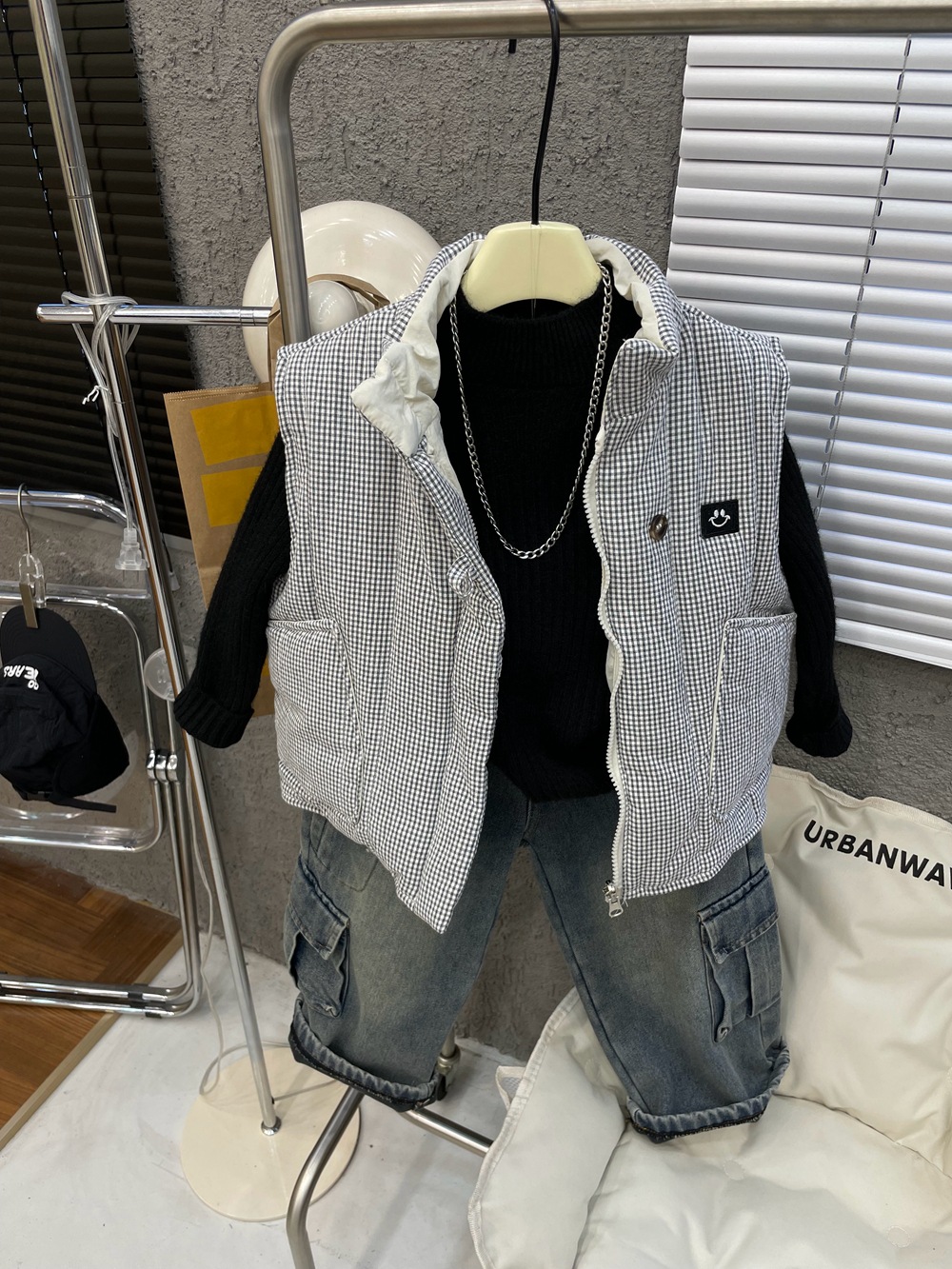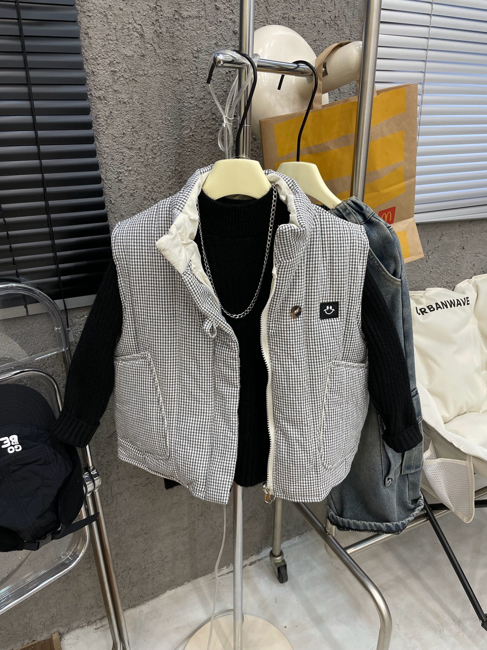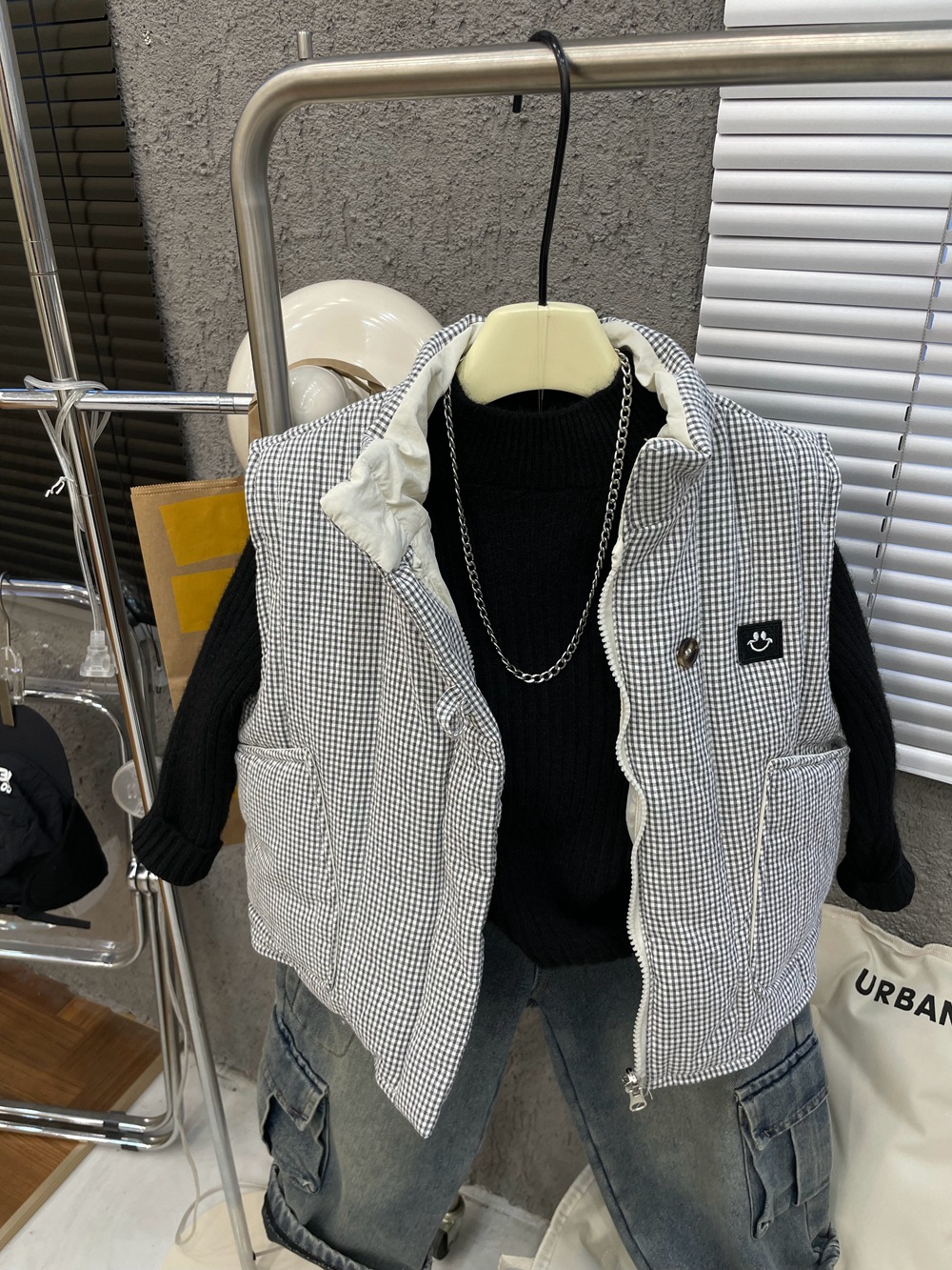 작은 격자 무늬 스마일리 라벨 코튼 조끼 재킷 2024 겨울 새 소년과 소녀 올 매치 코튼 조끼 트렌디 한 외복
