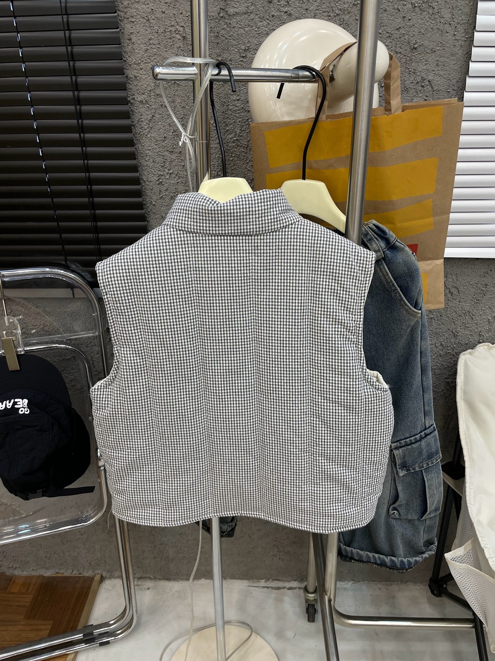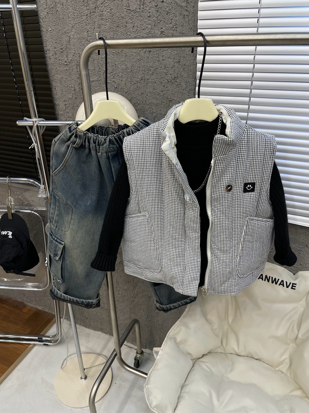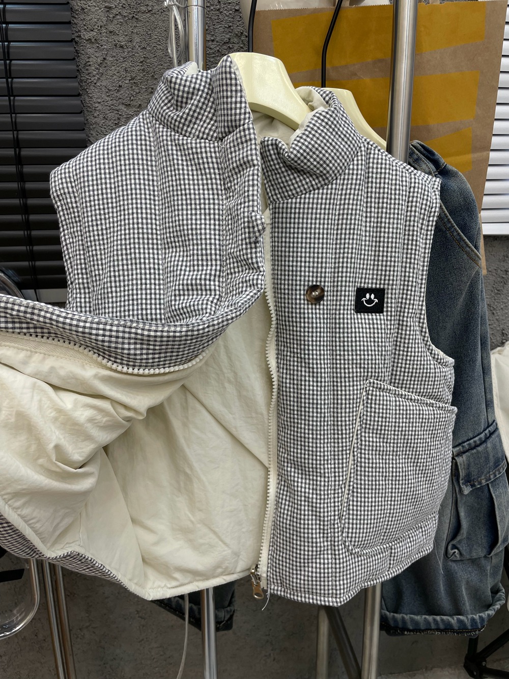 작은 격자 무늬 스마일리 라벨 코튼 조끼 재킷 2024 겨울 새 소년과 소녀 올 매치 코튼 조끼 트렌디 한 외복