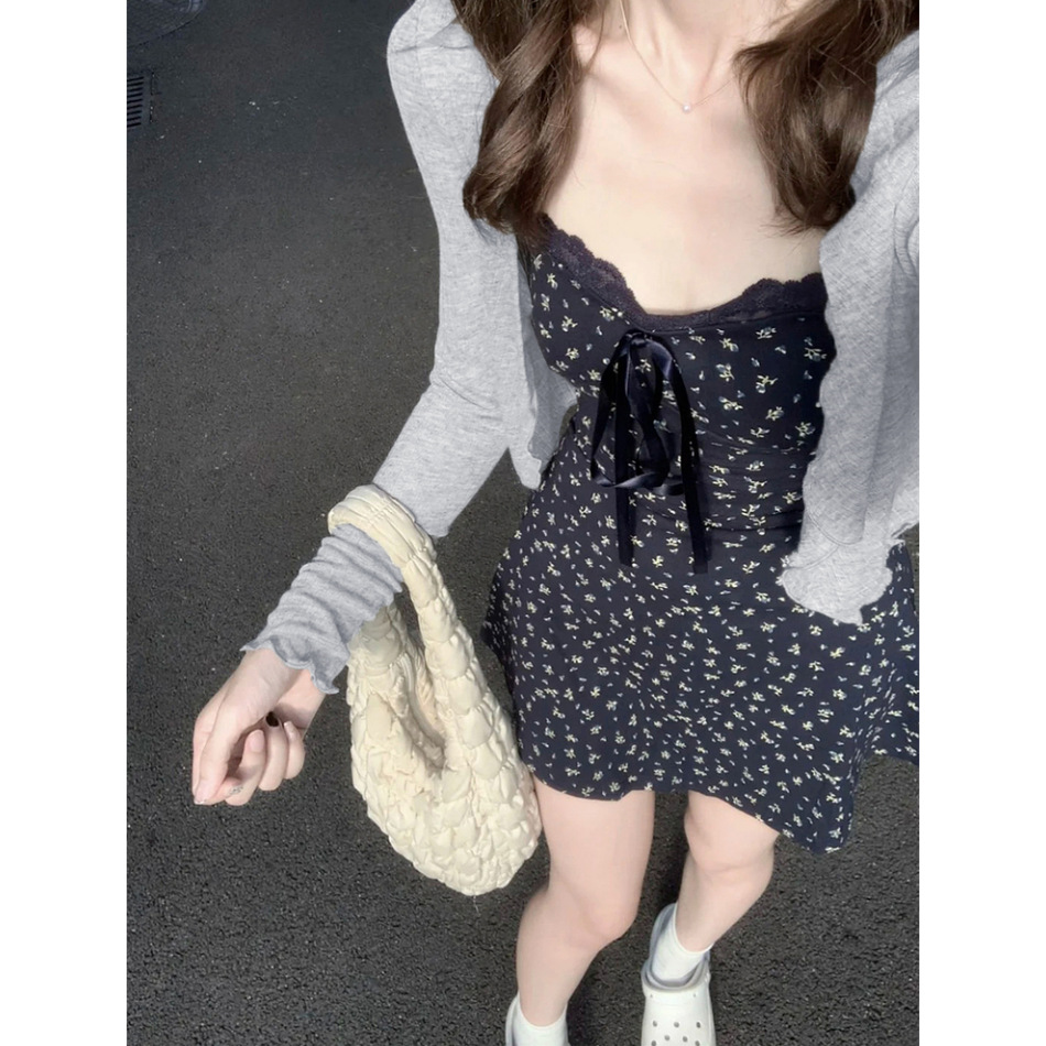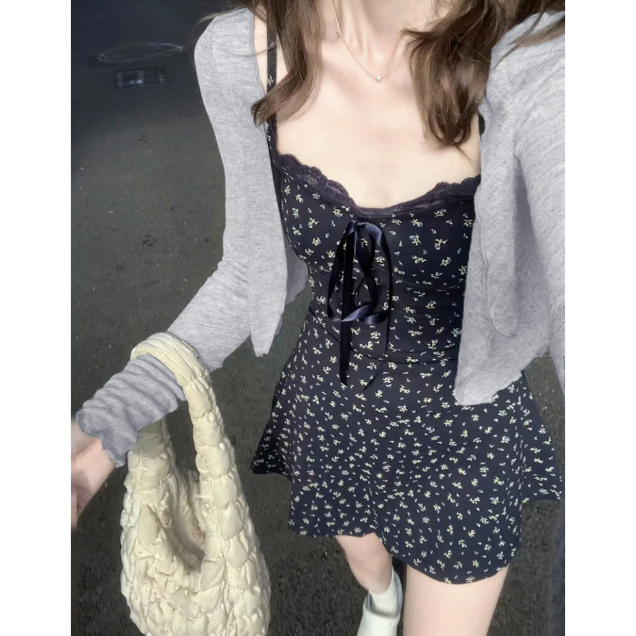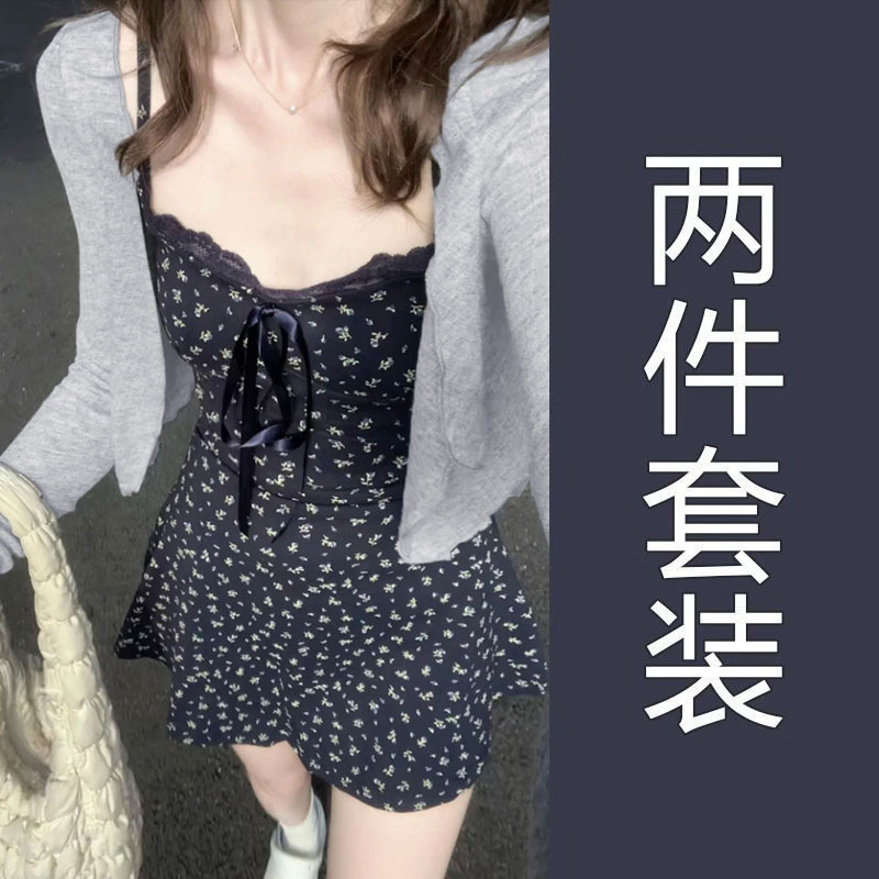 프랑스 블루 꽃 슬링 원피스 여성의 가을 새로운 하이 엔드 센스 작은 달콤한 향신료 소녀 짧은 치마 세트