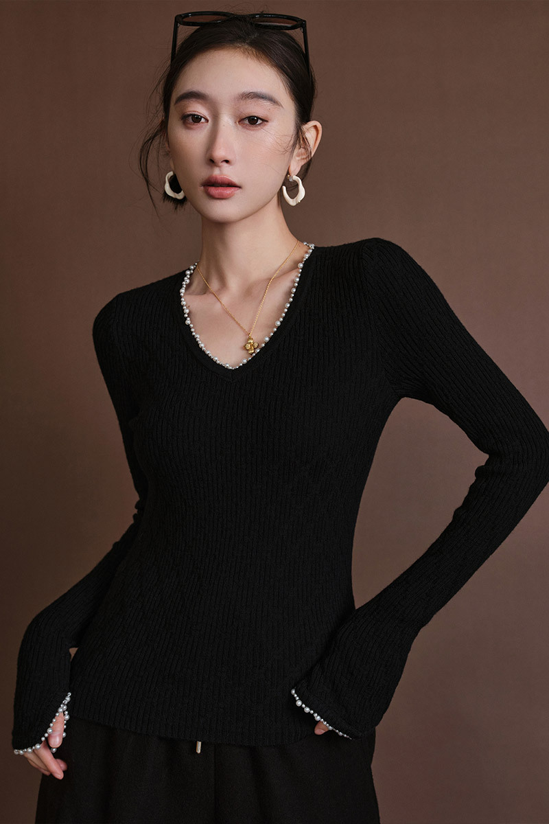 진야 의류 공장/2026 진주 블랙 브이넥 이너웨어 레트로 슬림핏 울 니트 여성용 봄