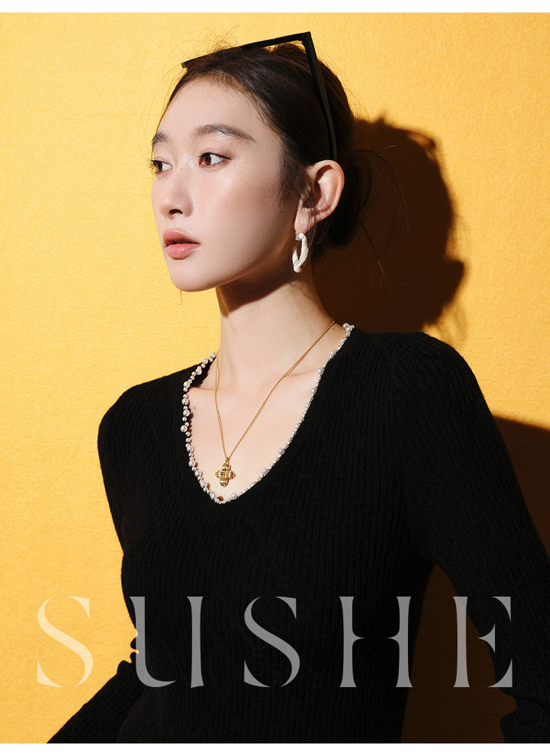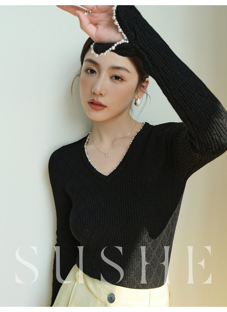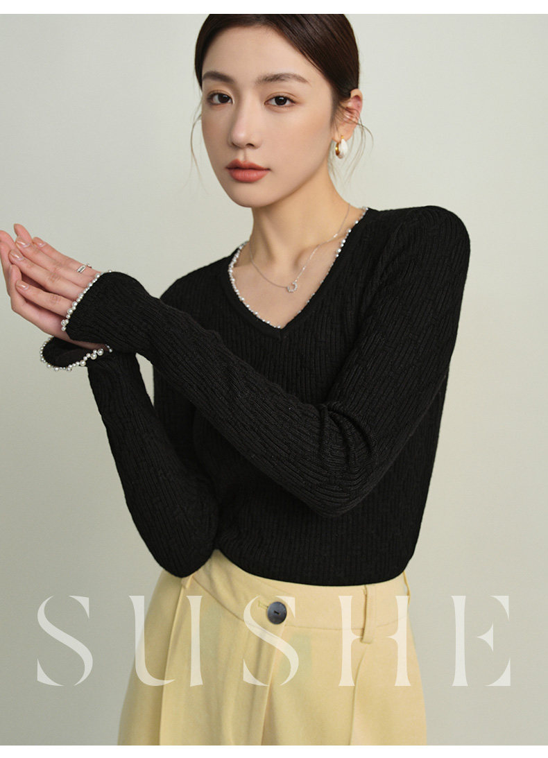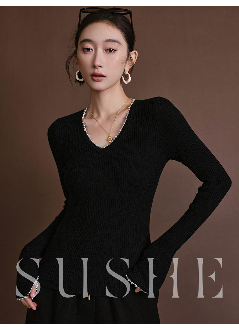 진야 의류 공장/2026 진주 블랙 브이넥 이너웨어 레트로 슬림핏 울 니트 여성용 봄스토어 가기
