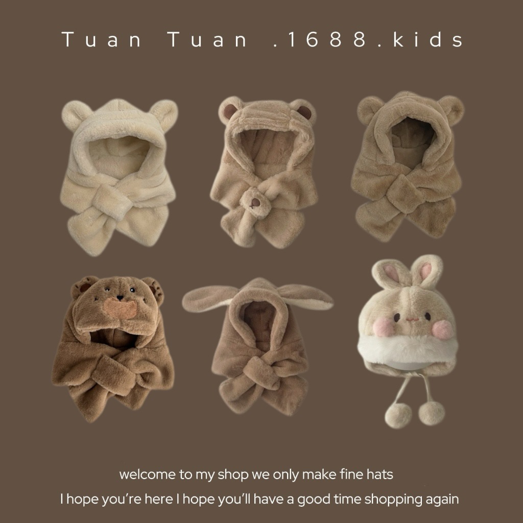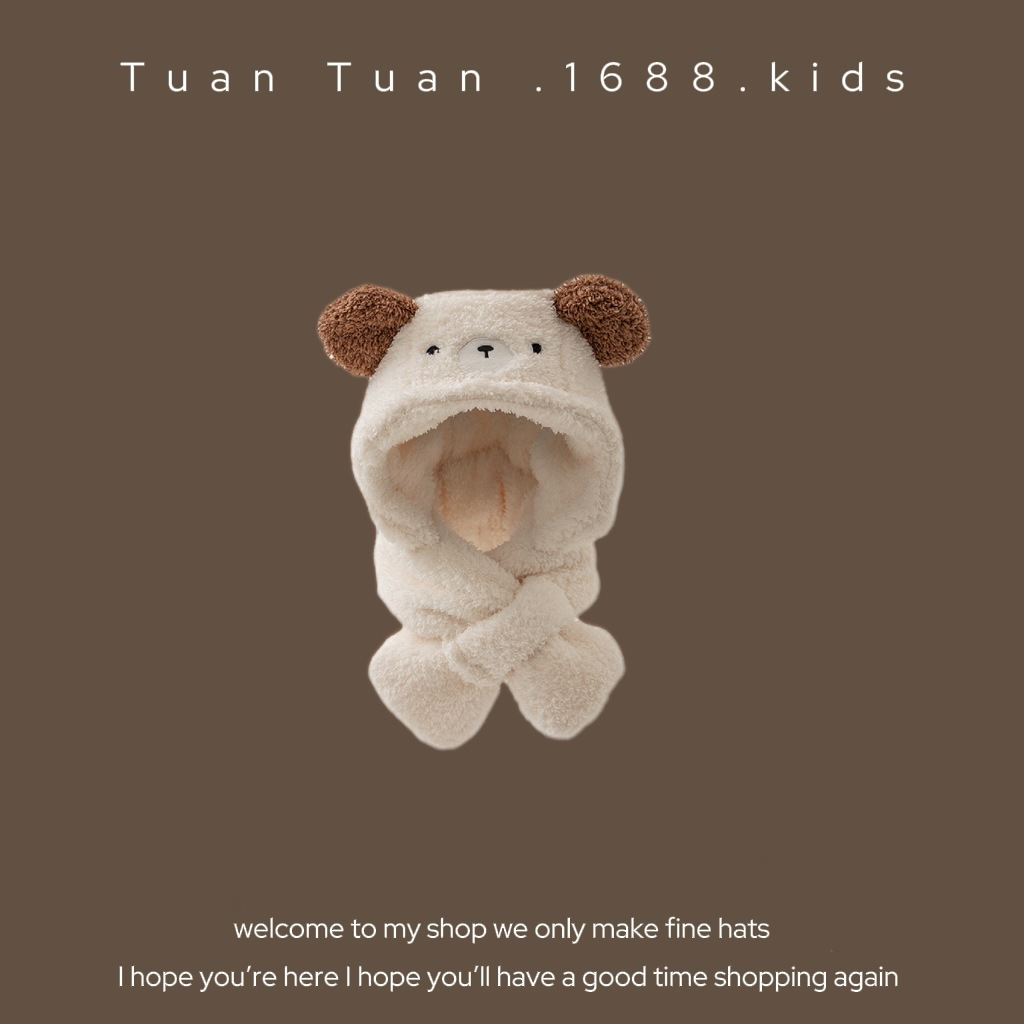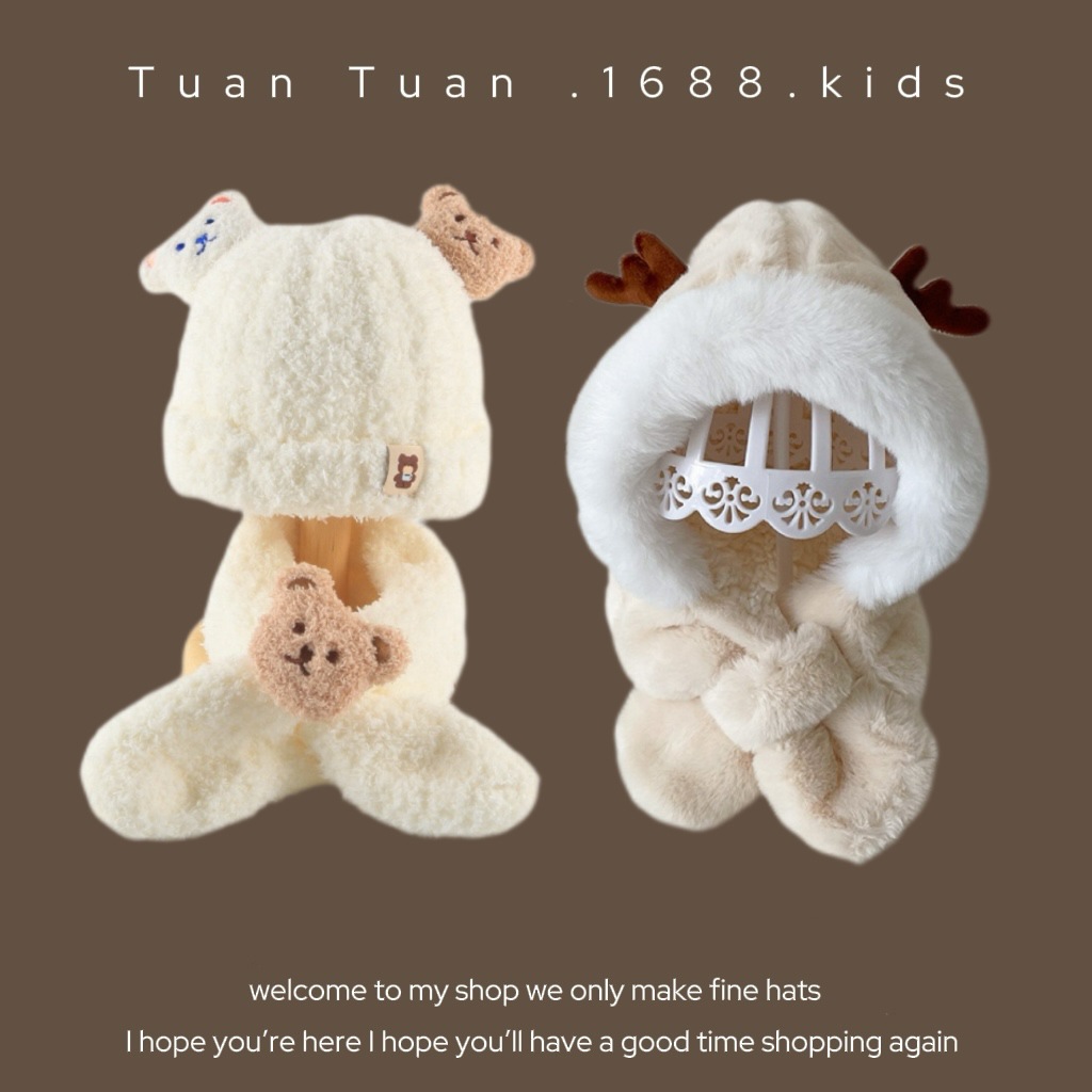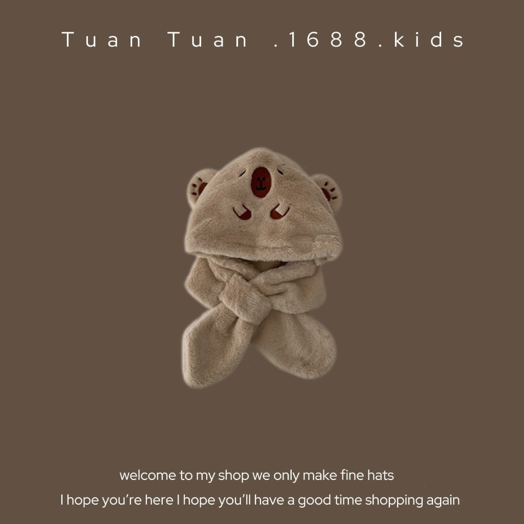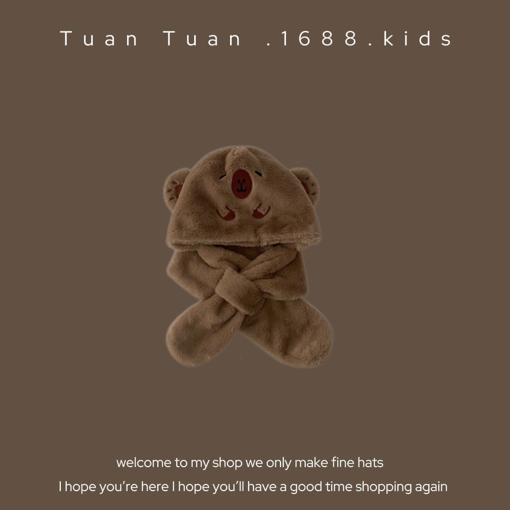 Tuan Tuan ~ ins 어린이 모자와 스카프 소년과 소녀를위한 통합 겨울 만화 봉제 모자 겨울 기모 두껍게스토어 가기