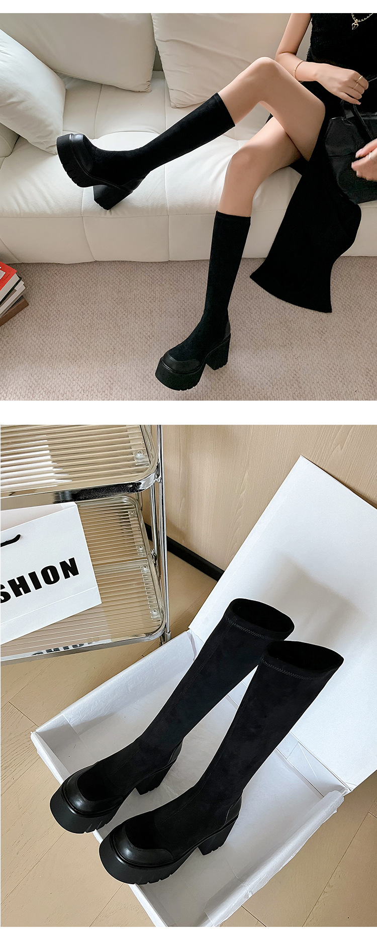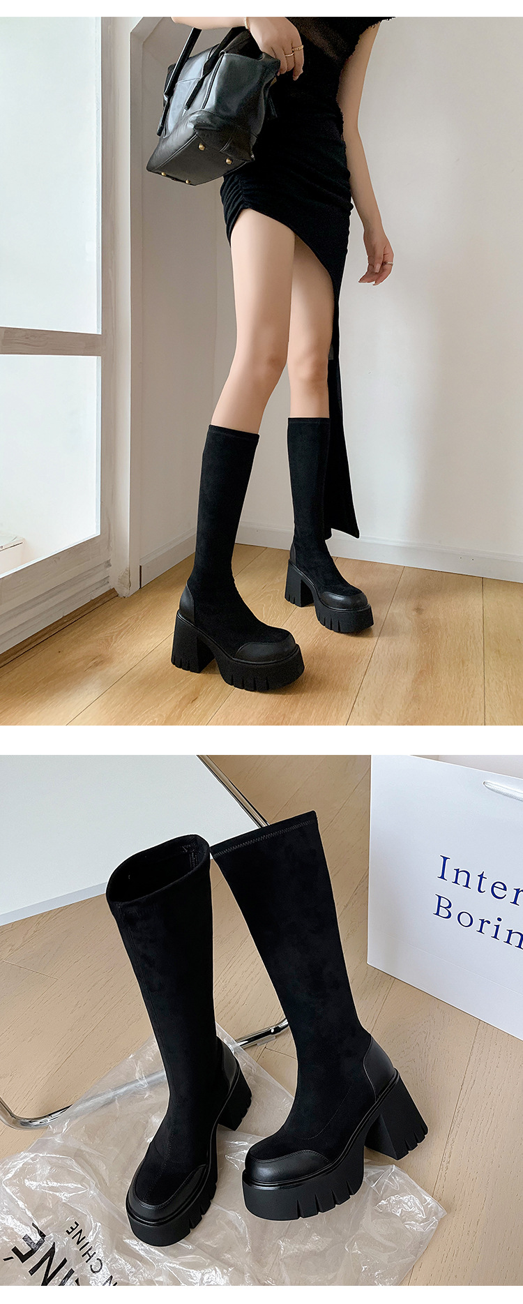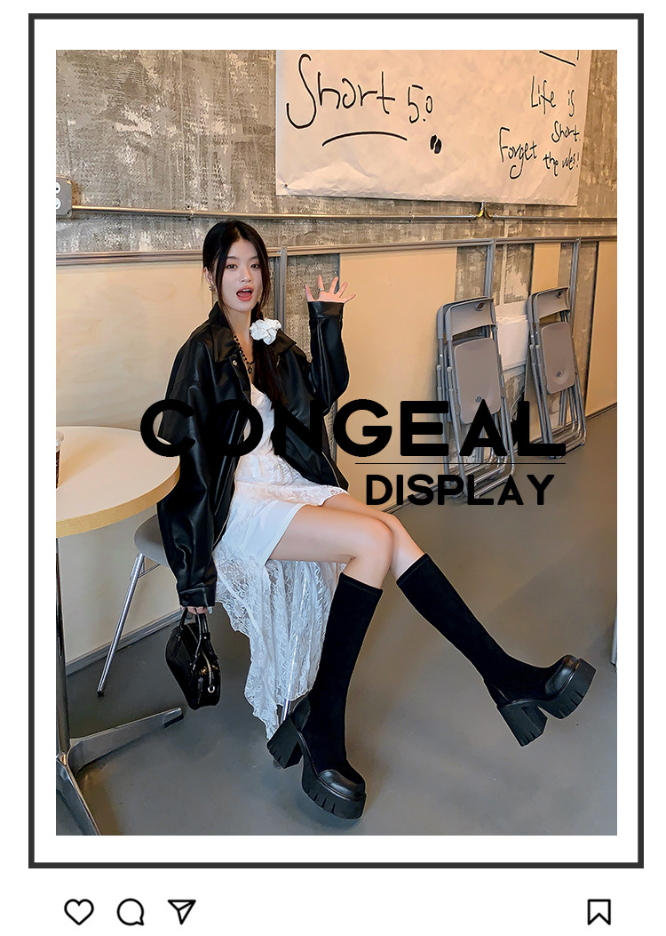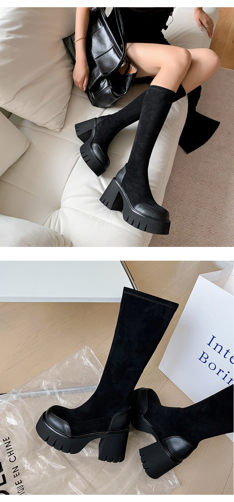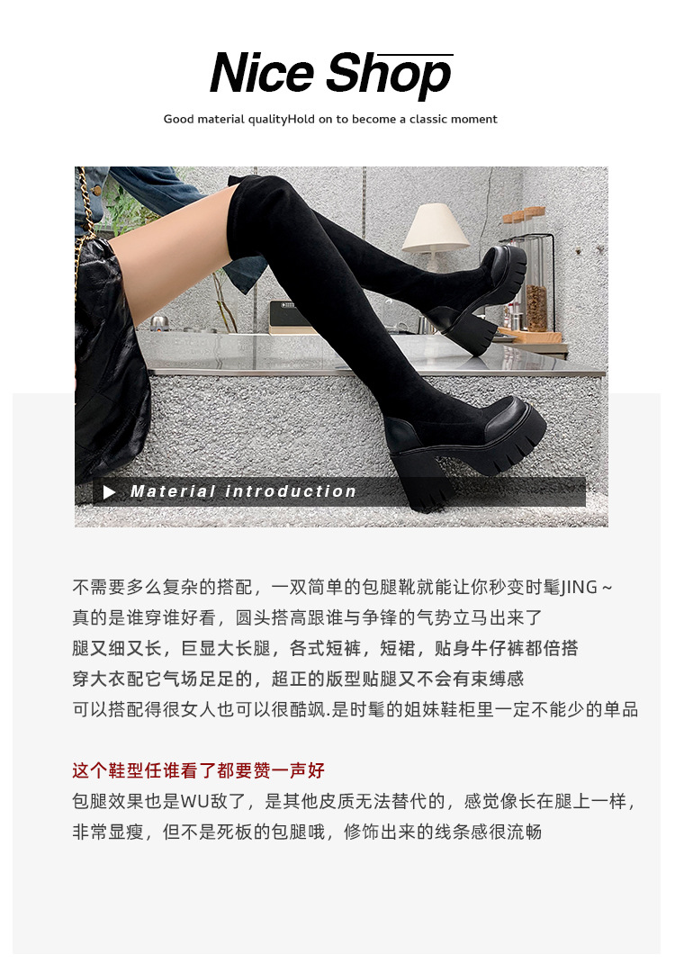 9cm 슈퍼 하이힐 두꺼운 힐 두꺼운 밑창 스트레치 부츠 여성용 가을 및 겨울 빅 튜브 방수 테이블 얇은 부츠 기모 무릎 위 부츠스토어 가기