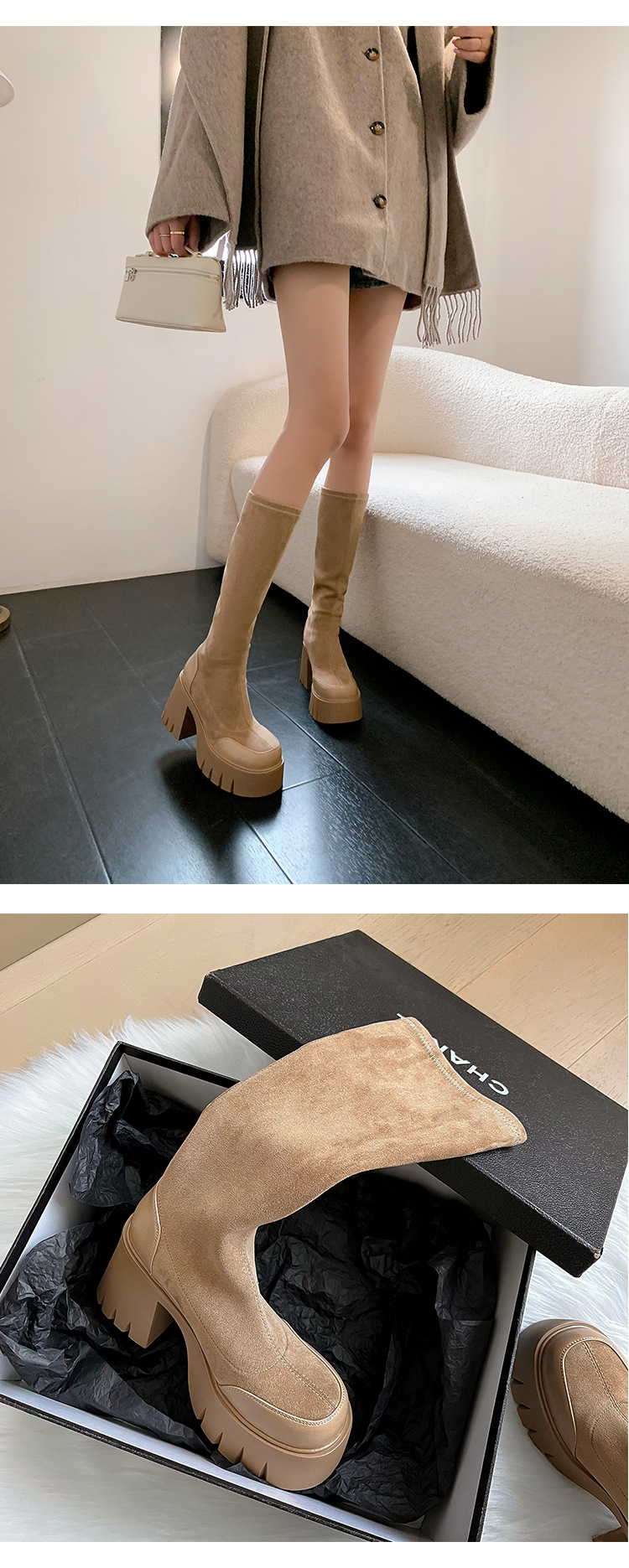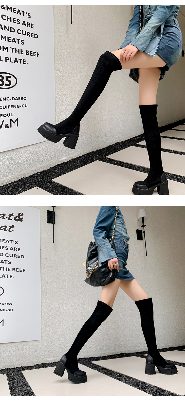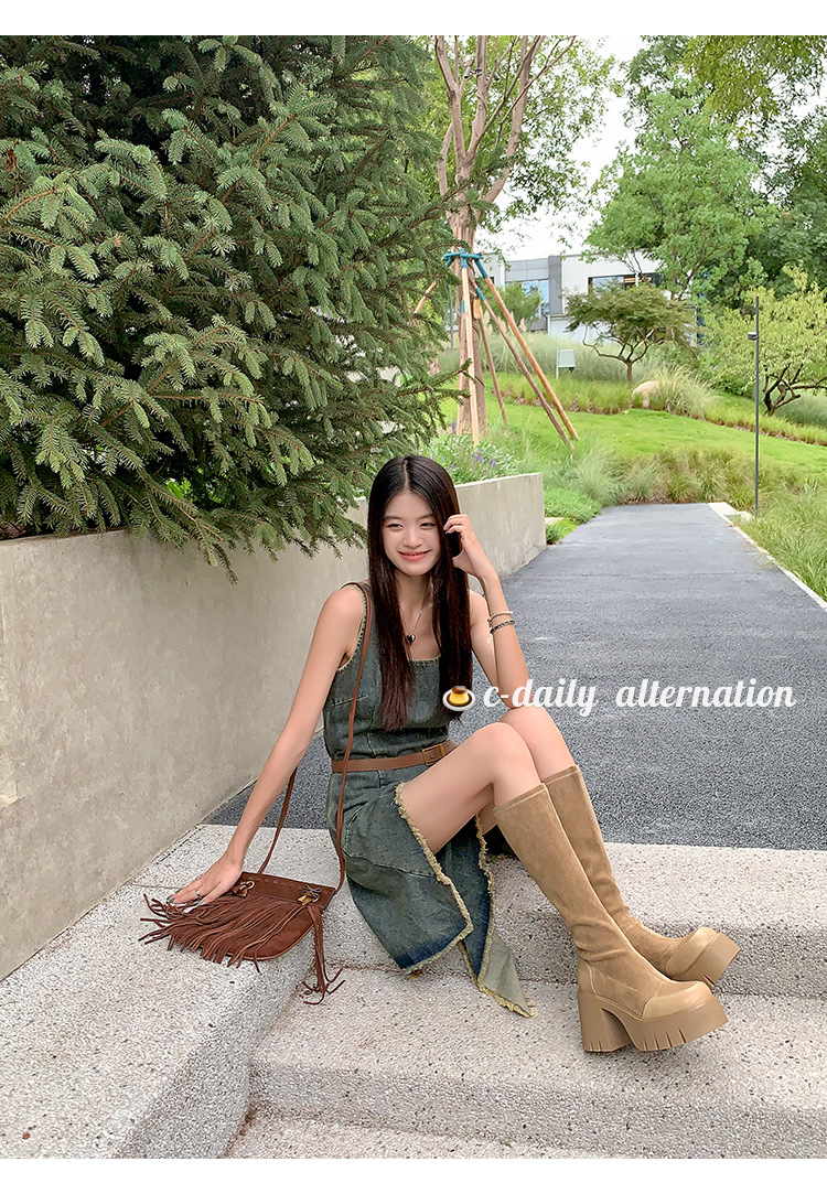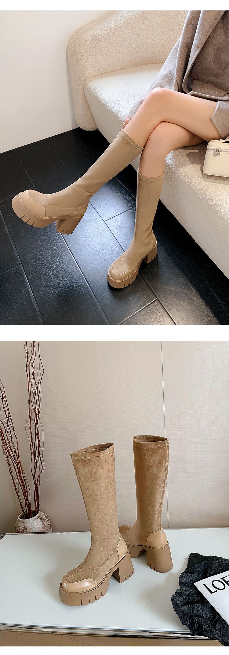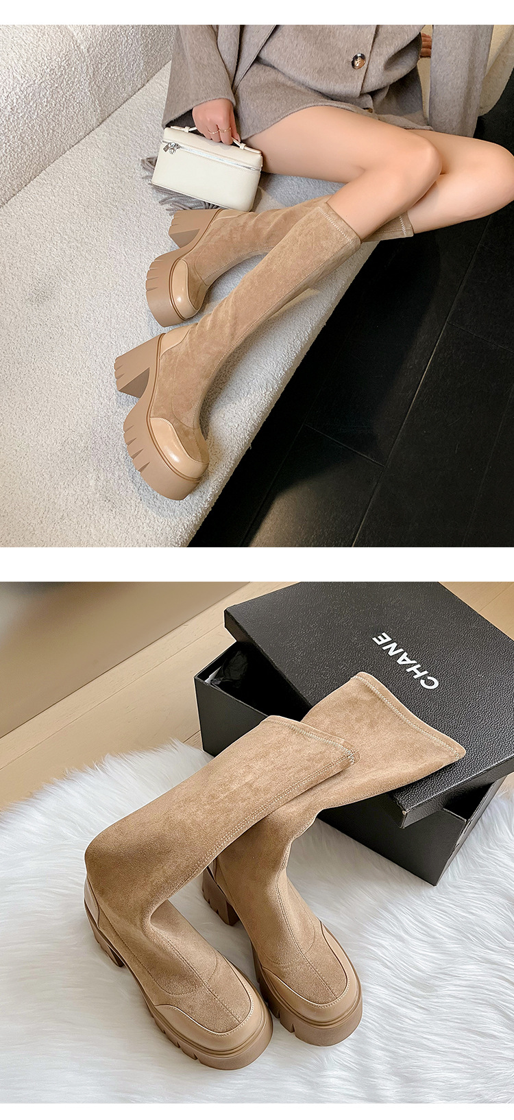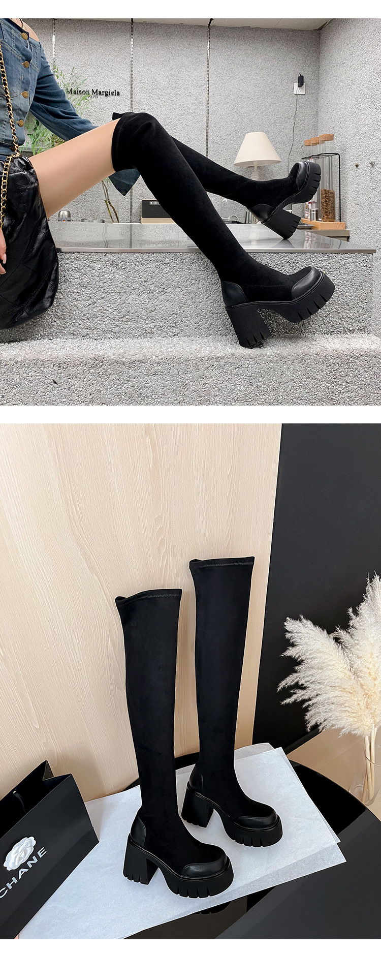9cm 슈퍼 하이힐 두꺼운 힐 두꺼운 밑창 스트레치 부츠 여성용 가을 및 겨울 빅 튜브 방수 테이블 얇은 부츠 기모 무릎 위 부츠스토어 가기