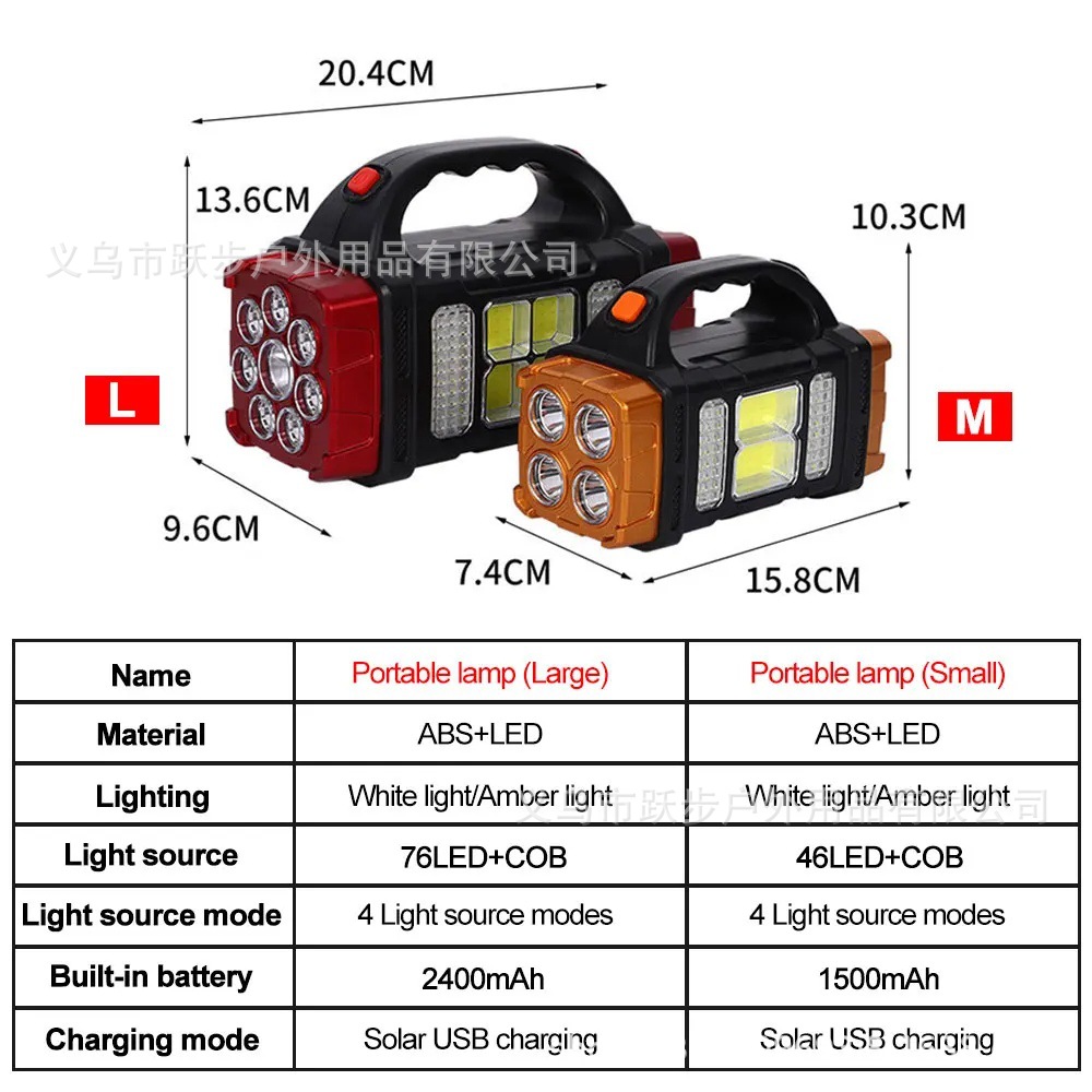 다기능 COB 야외 비상 휴대용 탐조등 태양 USB 충전식 캠핑 야외 조명 손전등