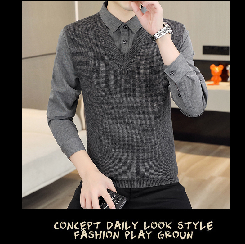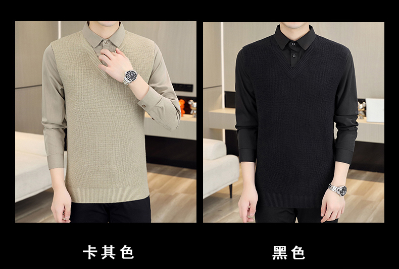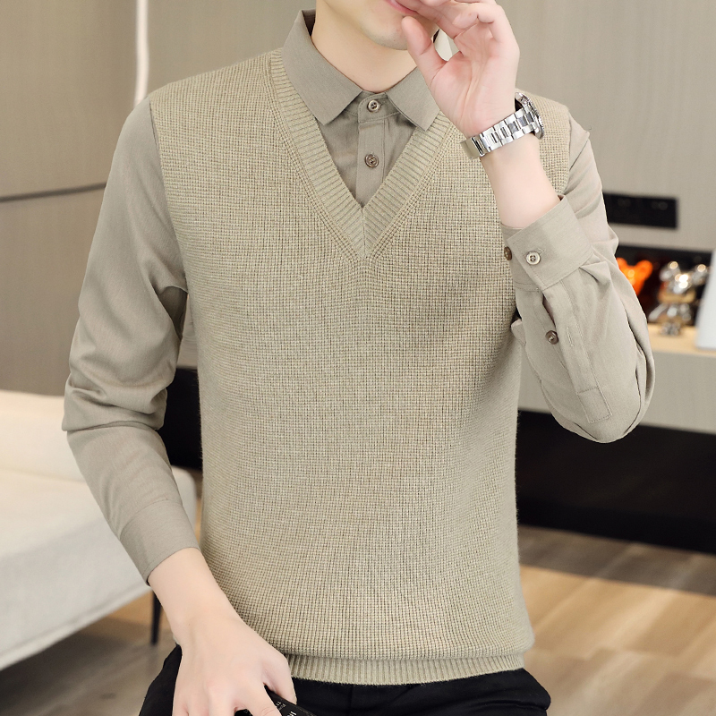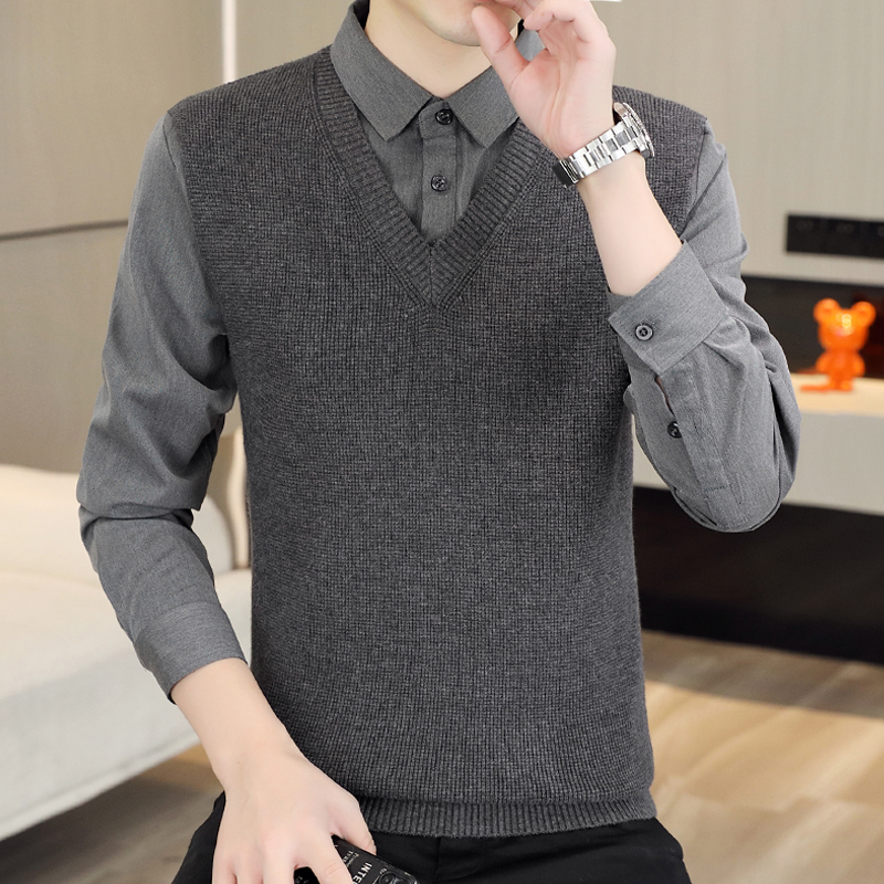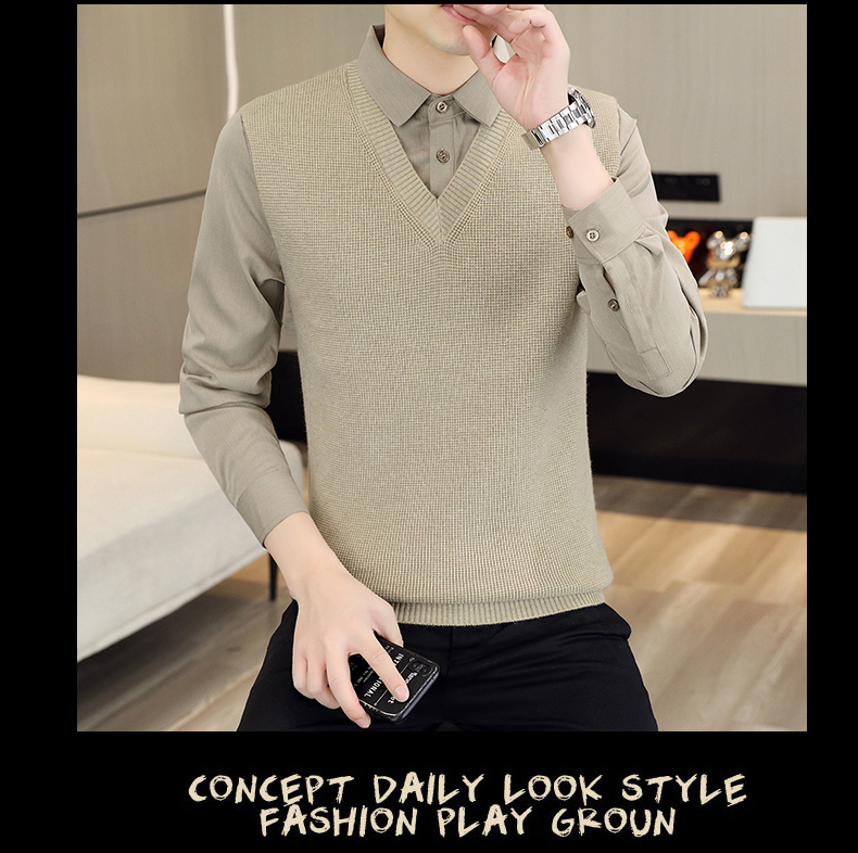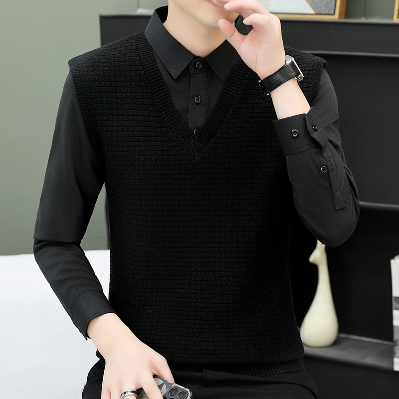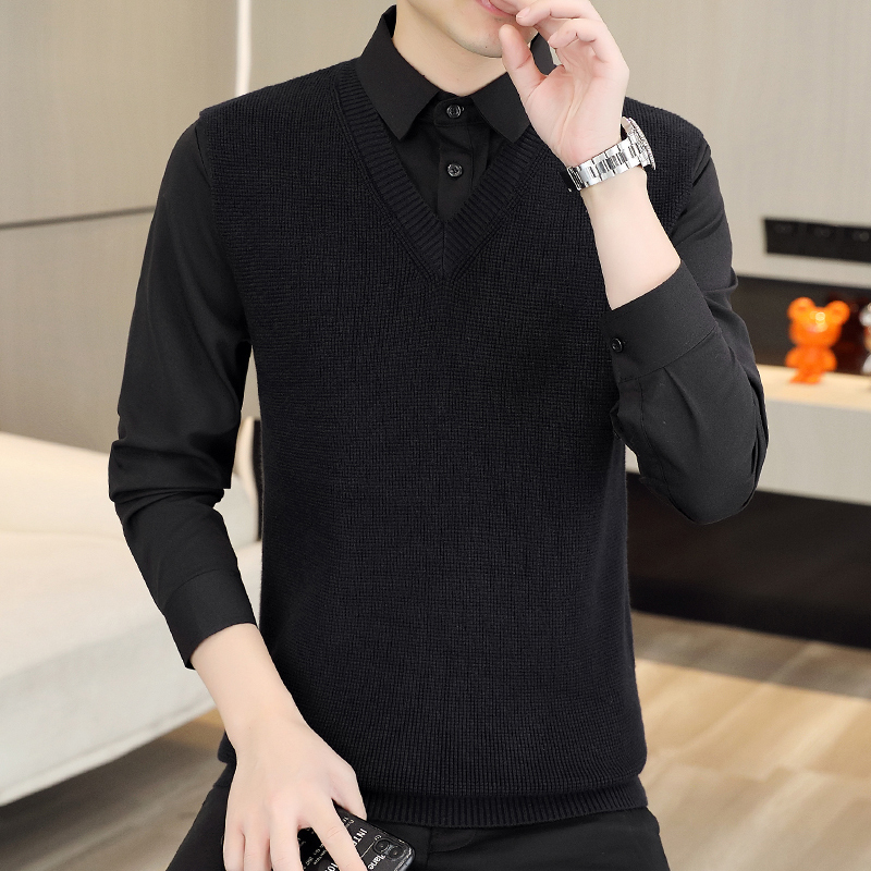 하이 엔드 가짜 투피스 스웨터 남자의 가을과 겨울 따뜻한 셔츠 칼라 스웨터 겨울 내베이스 니트 탑