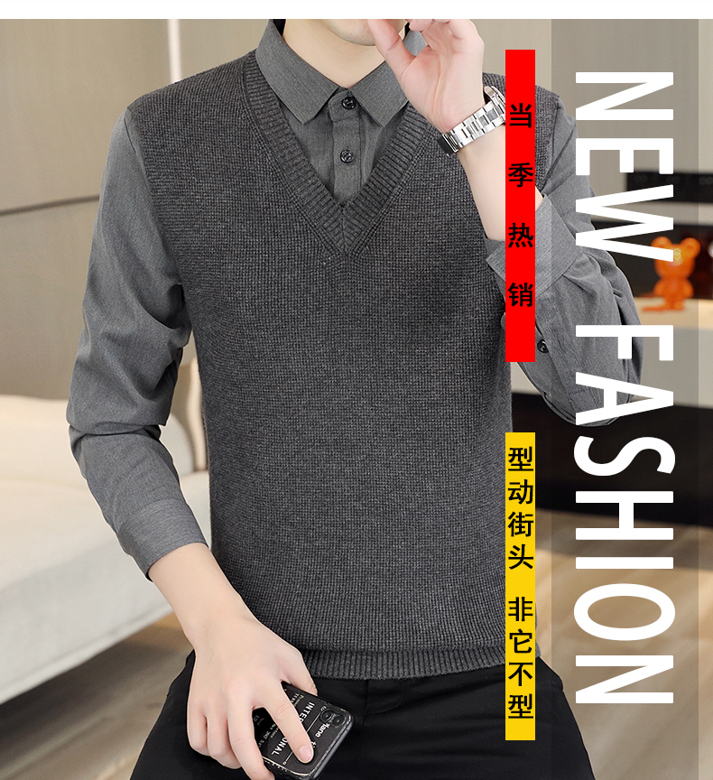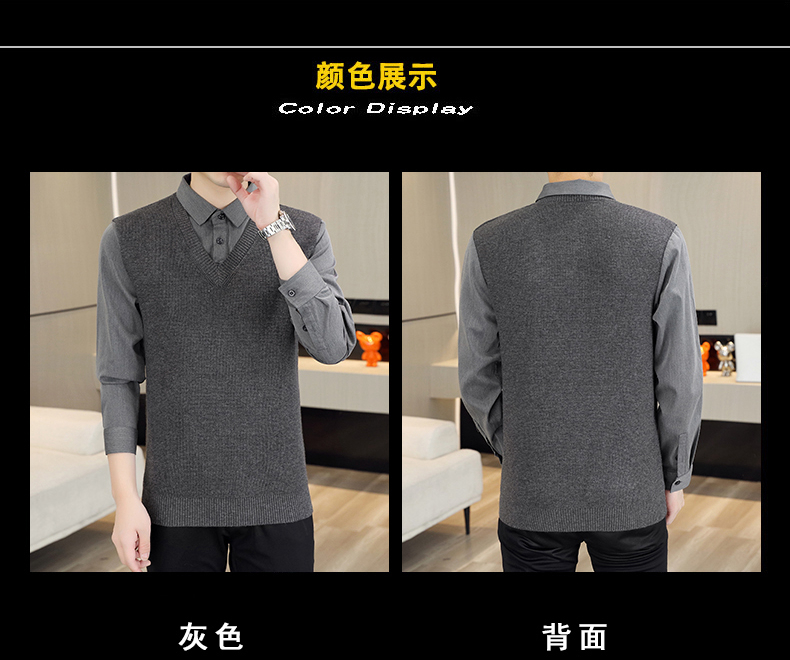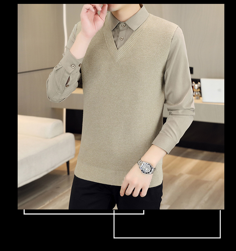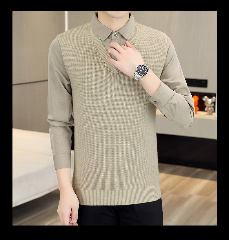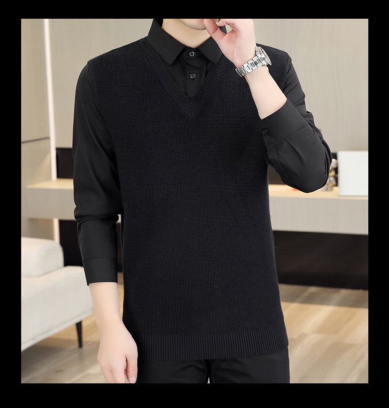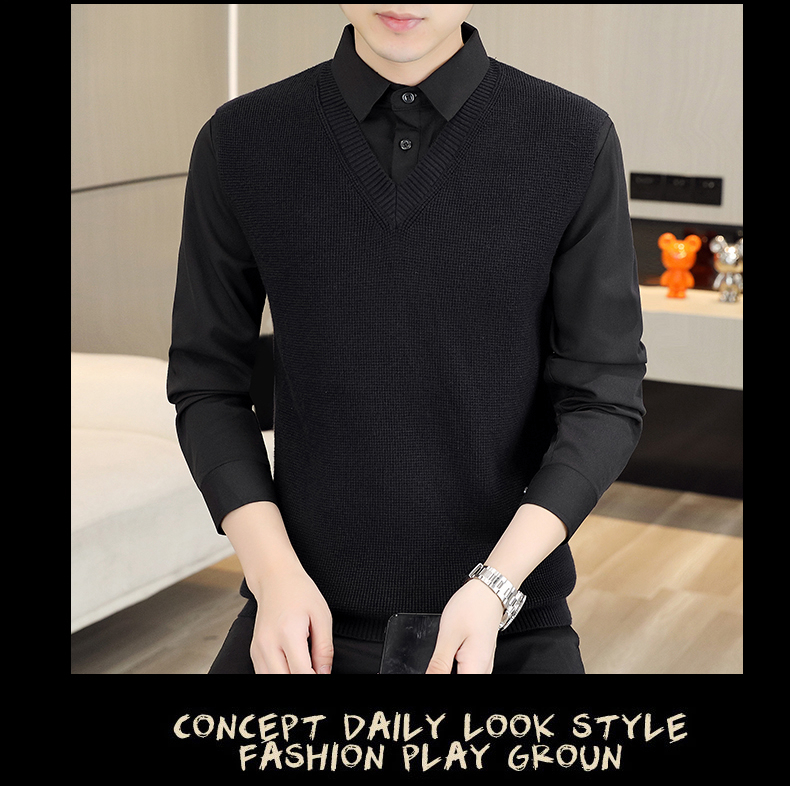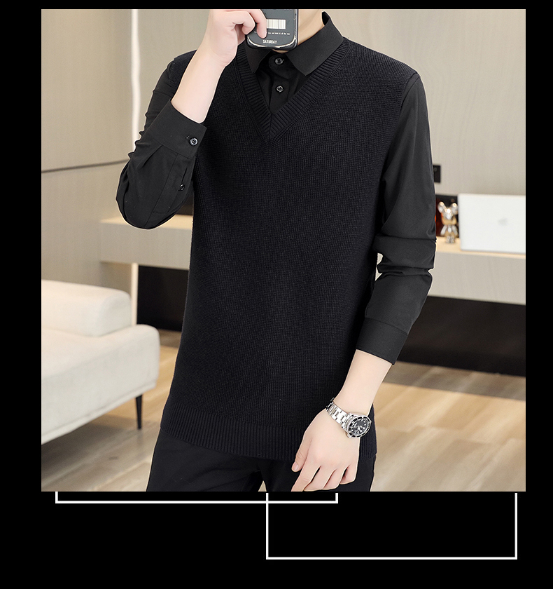 하이 엔드 가짜 투피스 스웨터 남자의 가을과 겨울 따뜻한 셔츠 칼라 스웨터 겨울 내베이스 니트 탑