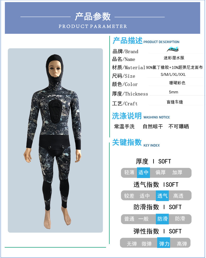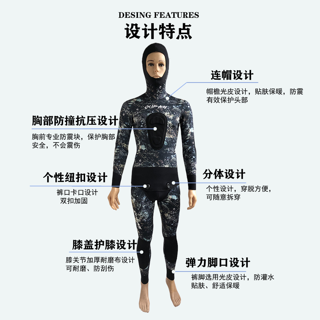 네오프렌 다이빙 슈트 5MM 위장 무늬 투피스 세트 후드 방한 보온 두꺼운 다이빙복