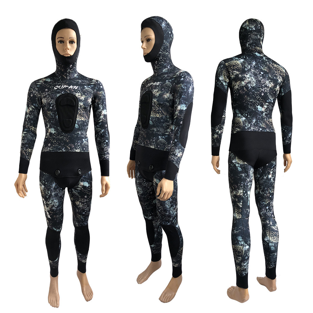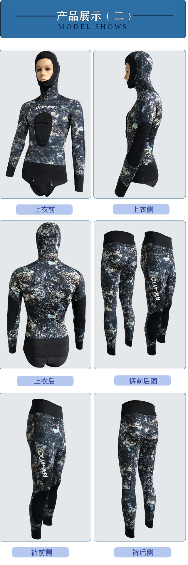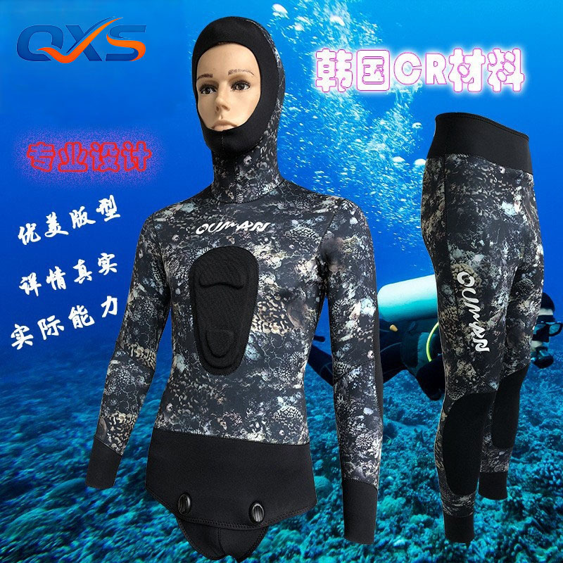 네오프렌 다이빙 슈트 5MM 위장 무늬 투피스 세트 후드 방한 보온 두꺼운 다이빙복스토어 가기