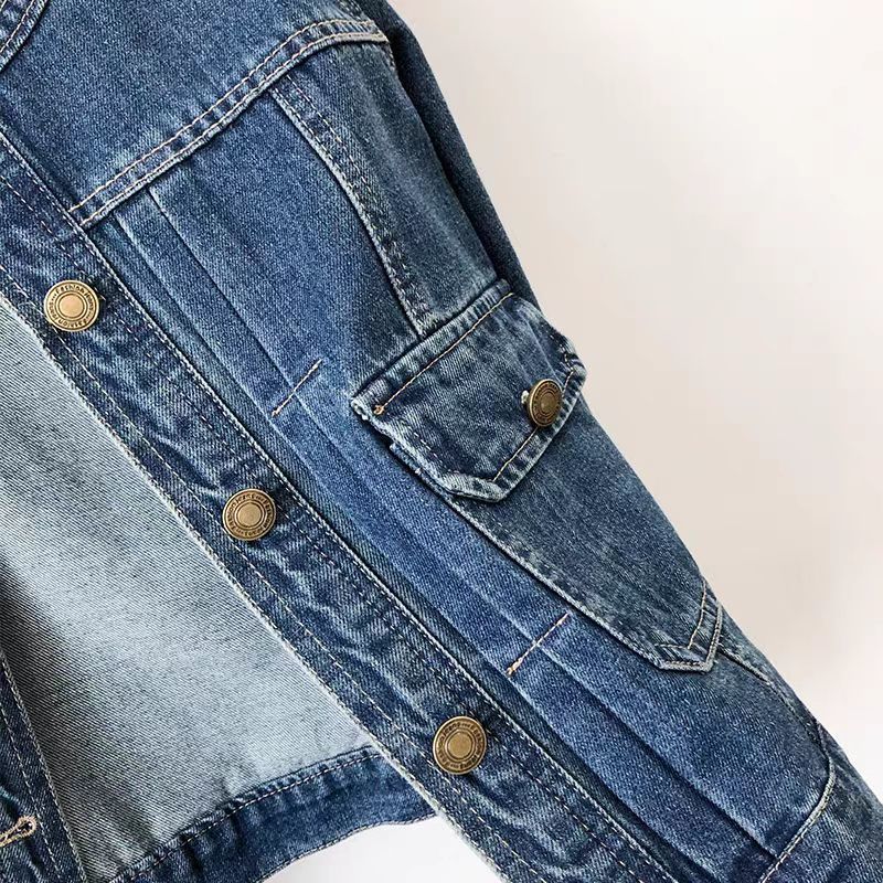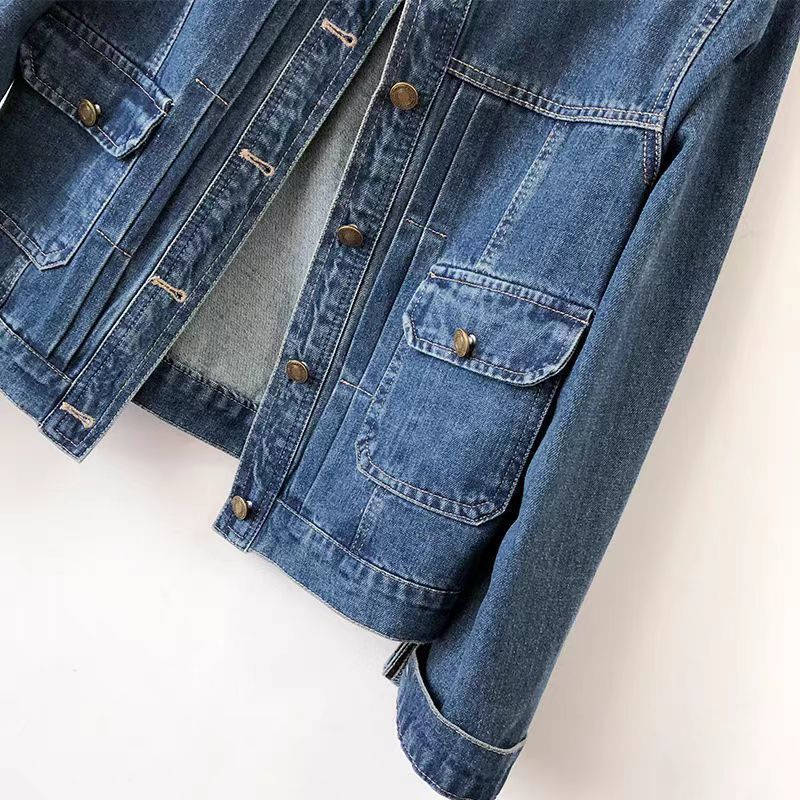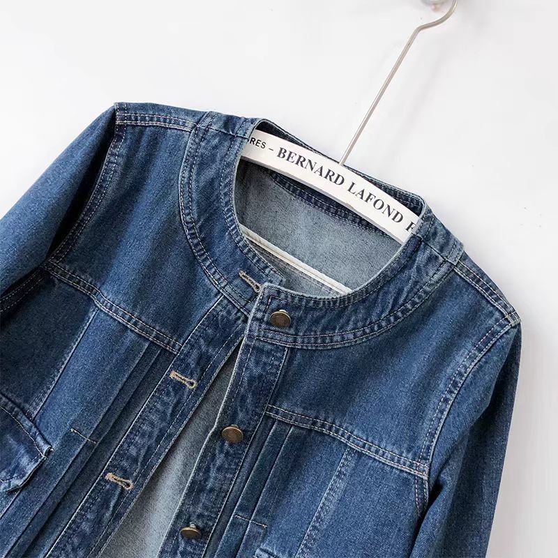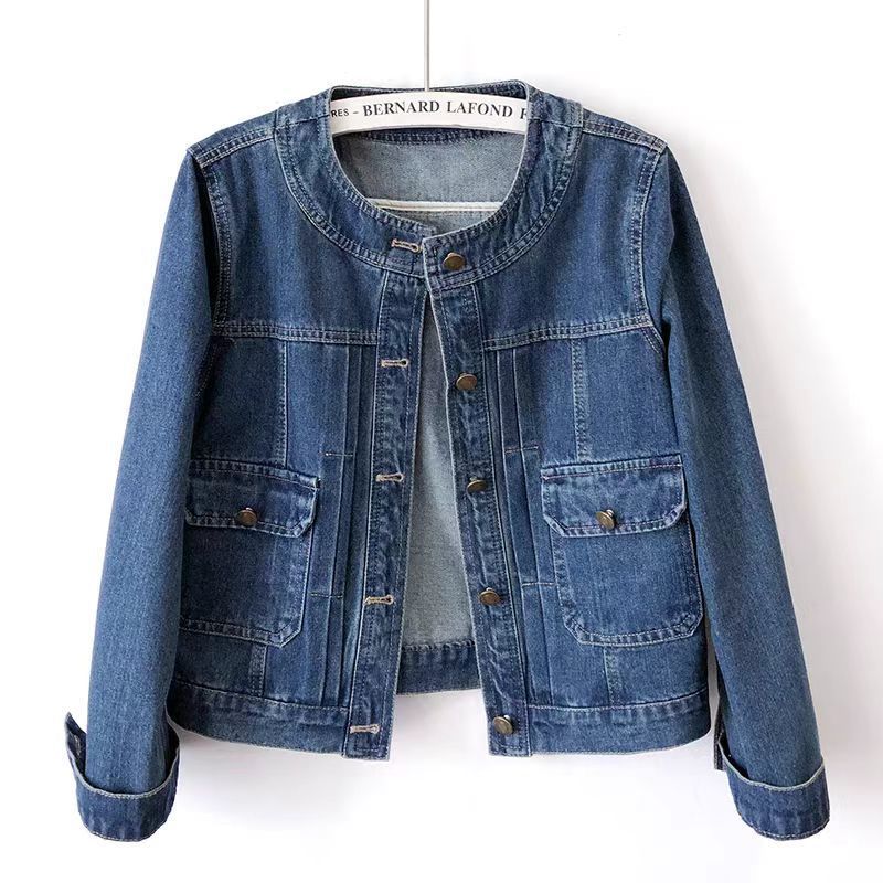 크루 넥 주름 블루 데님 코트 여성의 짧은 봄과 가을 2024 긴팔 어깨 슬림 핏 슬리밍 캐주얼 자켓스토어 가기