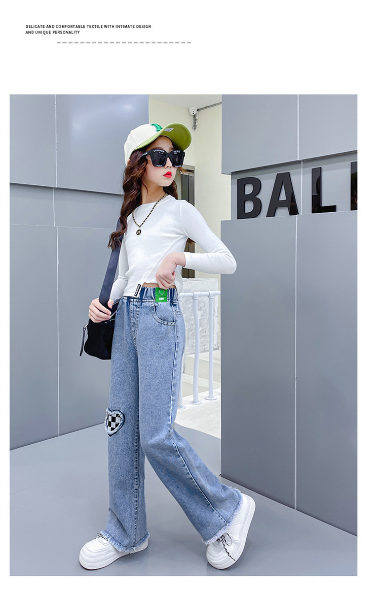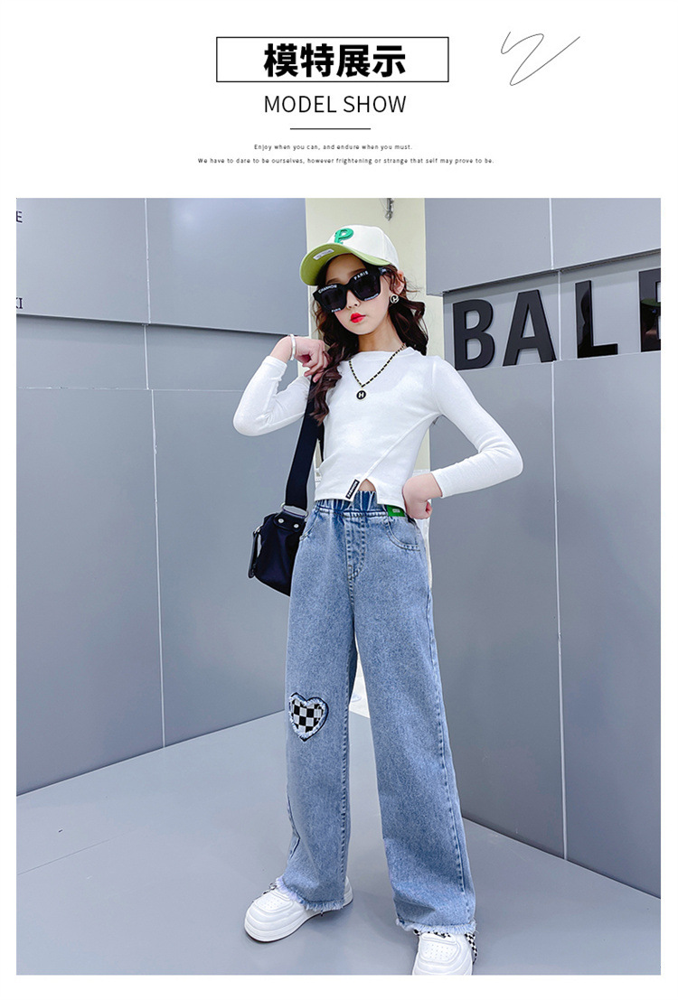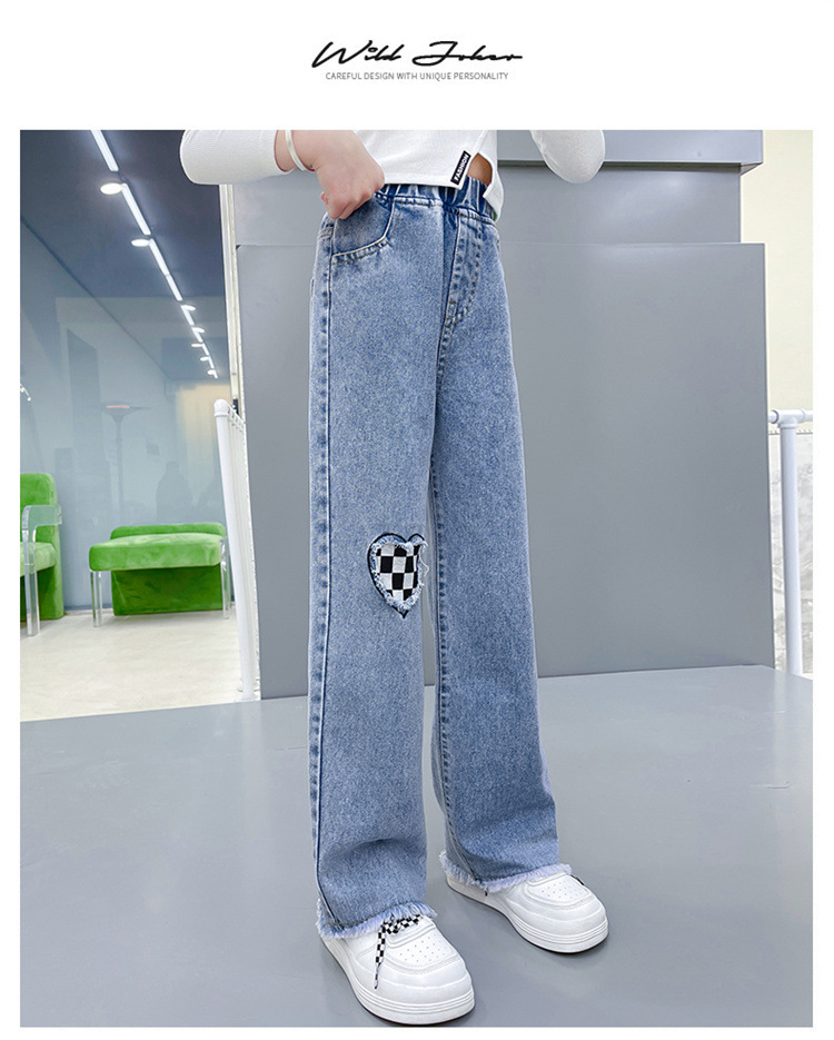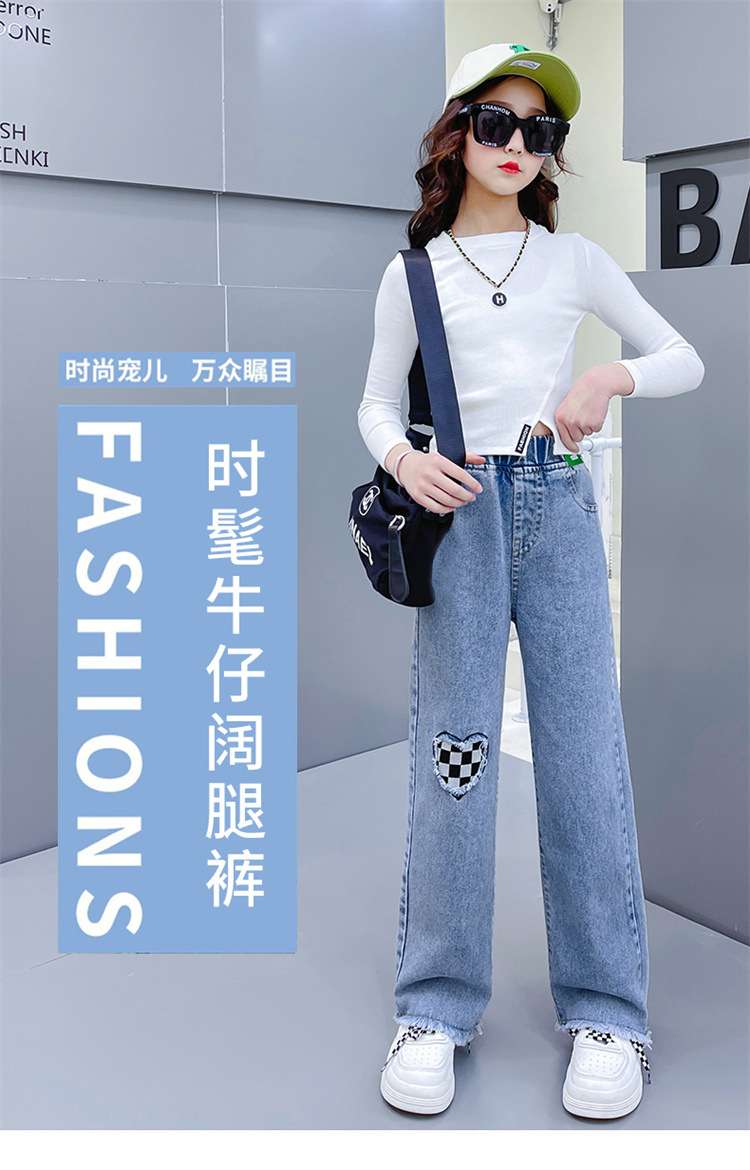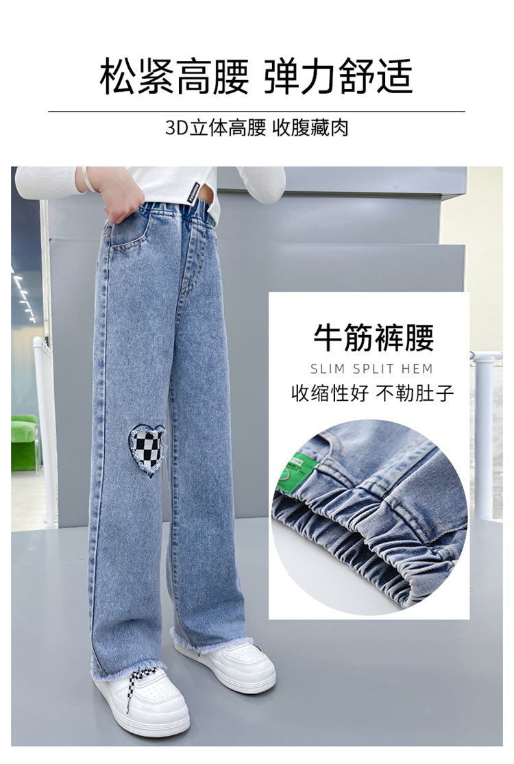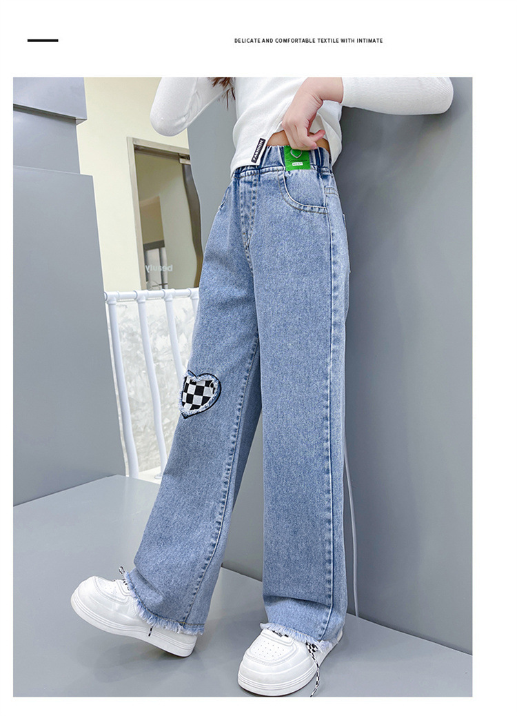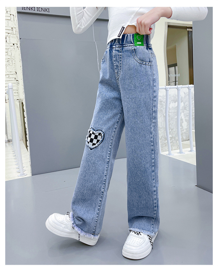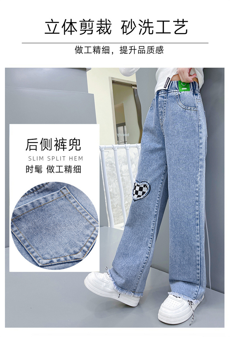 여아용 와이드 데님 팬츠 봄 가을 2025 아동복 도매 인기 트렌드 중대형 아동 바지 스트레이트 팬츠 체크무늬스토어 가기